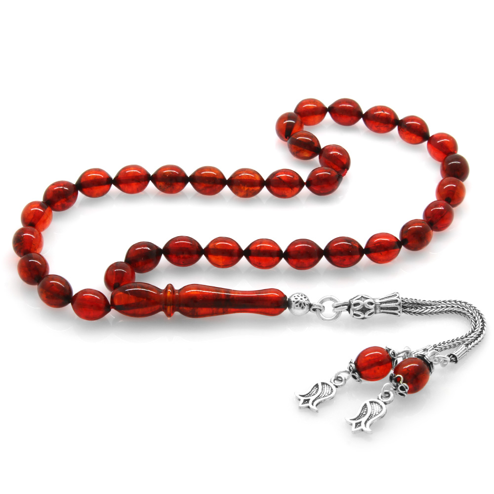 925 Ayar Gümüş Püsküllü Arpa Kesim Hareli Soft Kırmızı Damla Kehribar Tesbih - 1