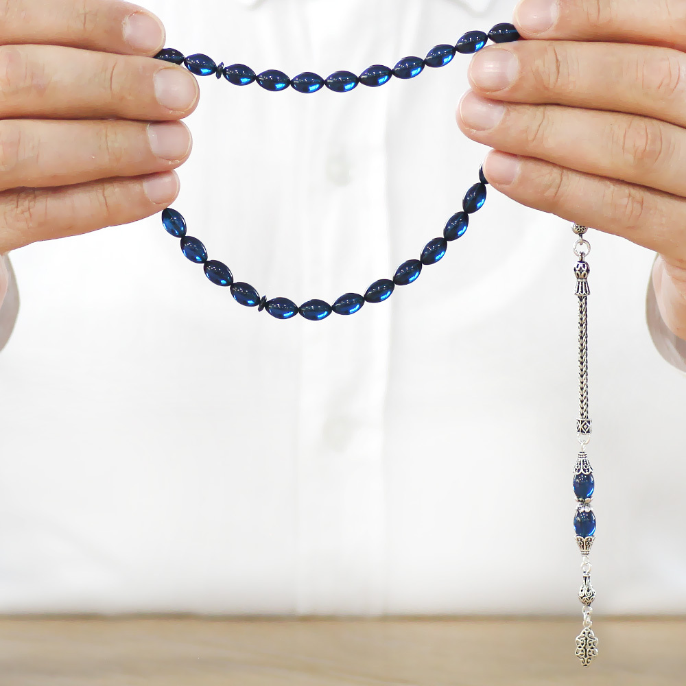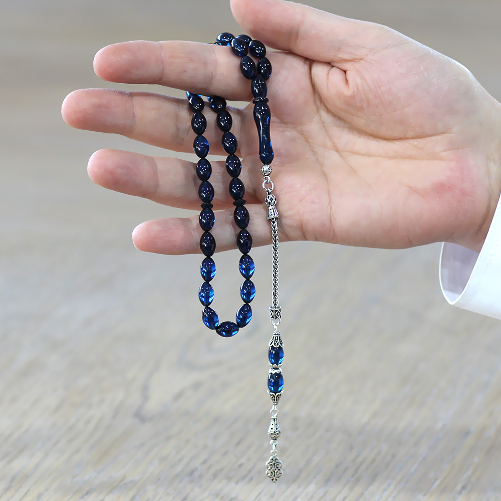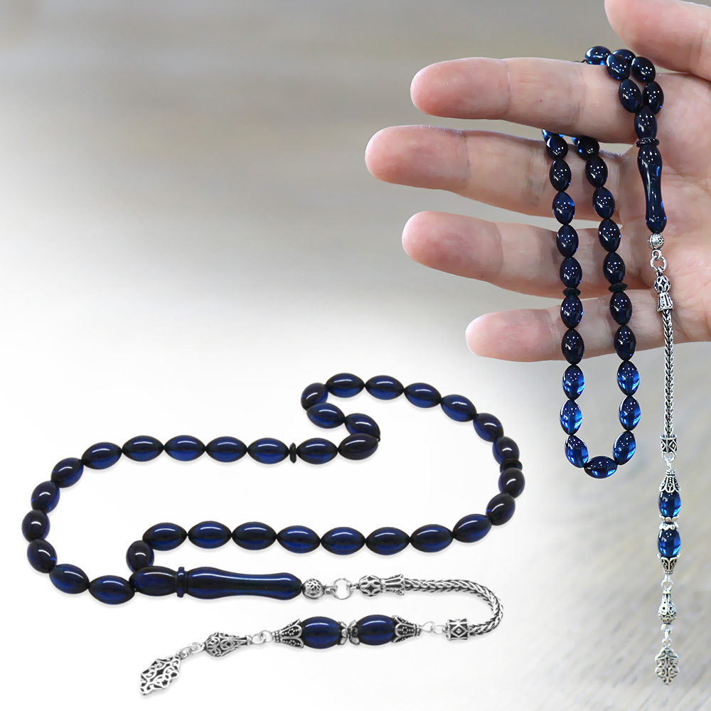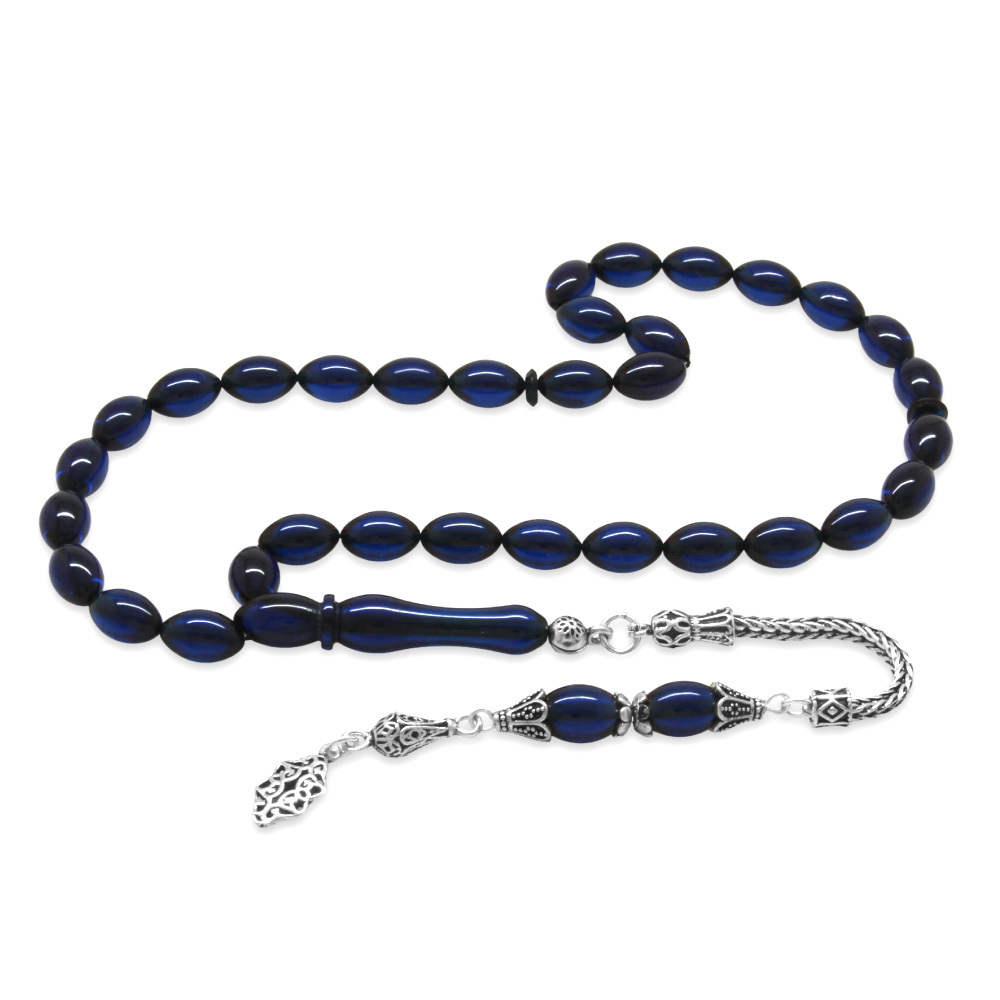 925 Ayar Gümüş Püsküllü Arpa Kesim Lacivert Sıkma Kehribar Tesbih