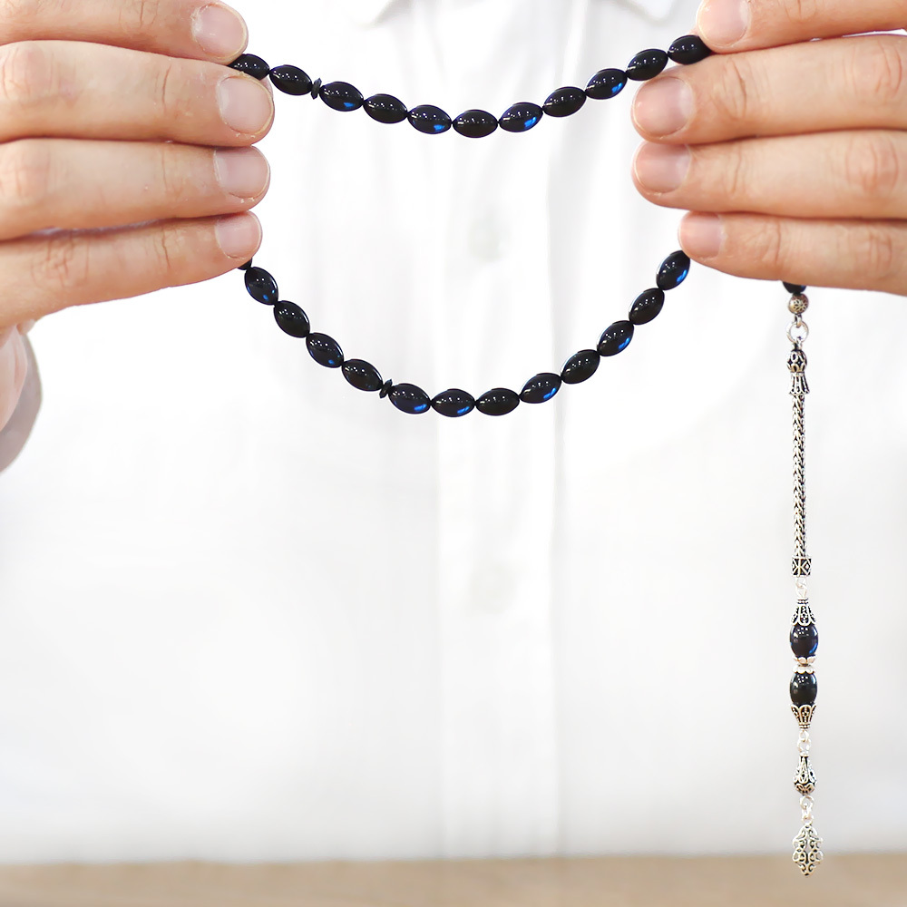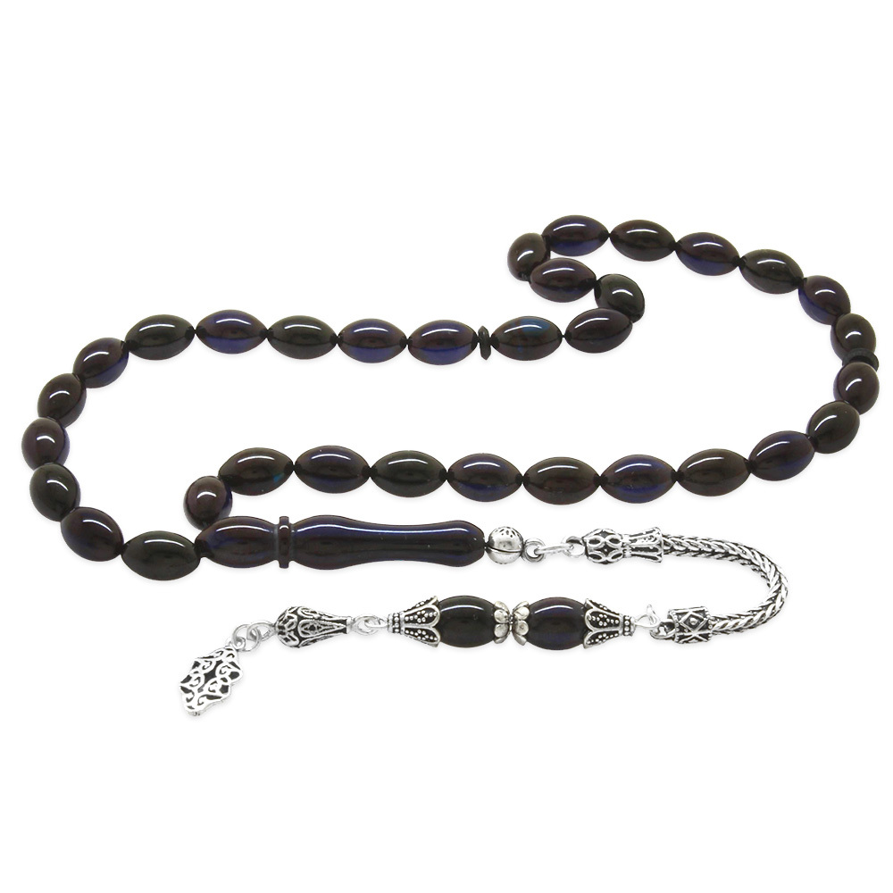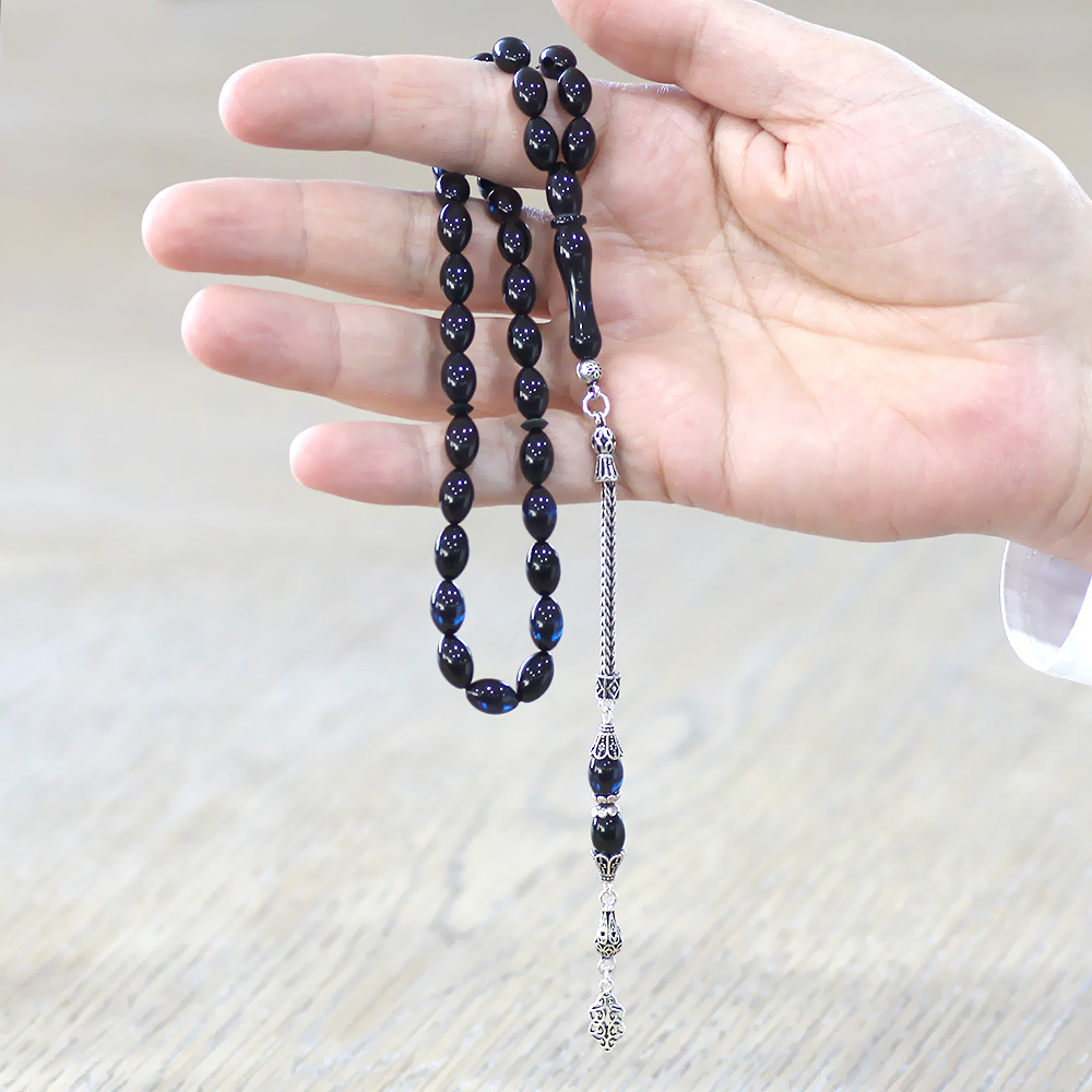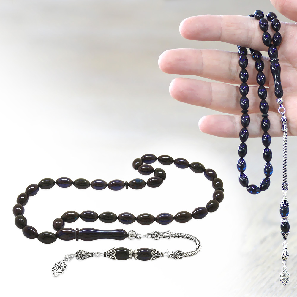 925 Ayar Gümüş Püsküllü Arpa Kesim Mavi Siyah Sıkma Kehribar Tesbih