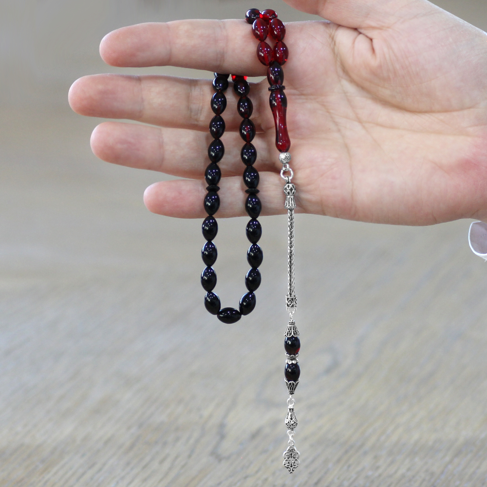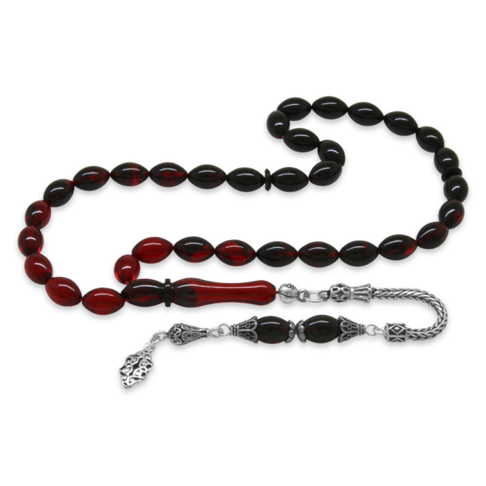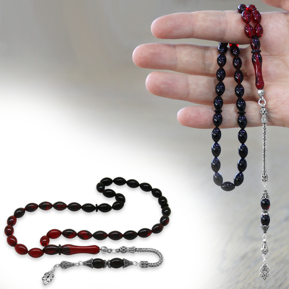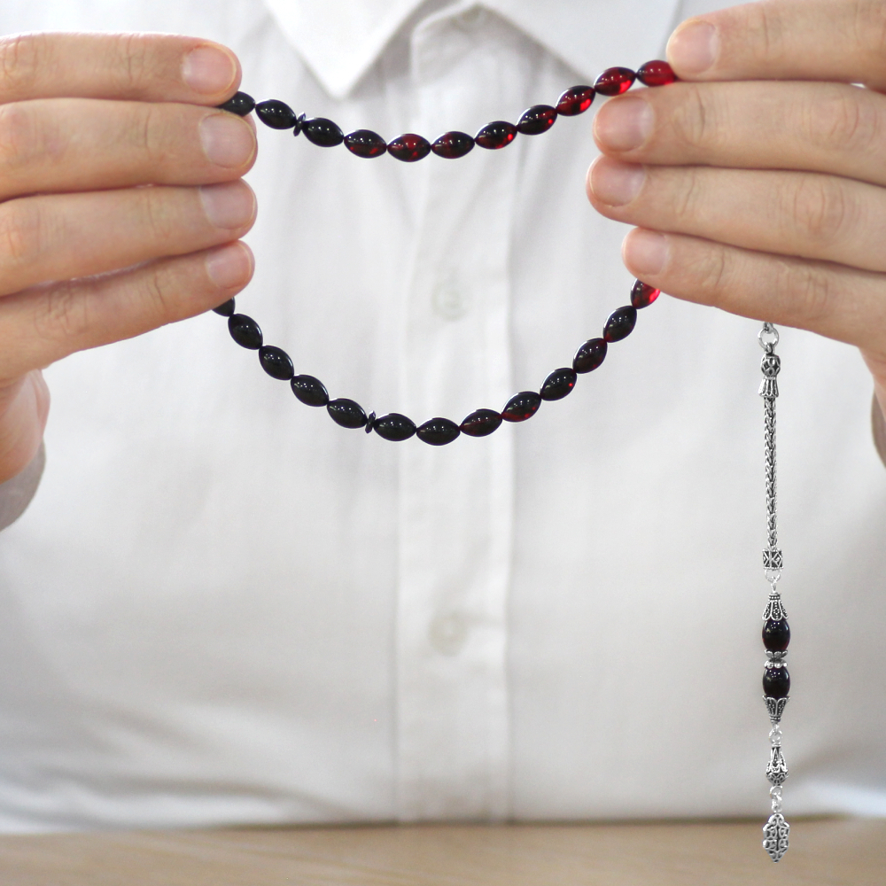 925 Ayar Gümüş Püsküllü Arpa Kesim Süzme Kırmızı Siyah Ateş Kehribar Tesbih