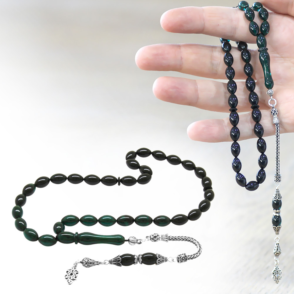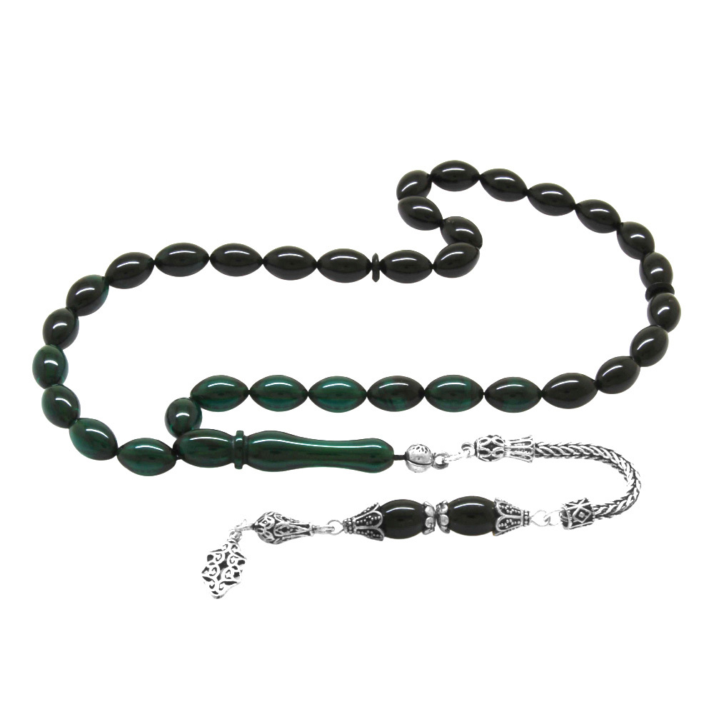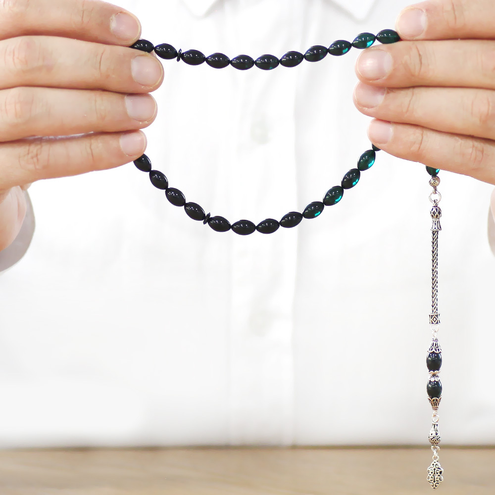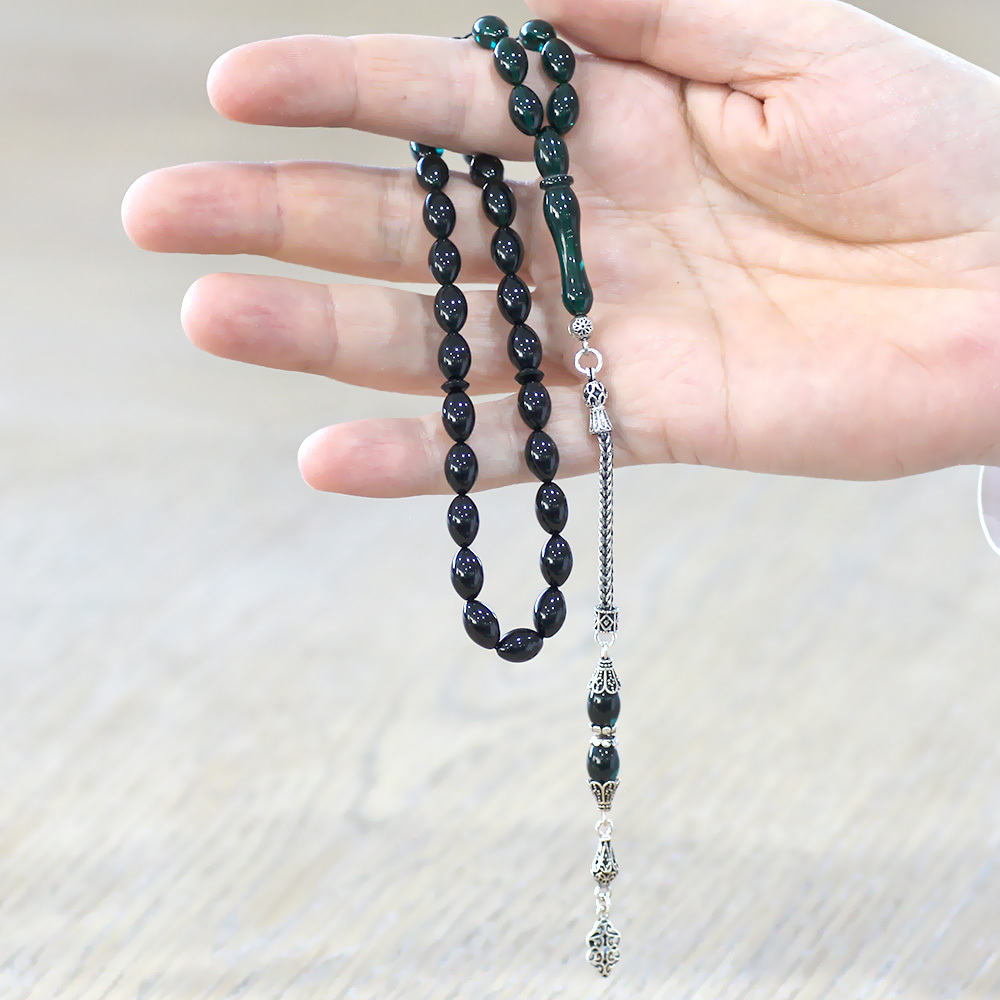 925 Ayar Gümüş Püsküllü Arpa Kesim Süzme Turkuaz Siyah Ateş Kehribar Tesbih