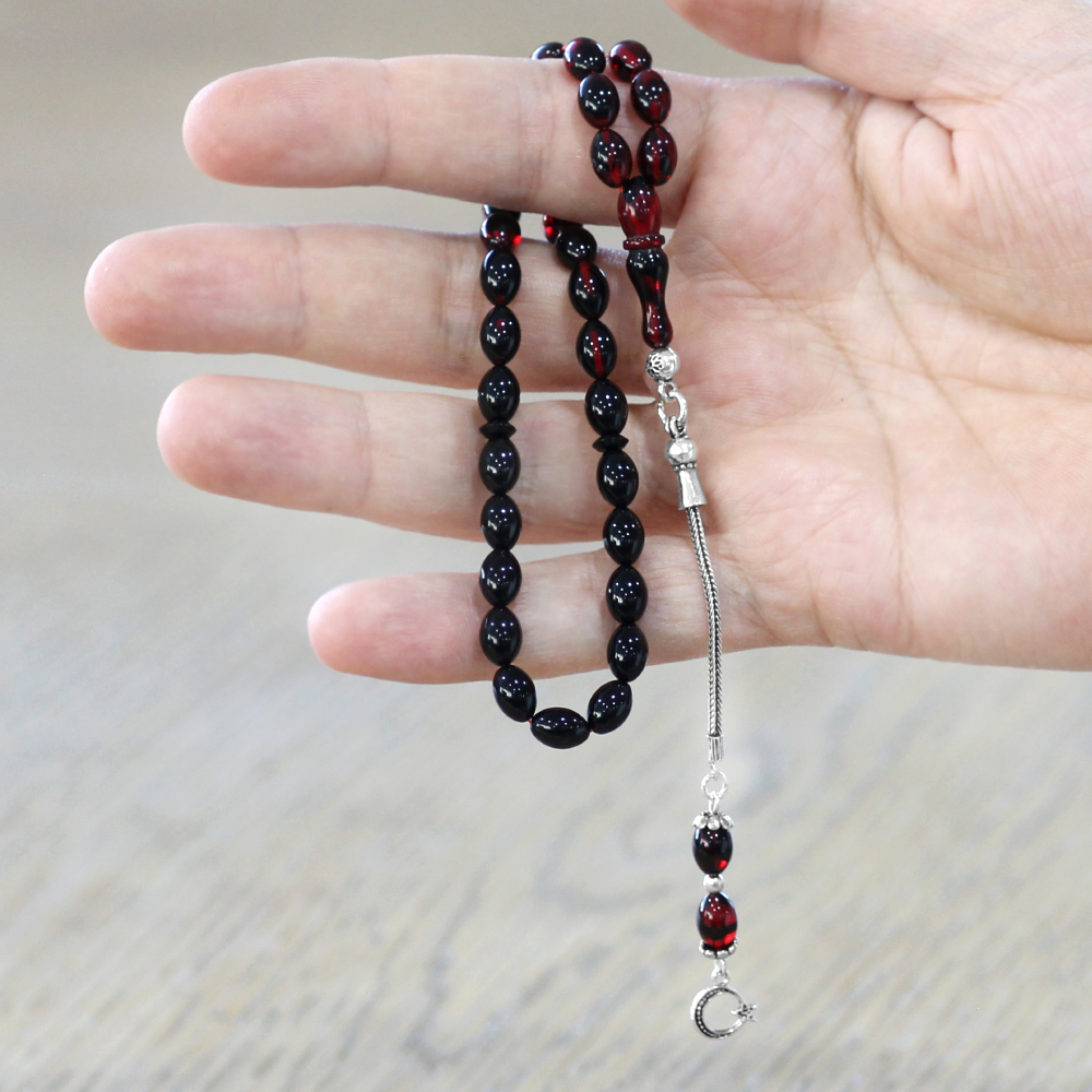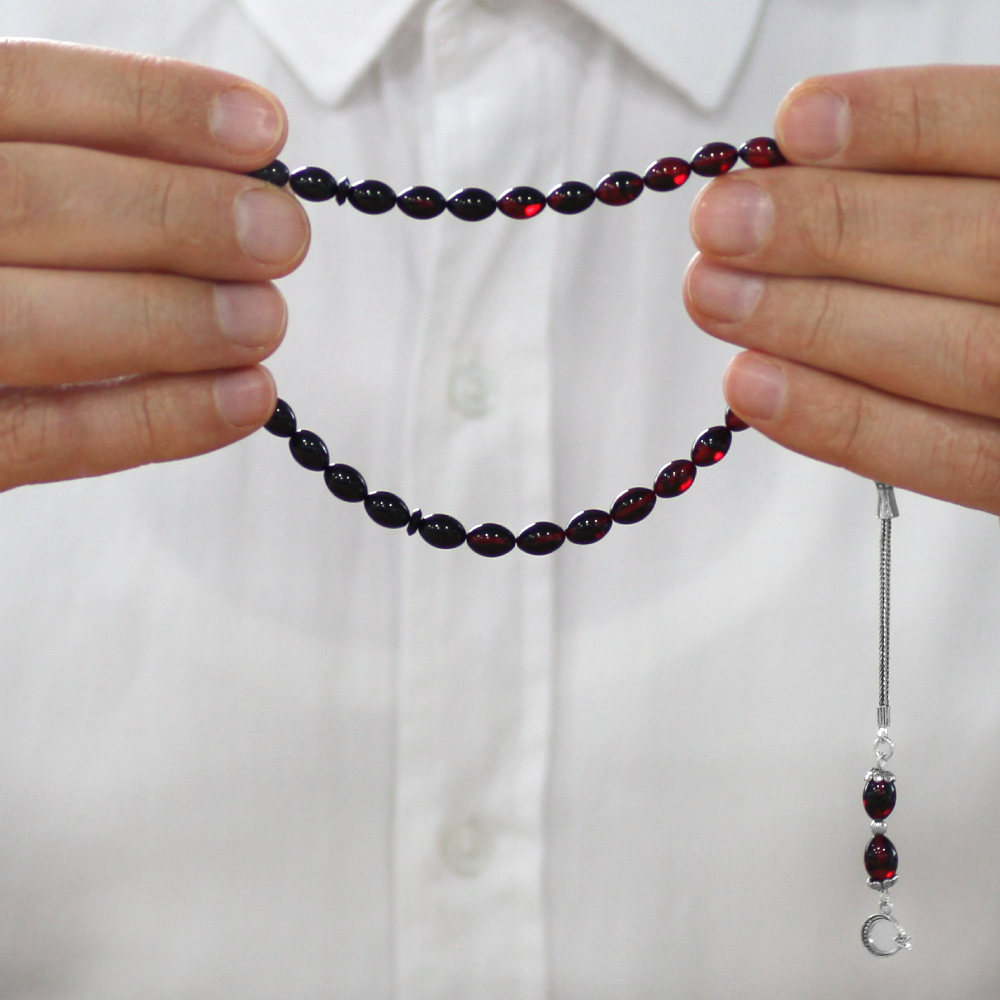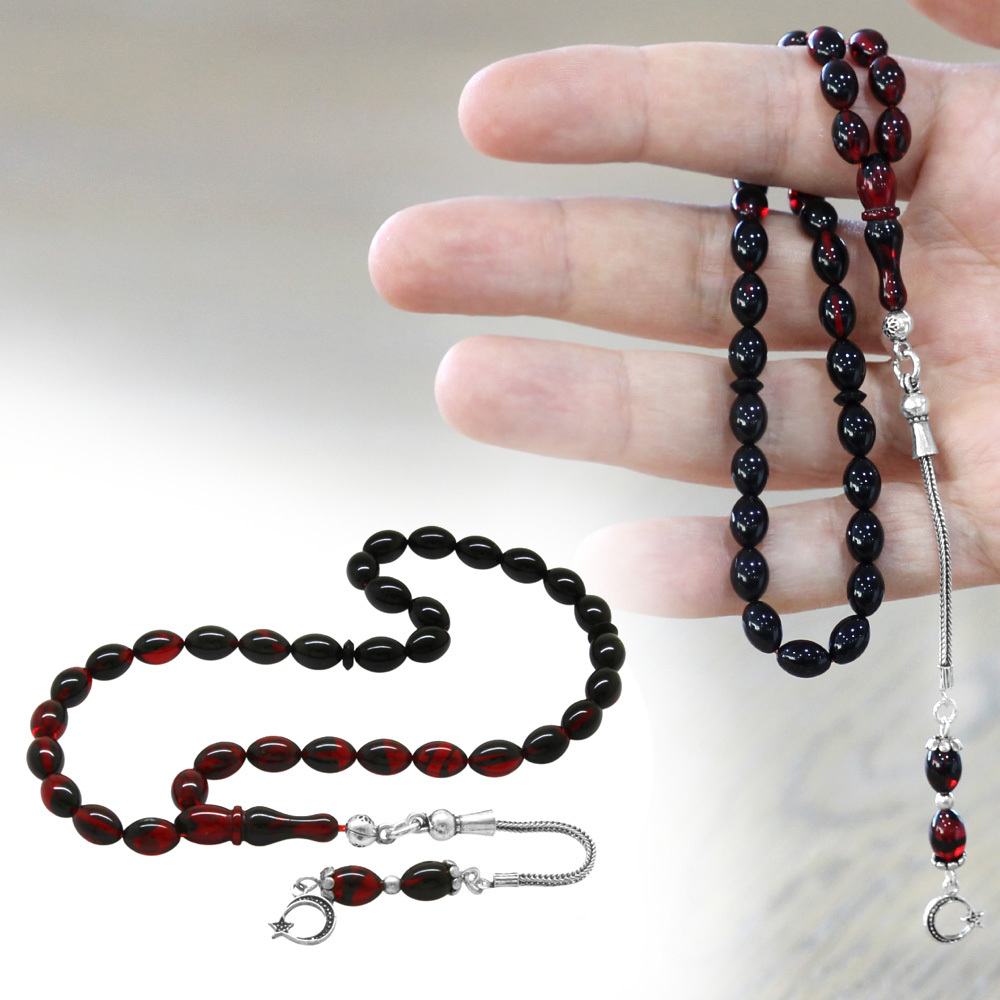 Ateş Kehribar Tesbih - 925 Ayar Gümüş Püsküllü - Süzme Kırmızı Siyah Renk - Bilek Boy - Arpa Kesim