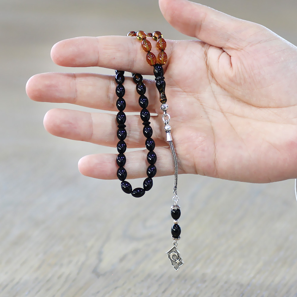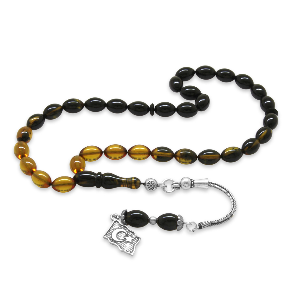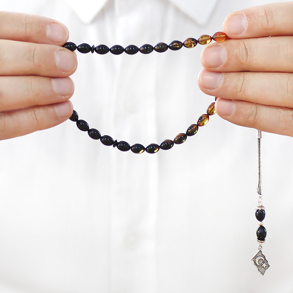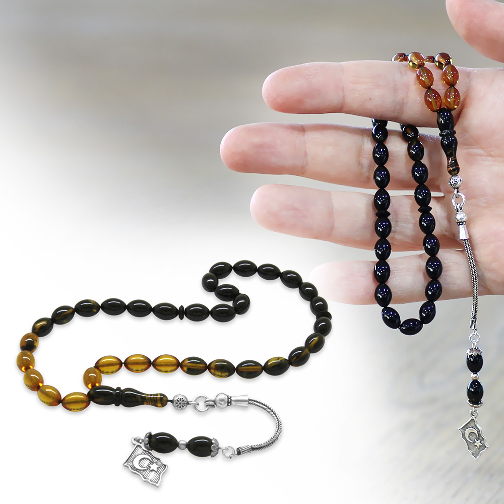 925 Ayar Gümüş Püsküllü Arpa Kesim Bilek Boy Süzme Sarı Siyah Ateş Kehribar Tesbih