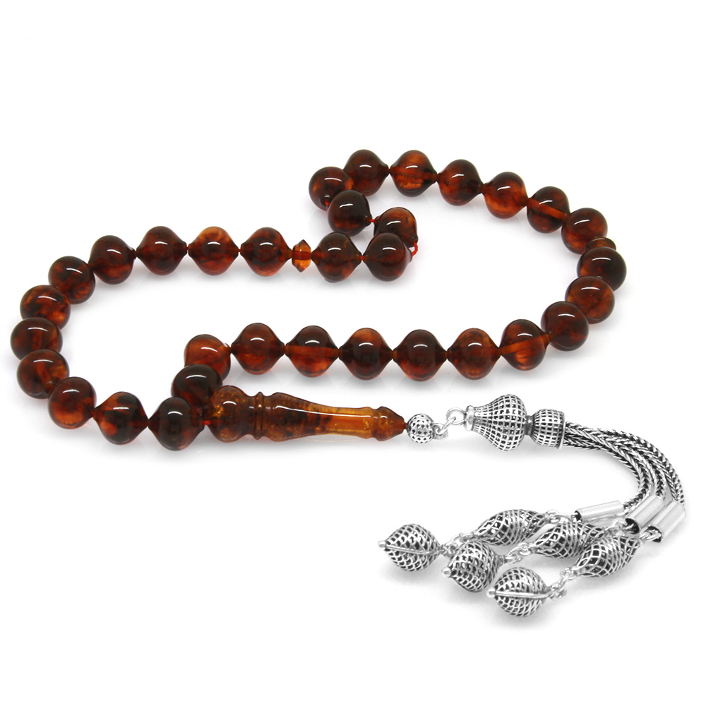 925 Ayar Gümüş Püsküllü İstanbul Kesim Bitki Fosilli Bal Rengi Damla Kehribar Tesbih - 1