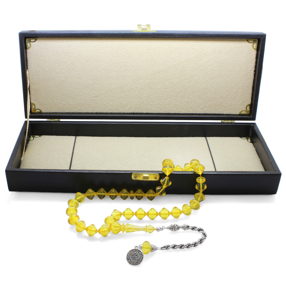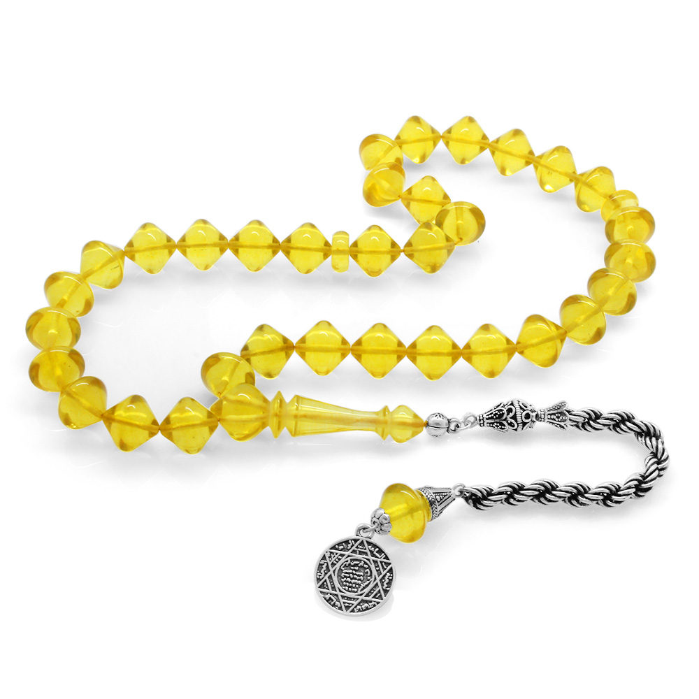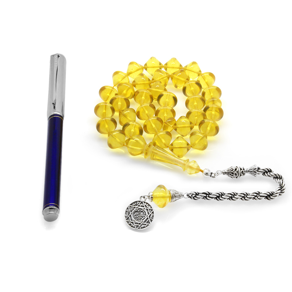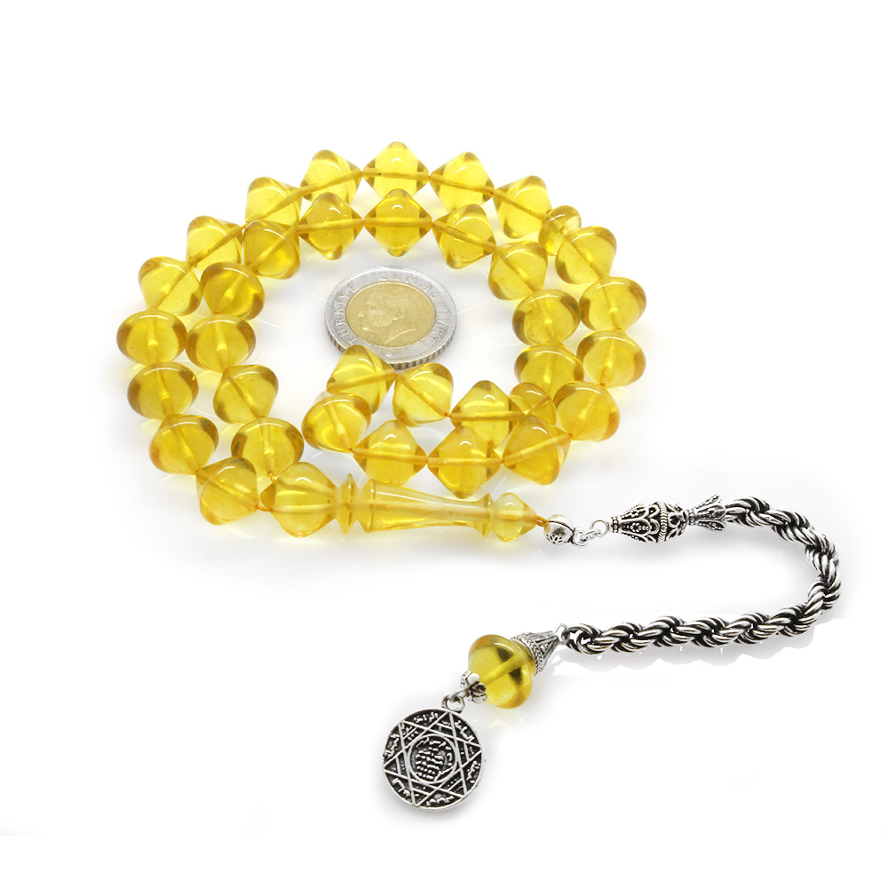 925 Ayar Gümüş Püsküllü İstanbul Kesim Soft Sarı Büyük Boy Damla Kehribar Tesbih - 1
