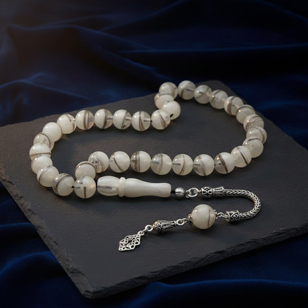 Kişiye Özel Saç Teli İçerir Hatıra Tesbih - 925 Ayar Gümüş Püsküllü - Küre Kesim - Sedef Süslemeli