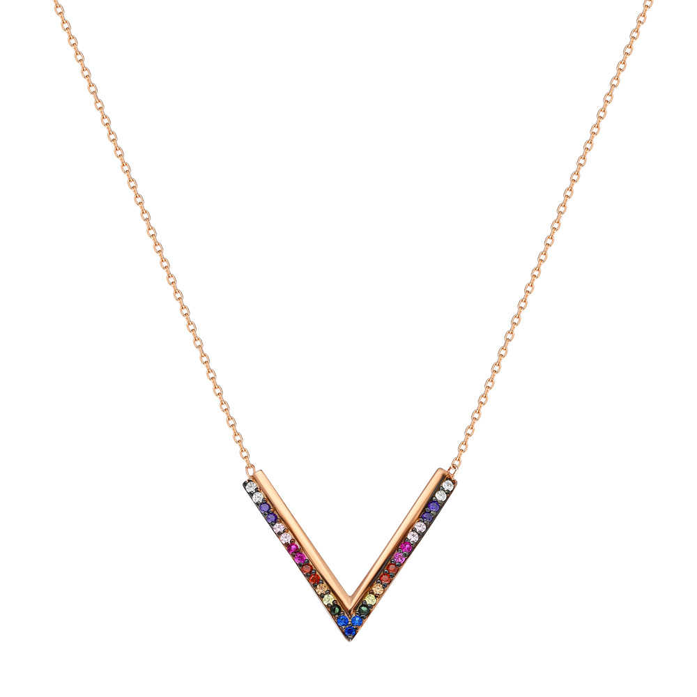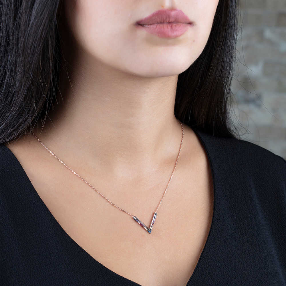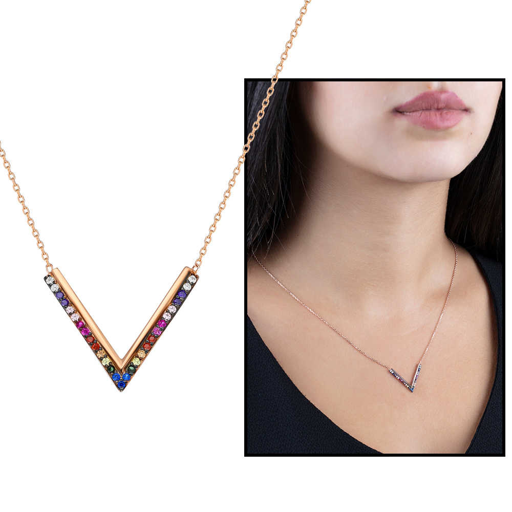 Renkli Zirkon Taşlı V Tasarım 925 Ayar Gümüş Bayan Kolye