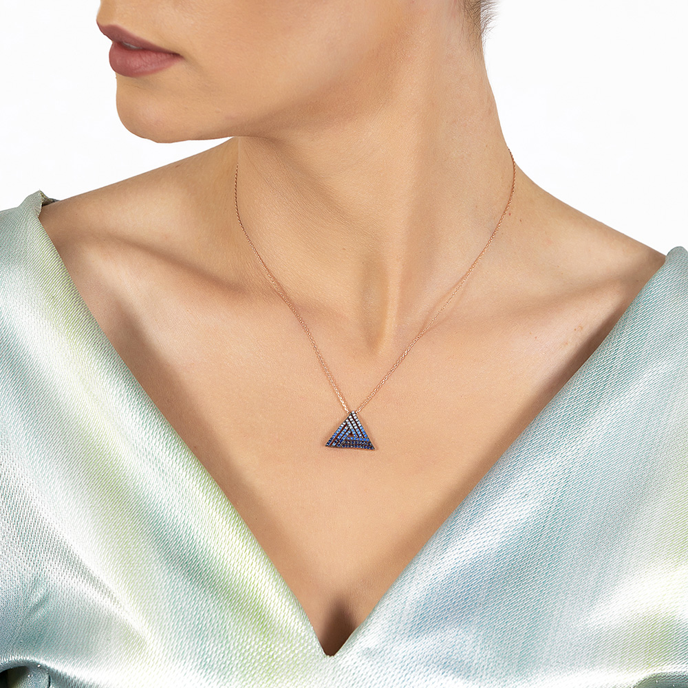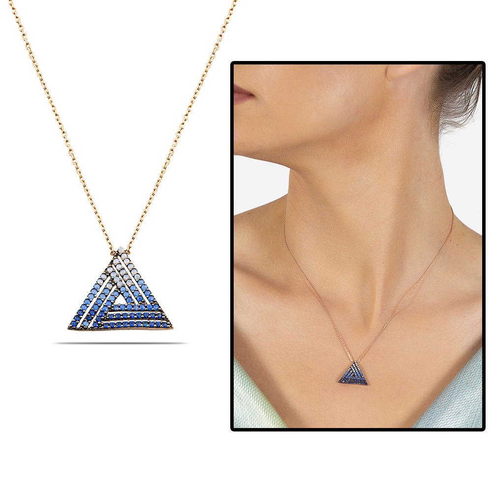 Mavi Zirkon Taşlı Sarmal Üçgen Tasarım 925 Ayar Gümüş Bayan Kolye