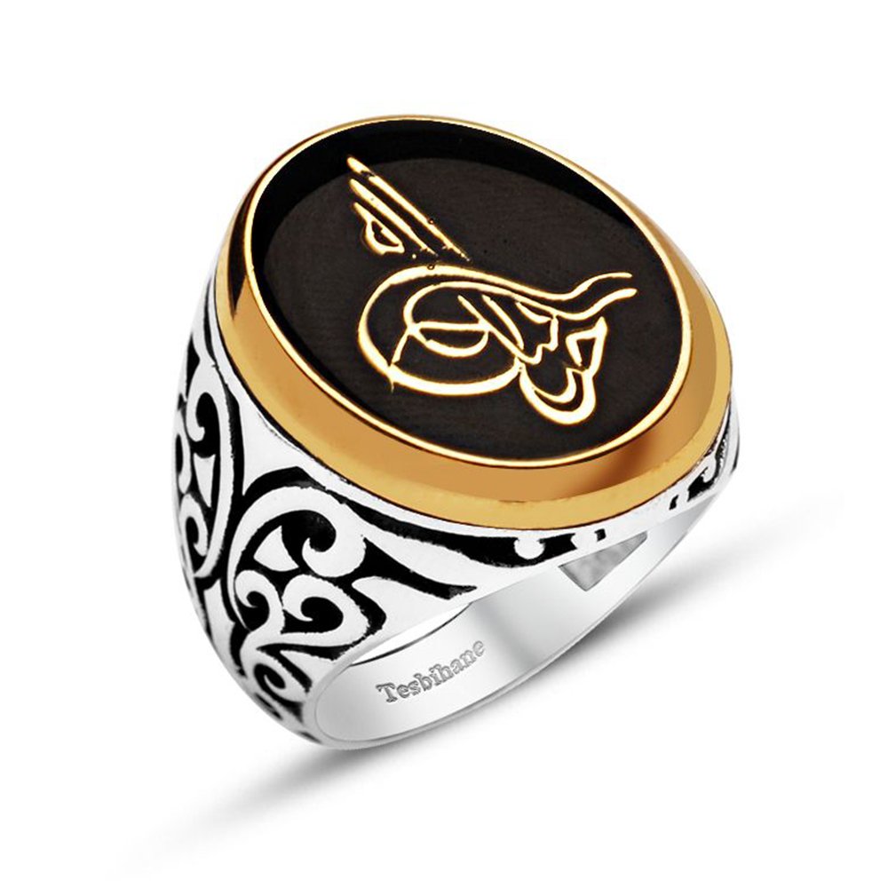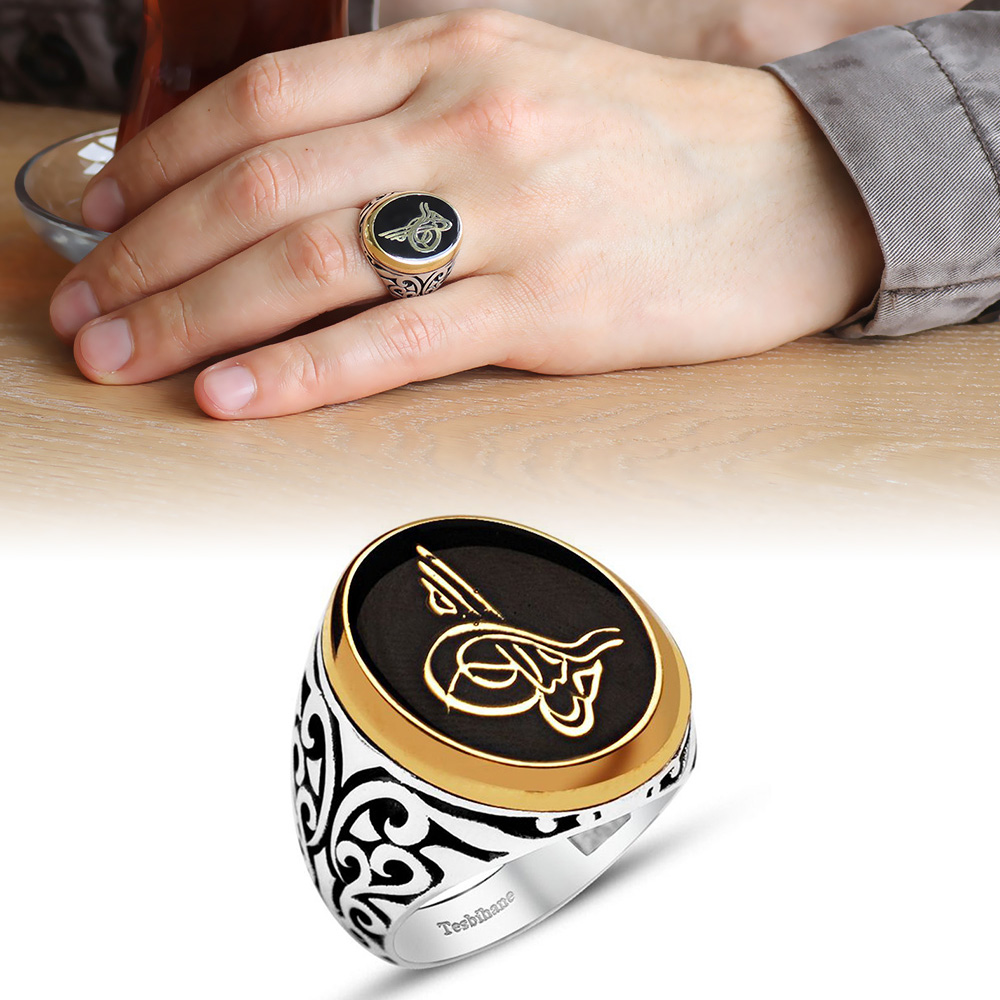 Tuğra Motifli Siyah Mineli 925 Ayar Gümüş Erkek Yüzük