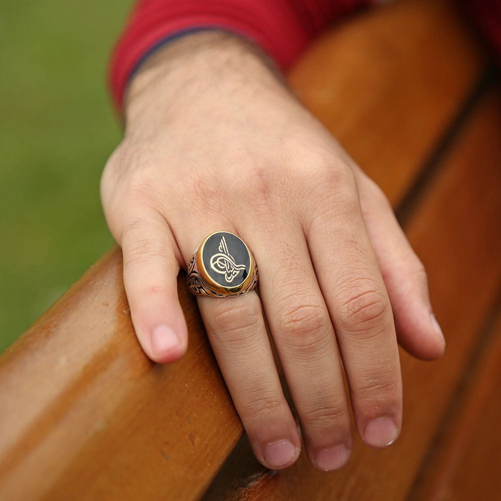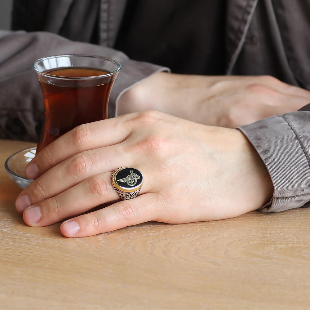 Tuğra Motifli Siyah Mineli 925 Ayar Gümüş Erkek Yüzük - 1