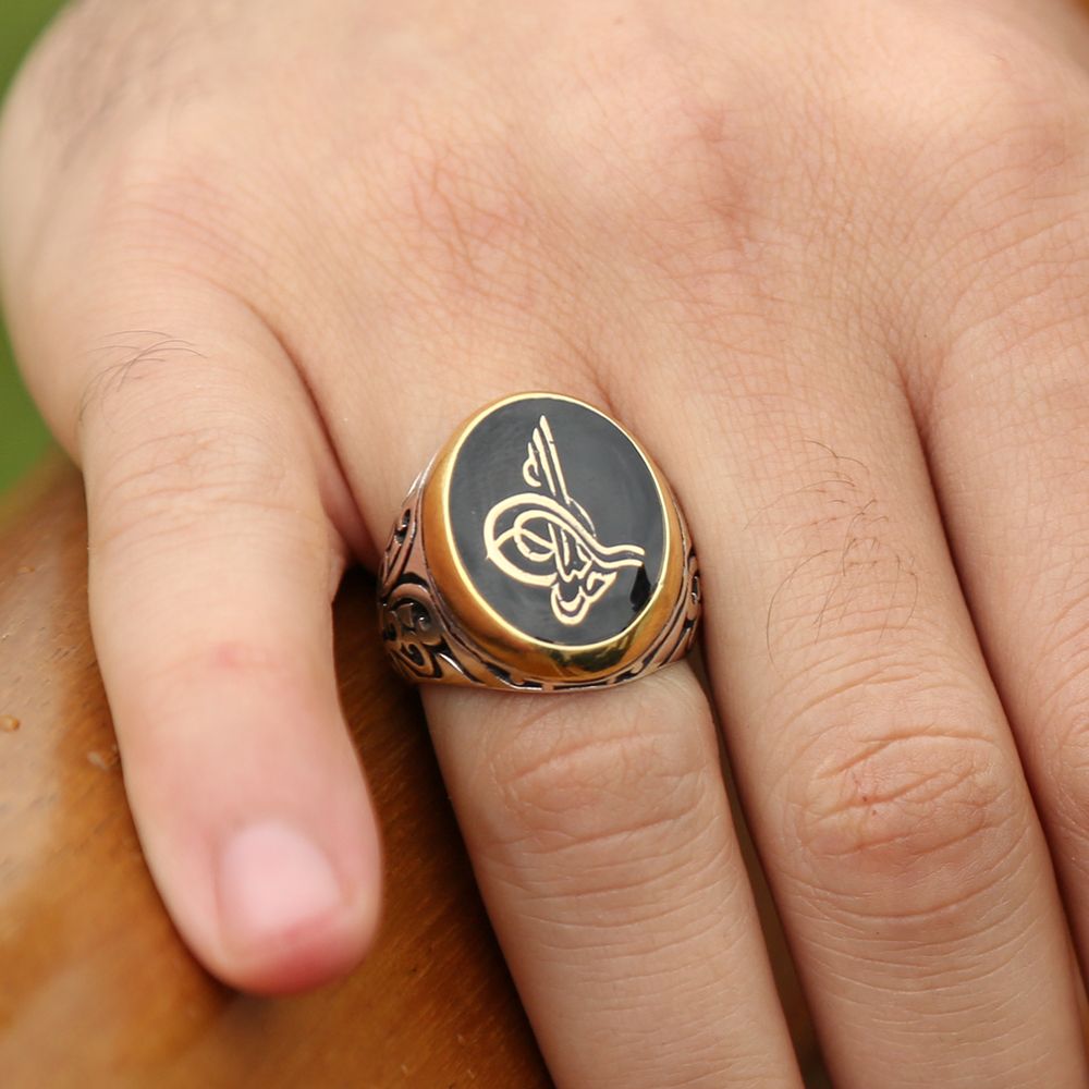 Tuğra Motifli Siyah Mineli 925 Ayar Gümüş Erkek Yüzük - 4