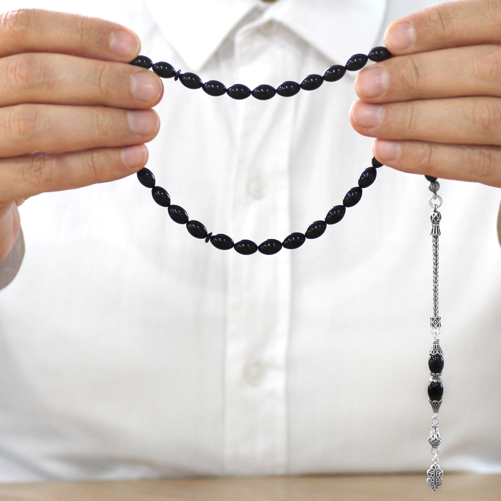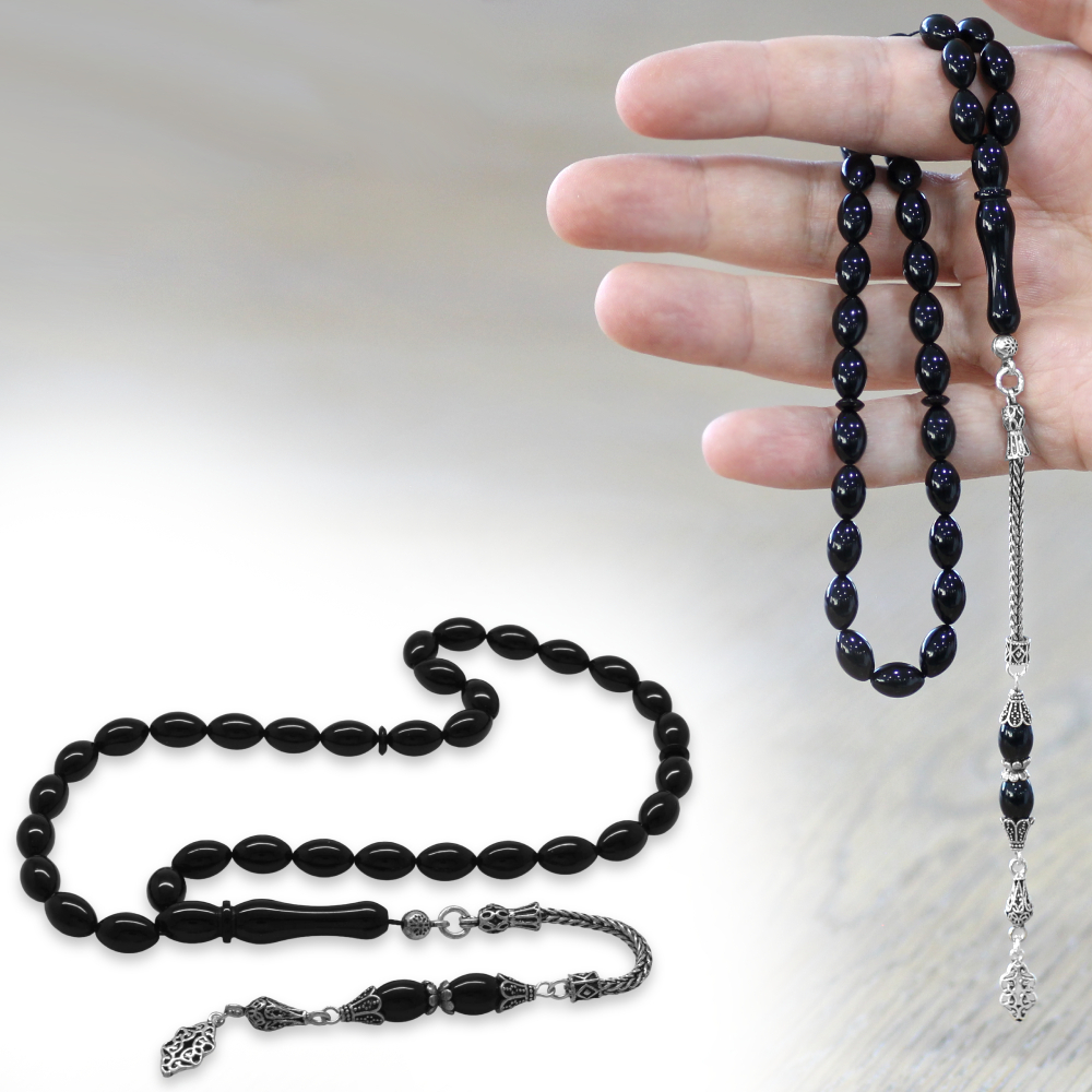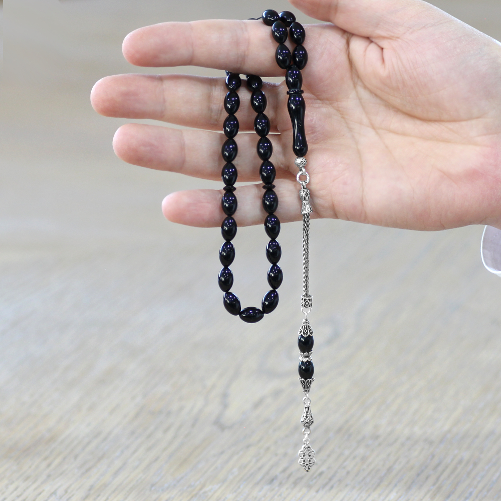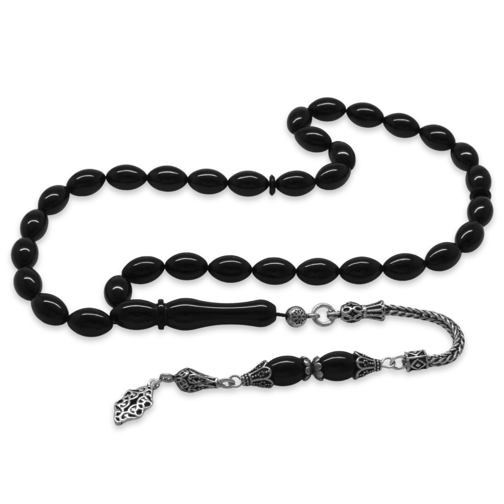 925 Ayar Gümüş Püsküllü Arpa Kesim Siyah Sıkma Kehribar Tesbih