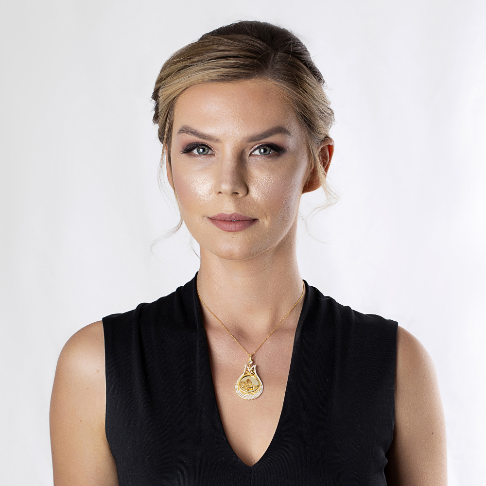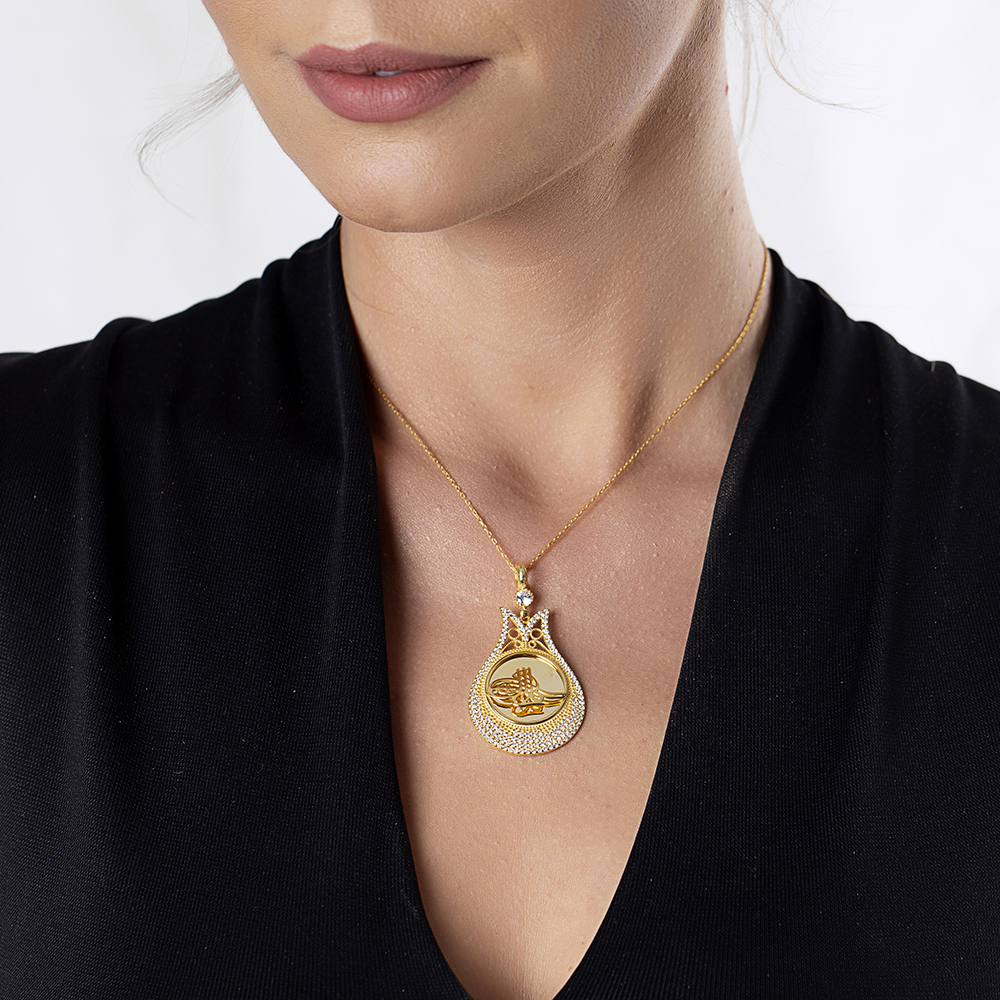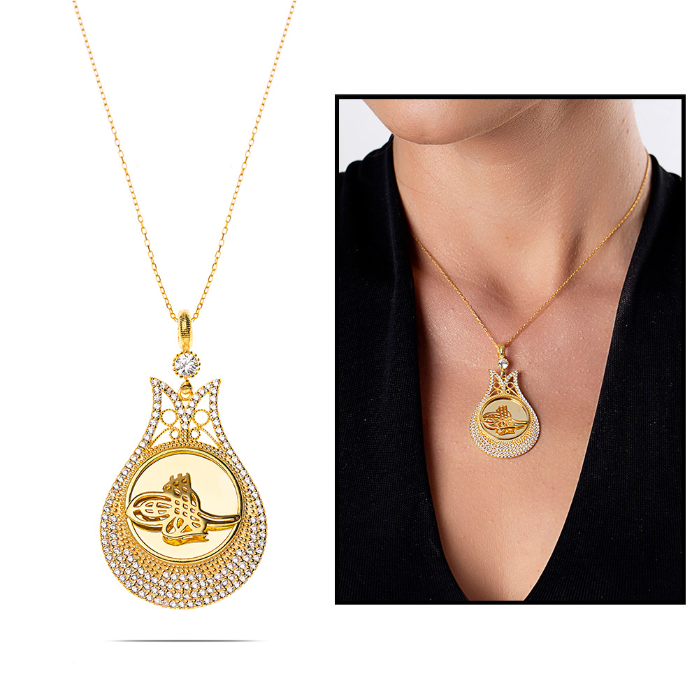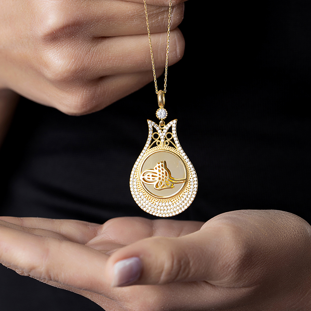 Beyaz Zirkon Taşlı Tuğralı Lale Tasarım 925 Ayar Gümüş Bayan Kolye