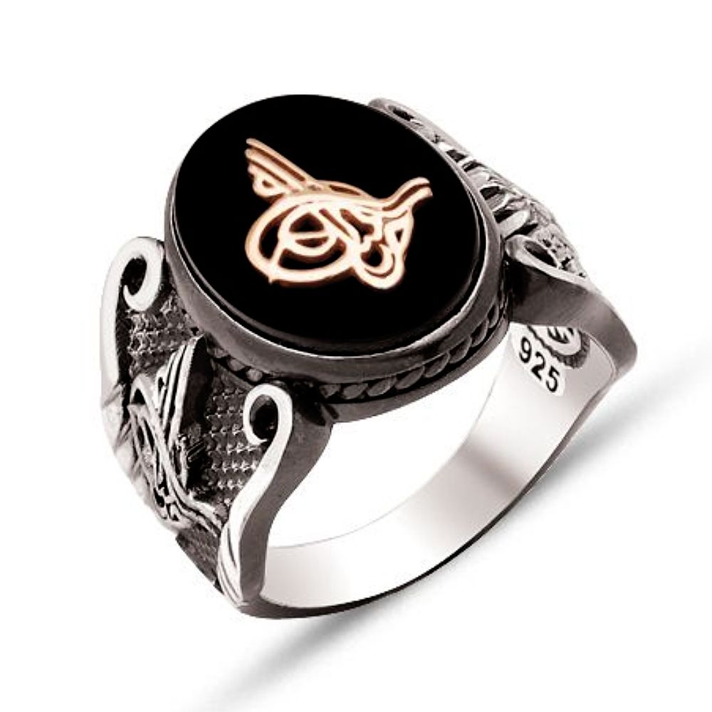 925 Ayar Gümüş Tuğra Desenli Oniks Taşlı Yüzük - 1