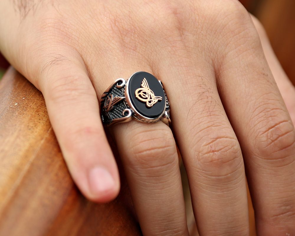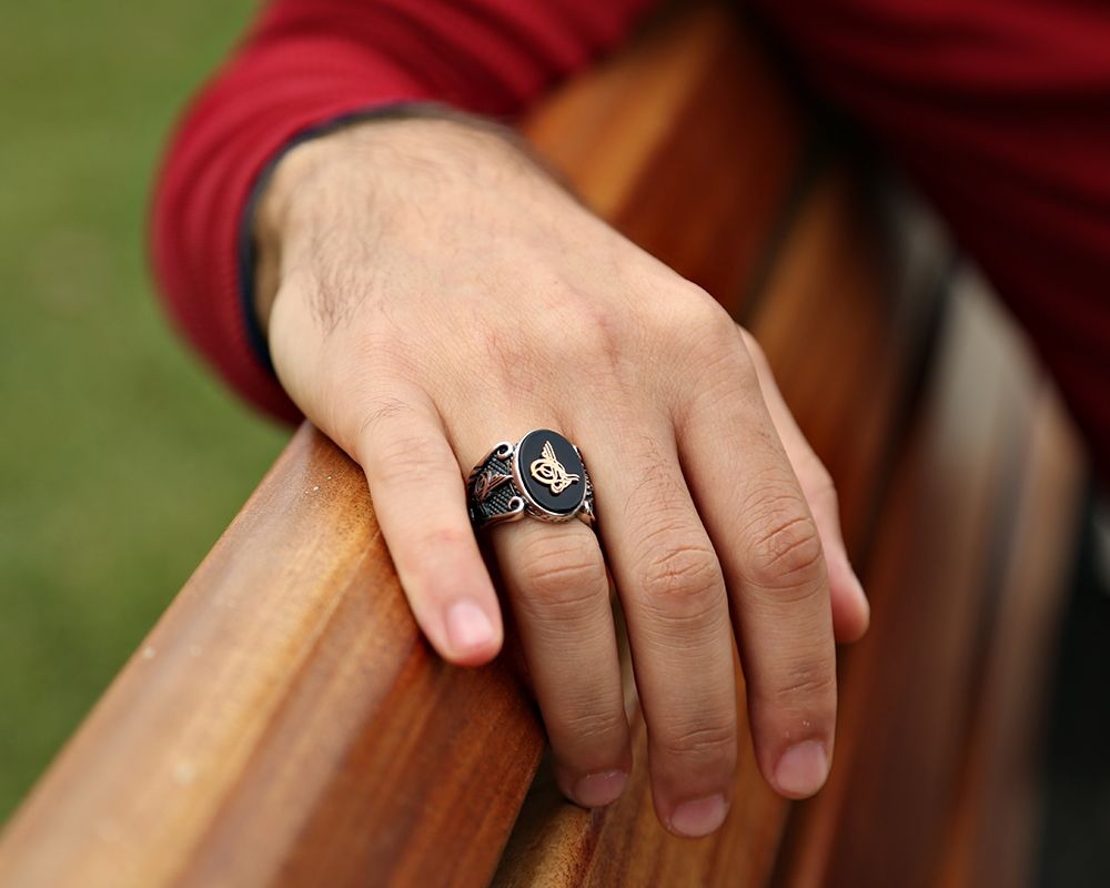 925 Ayar Gümüş Tuğra Desenli Oniks Taşlı Yüzük
