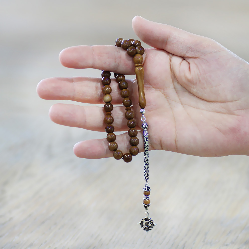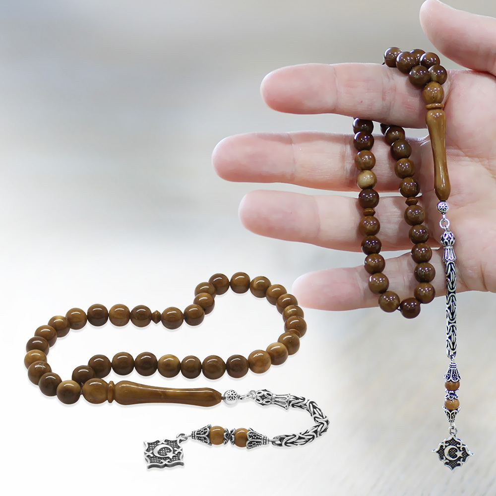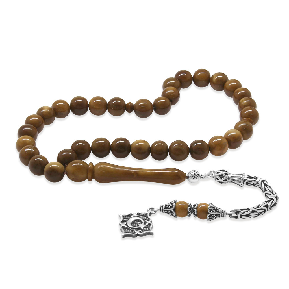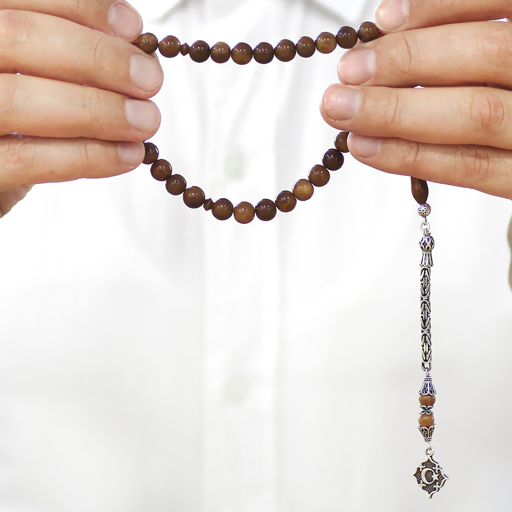 Kuka Tesbih - 925 Ayar Gümüş Kral Püsküllü - Kahverengi - Küre Kesim