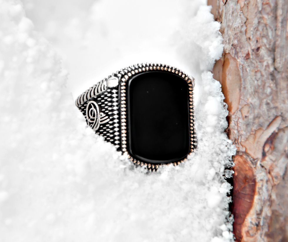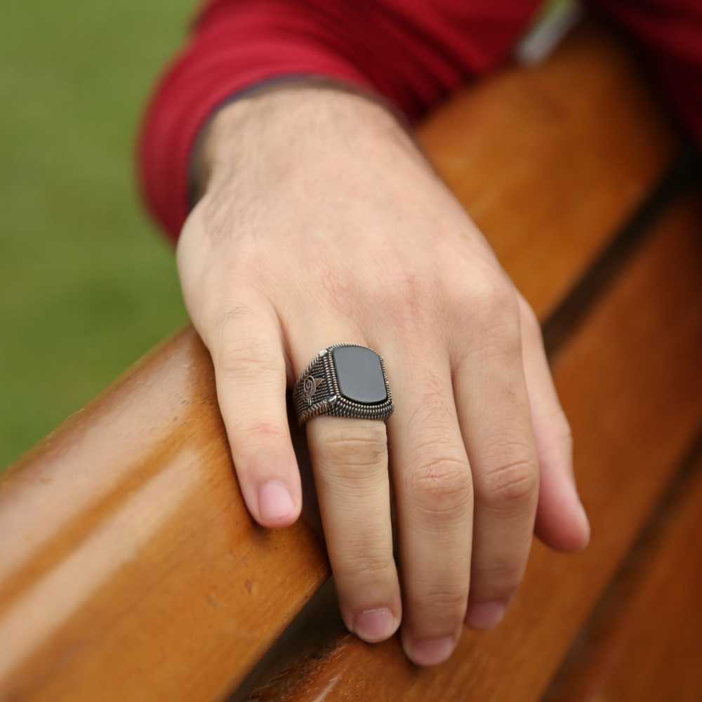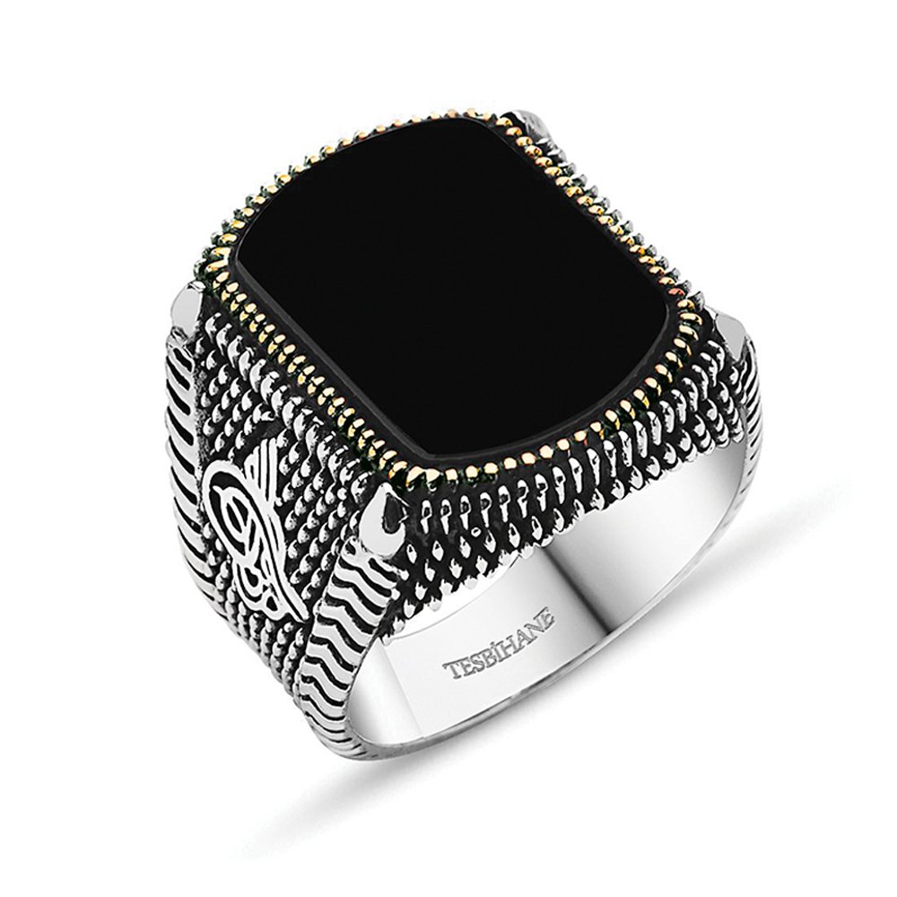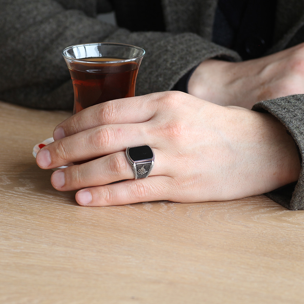Tuğra İşlemeli Kare Oniks Taşlı 925 Ayar Gümüş Erkek Yüzük