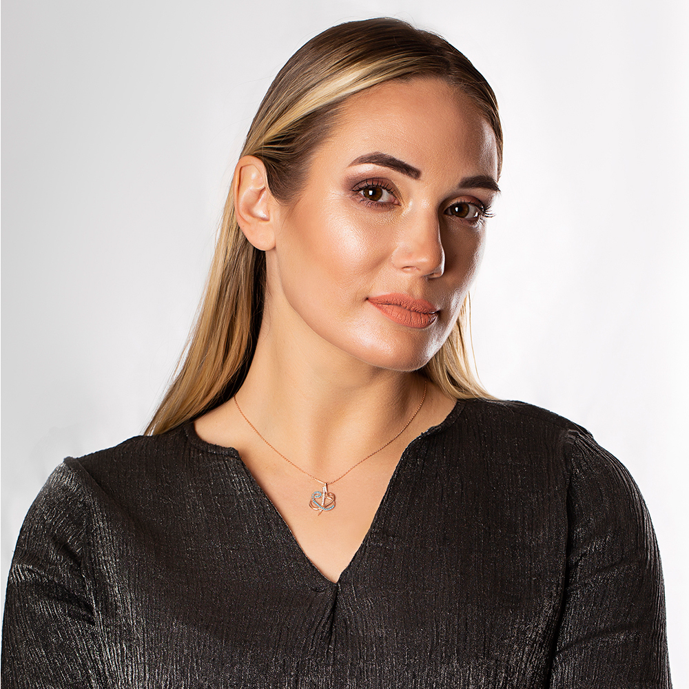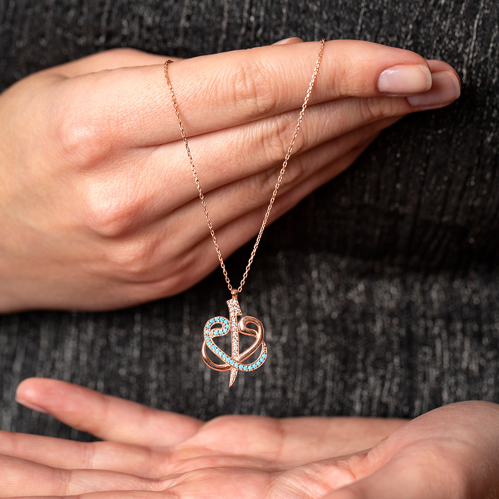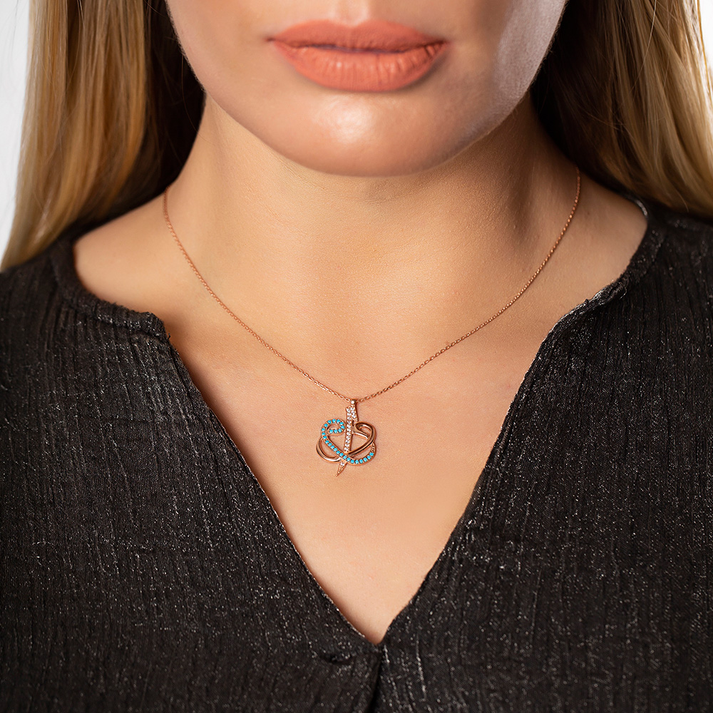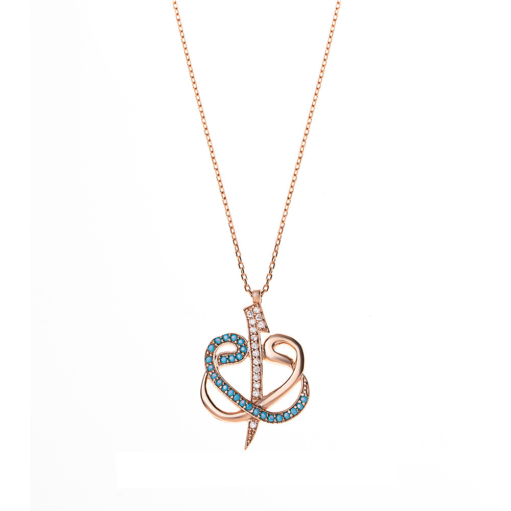 Mavi Beyaz Zirkon Taşlı Çift Elif Vav 925 Ayar Gümüş Bayan Kolye