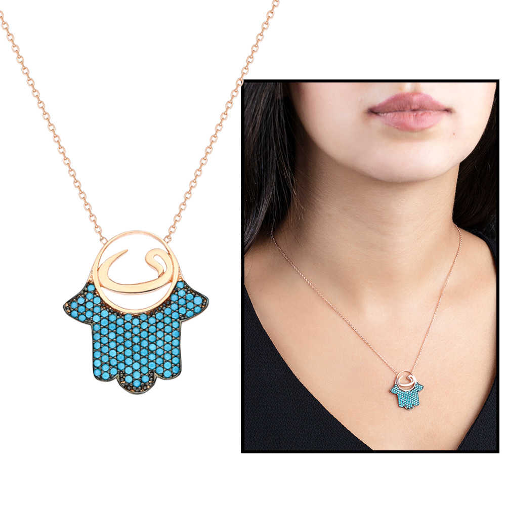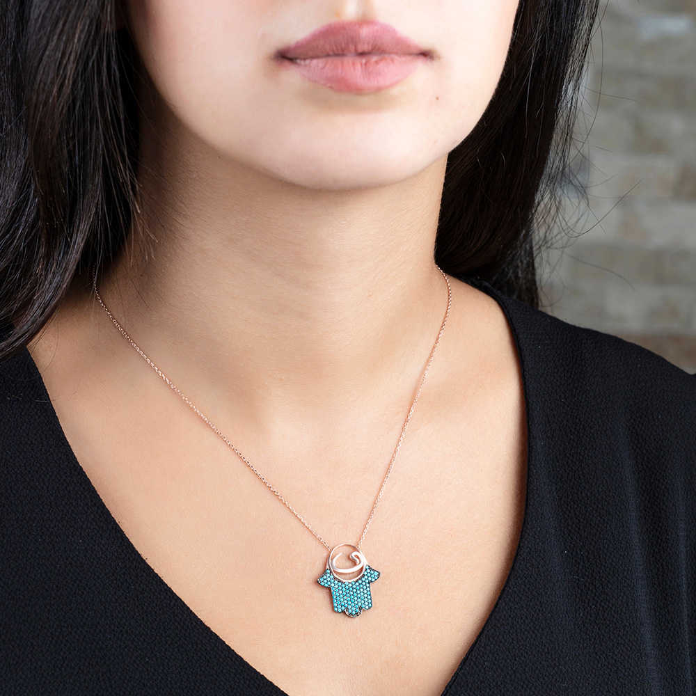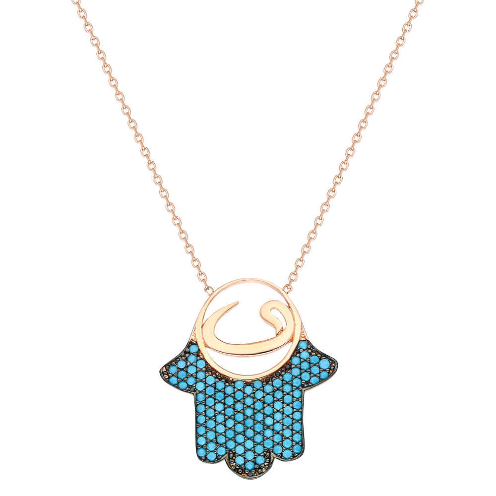 Turkuaz Zirkon Taşlı Fatma Ana Eli Tasarım 925 Ayar Gümüş Bayan Kolye