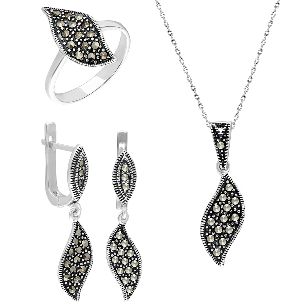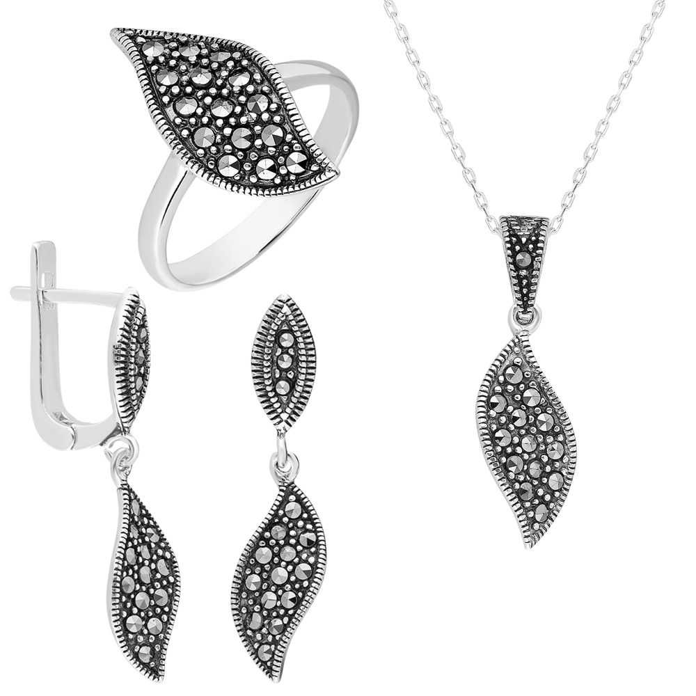 Zirkon Taşlı Yaprak Tasarım 925 Ayar Gümüş 3 lü Takı Seti