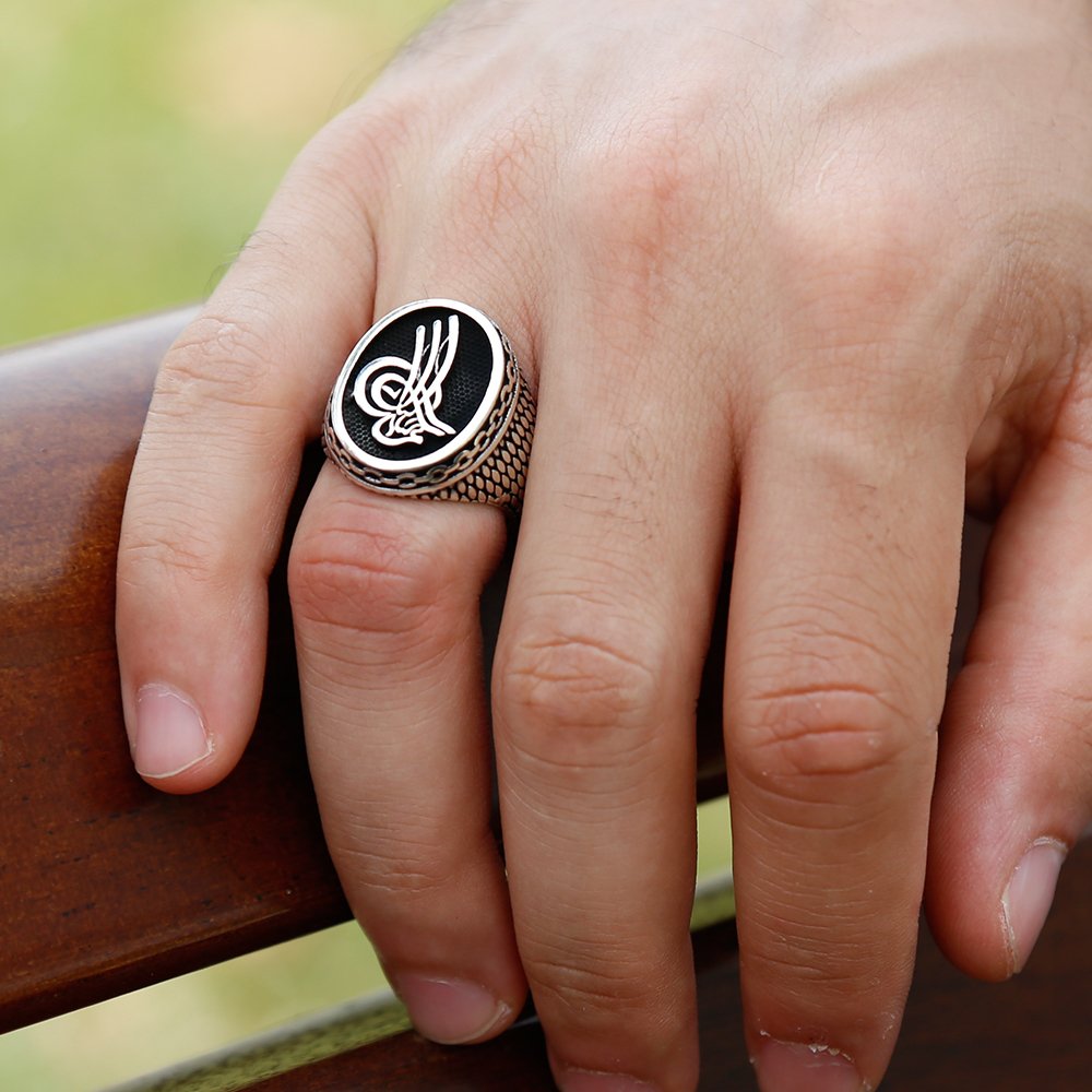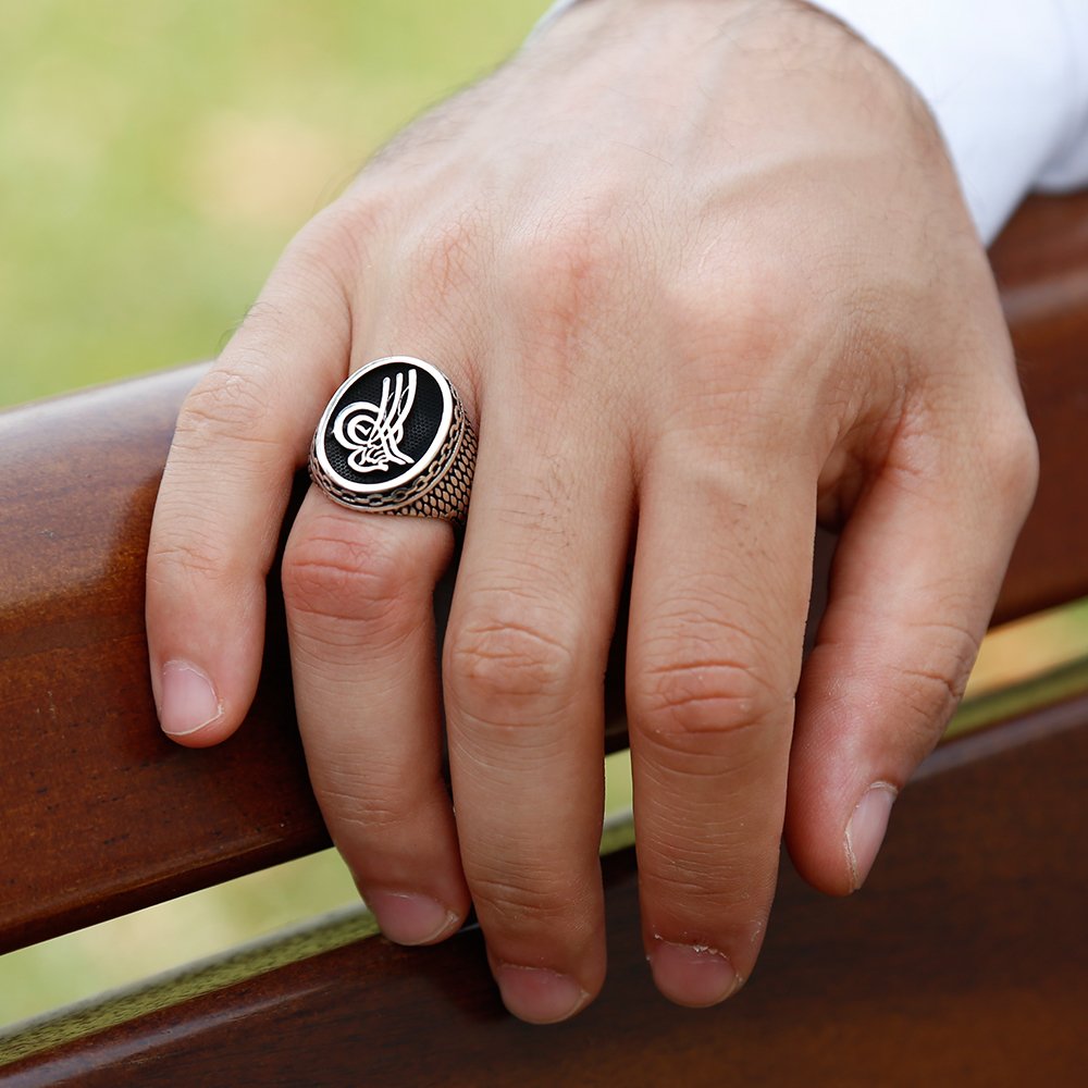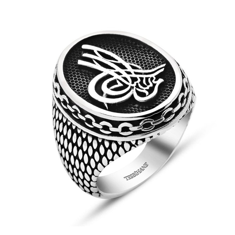Tuğra Motifli Zincir Tasarım 925 Ayar Gümüş Erkek Yüzük