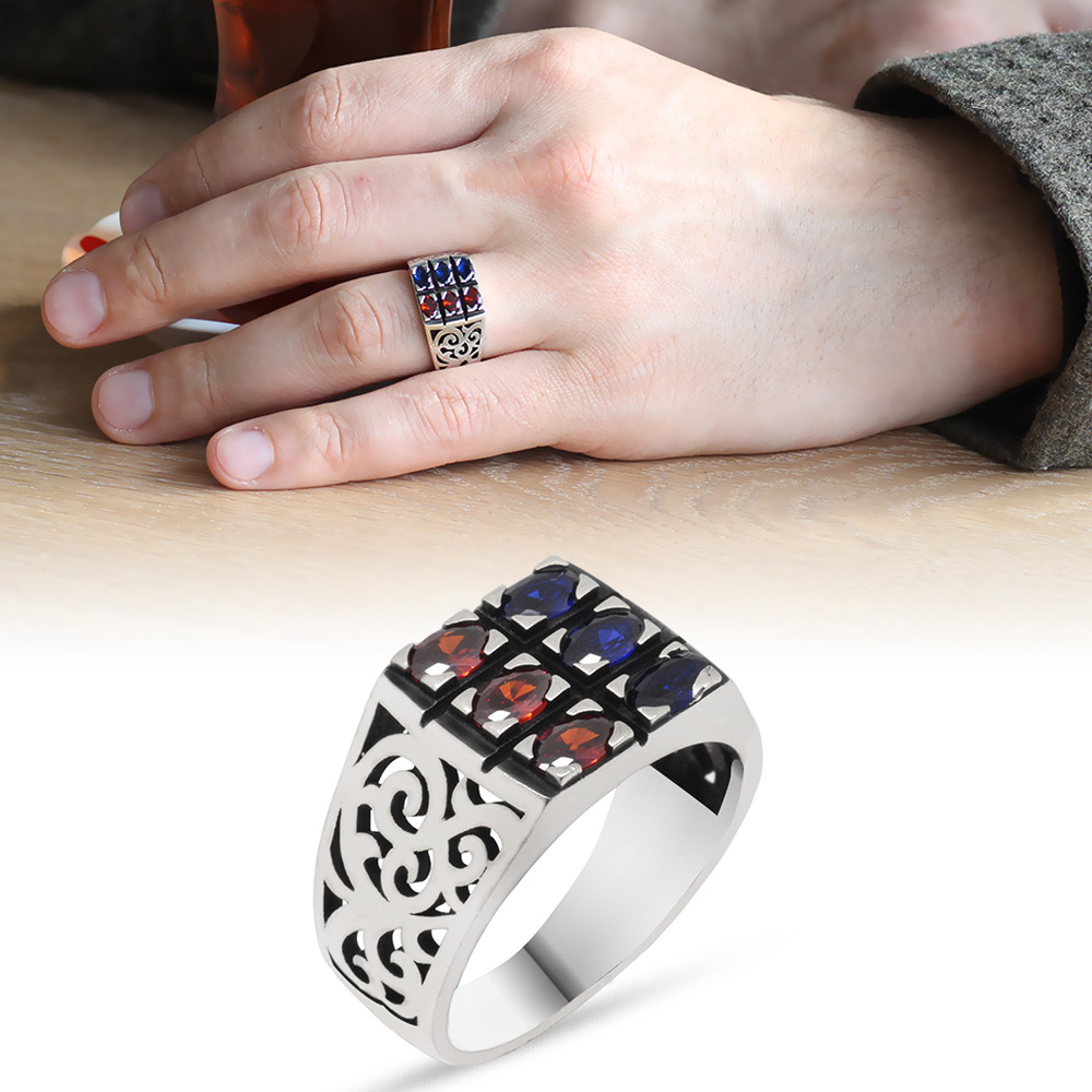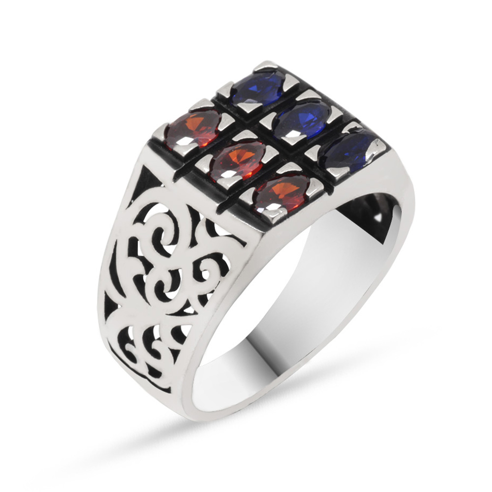 Mavi Kırmızı Zirkon Taşlı 925 Ayar Gümüş Erkek Yüzük