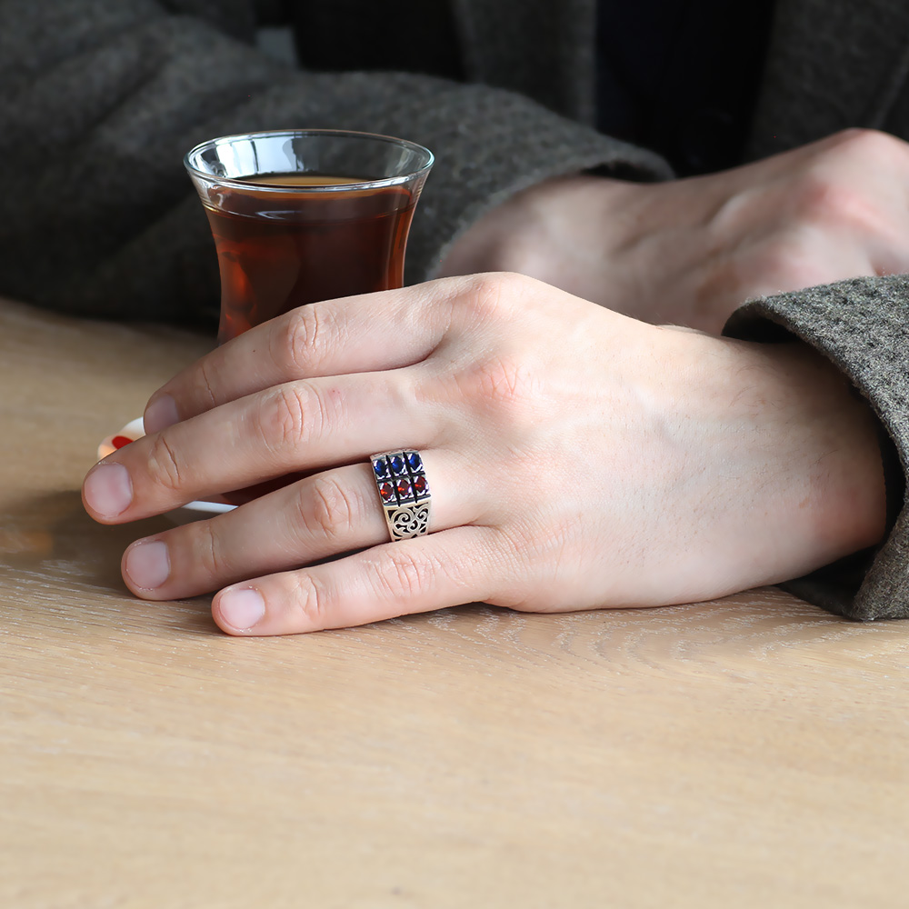Mavi Kırmızı Zirkon Taşlı 925 Ayar Gümüş Erkek Yüzük - 4