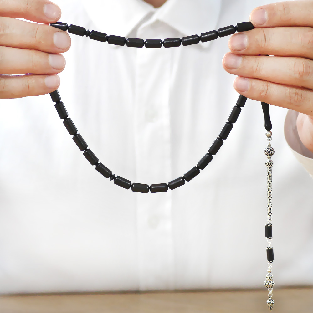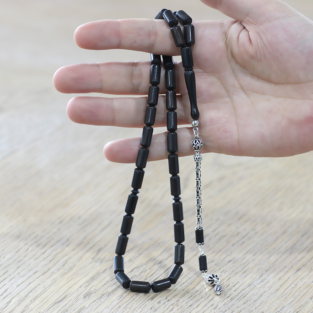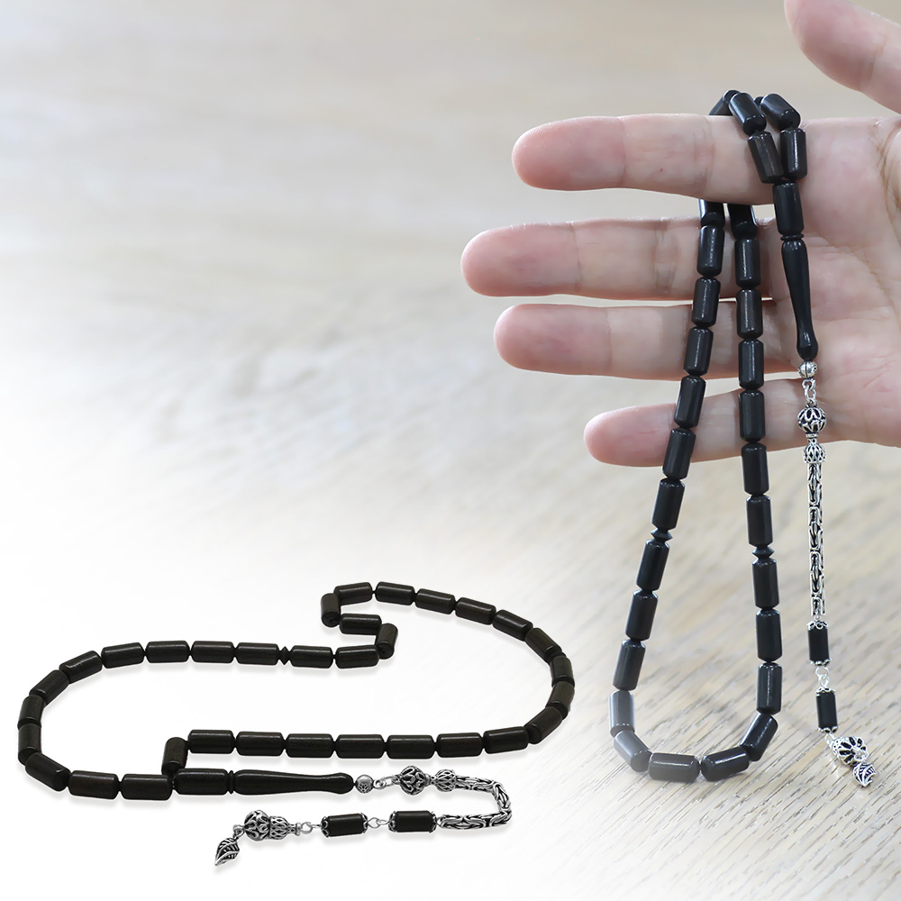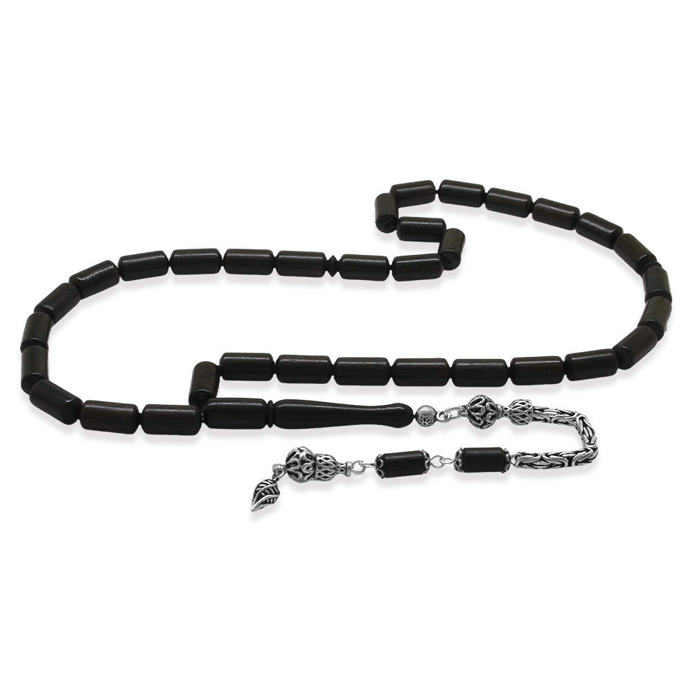 Abanoz Ağacı Tesbih - 925 Ayar Gümüş Kral Zincir Püsküllü - Siyah Renk - Kapsül Kesim