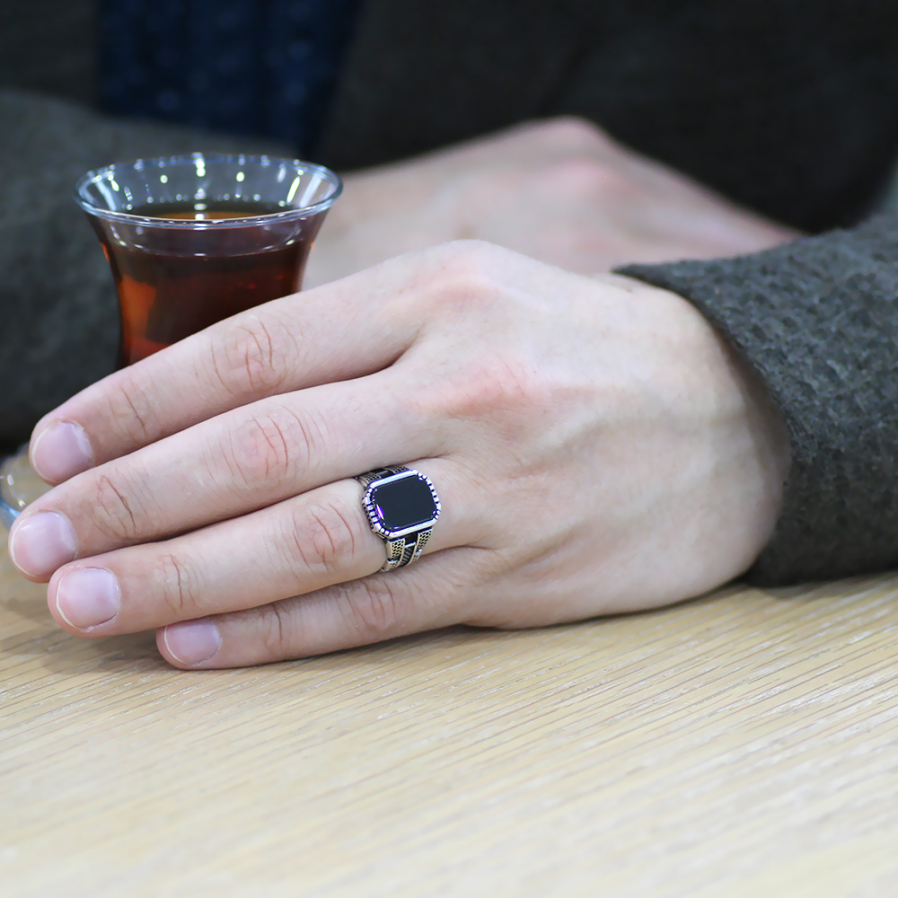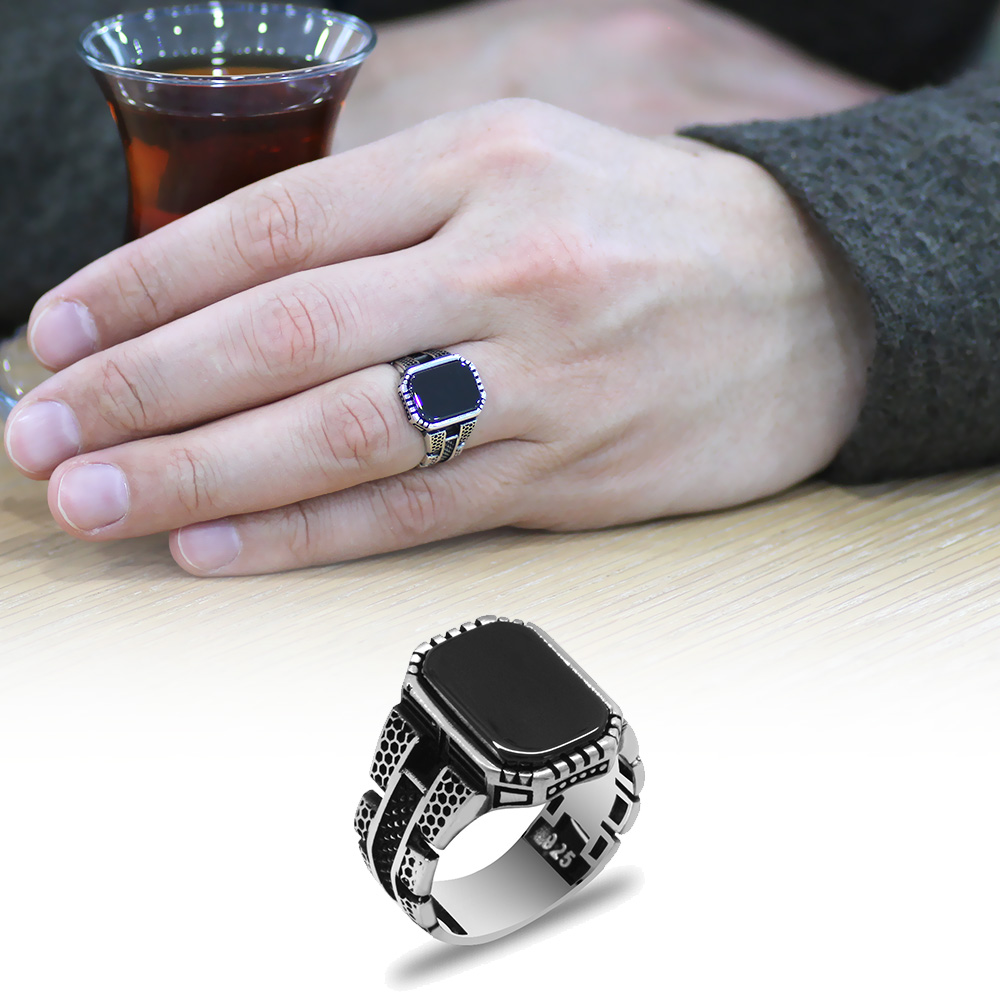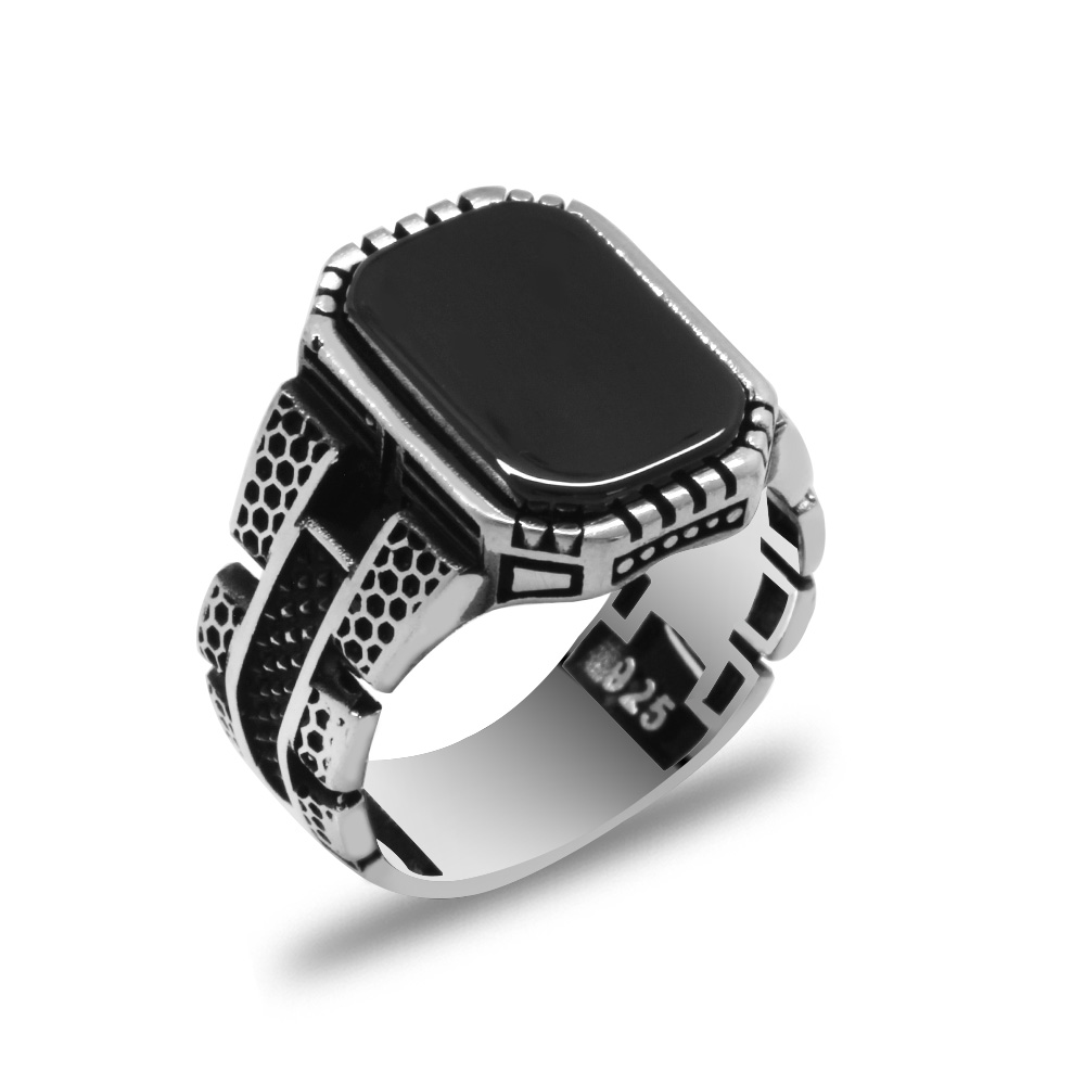 Altıgen Oniks Taşlı Basic Tasarım 925 Ayar Gümüş Erkek Yüzük