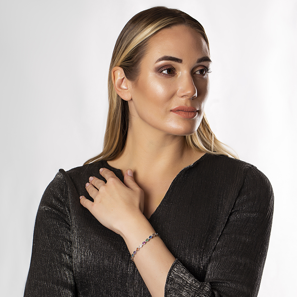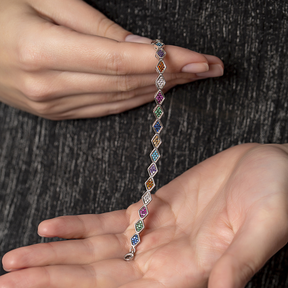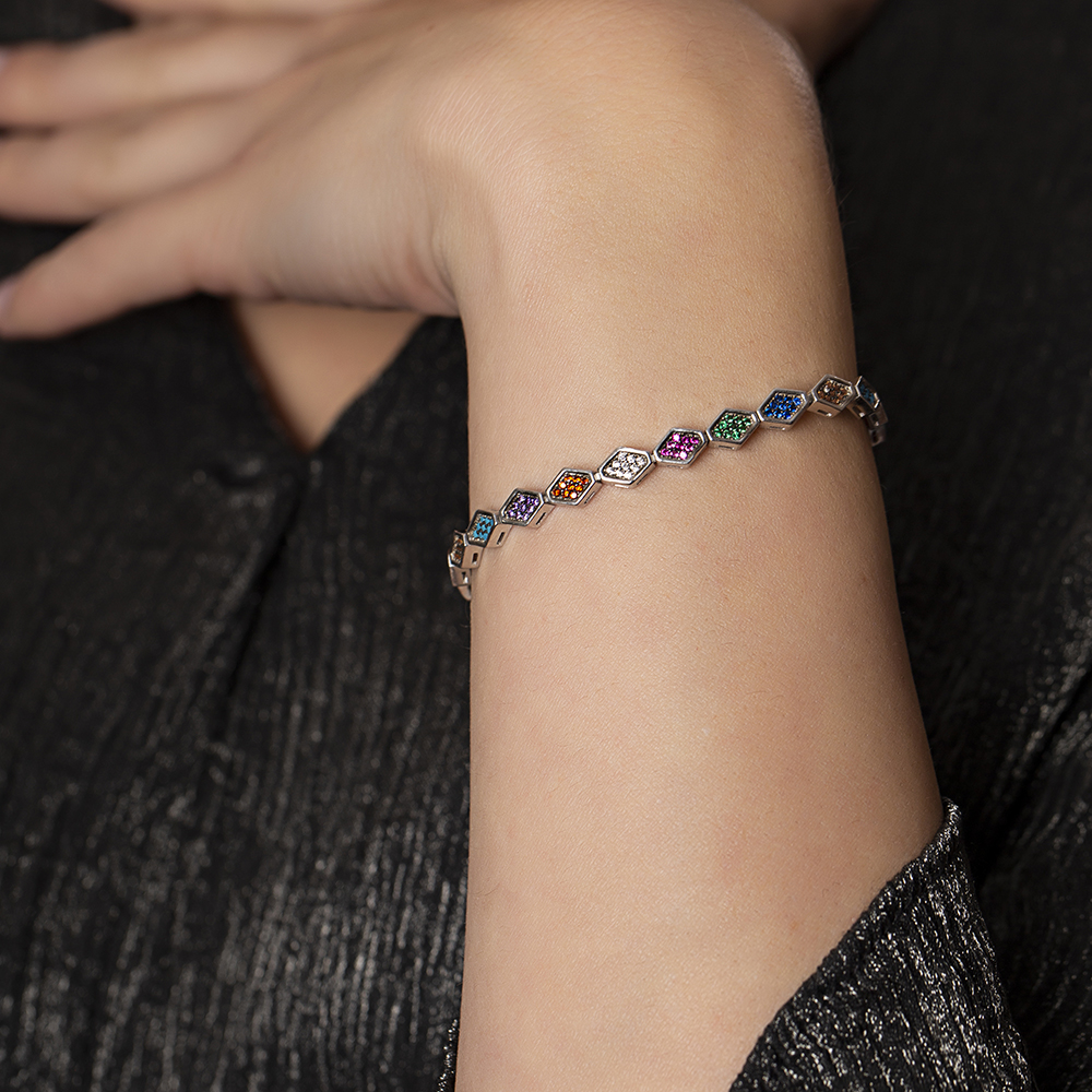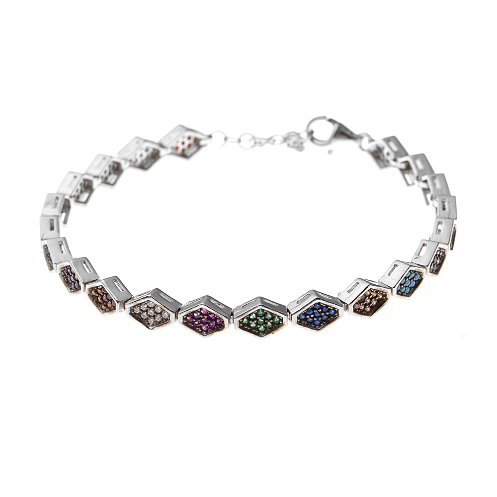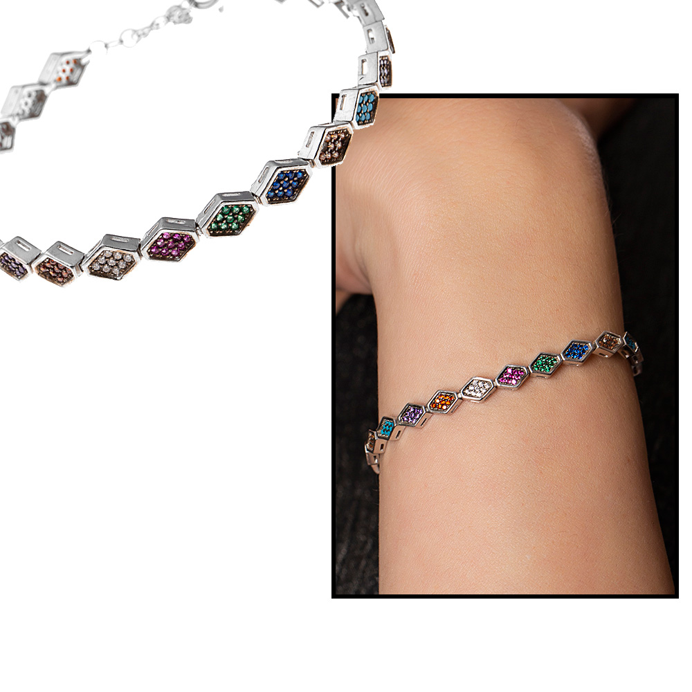 Altıgen Tasarım Çok Renkli Zirkon Taşlı Tam Tur 925 Ayar Gümüş Kadın Bileklik