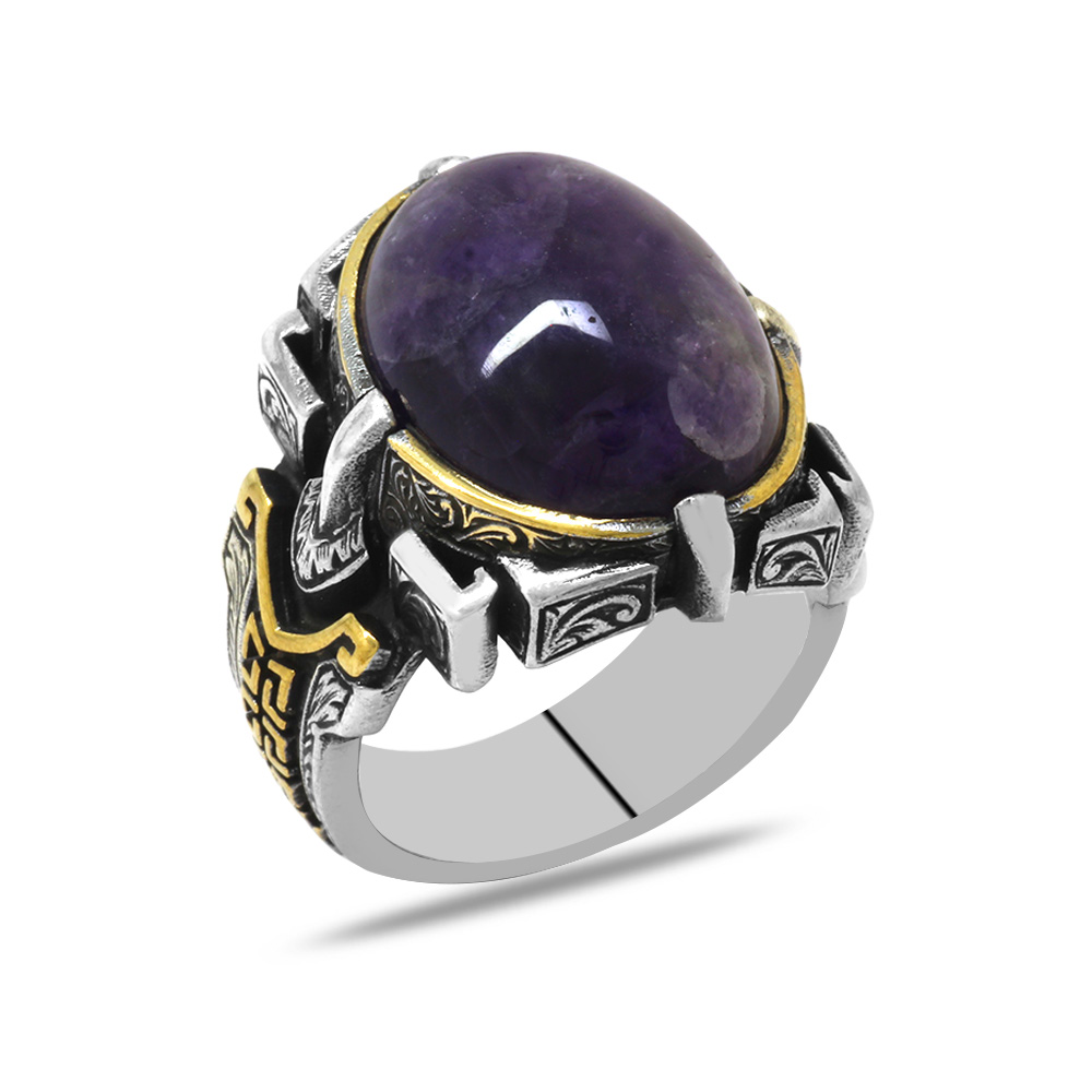 Ametist Taşlı Kalem İşçilik Tasarım 925 Ayar Gümüş Erkek Yüzük
