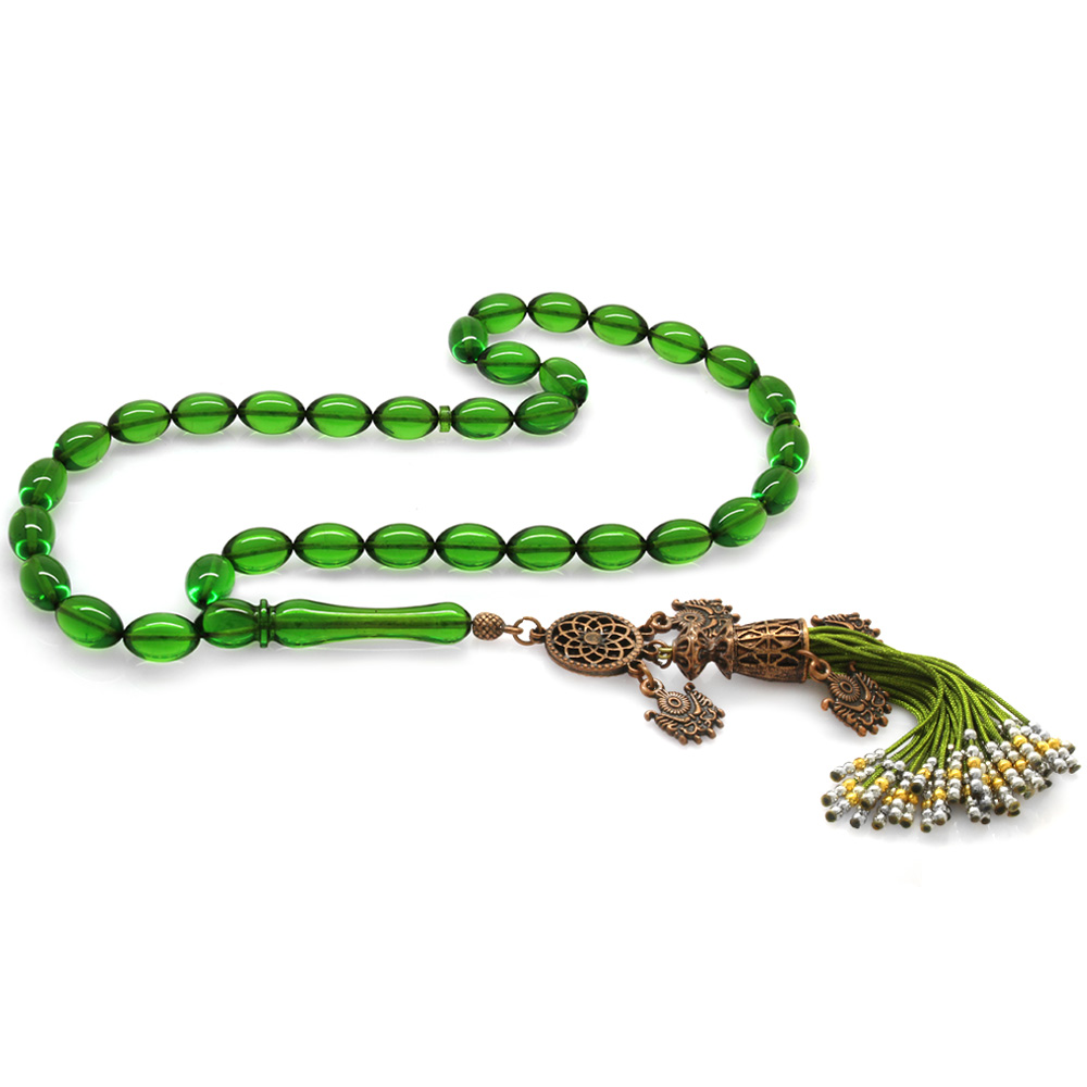 Antik Bakır Osmanlı Saray Püsküllü Arpa Kesim Yeşil Ateş Kehribar Tesbih - 1