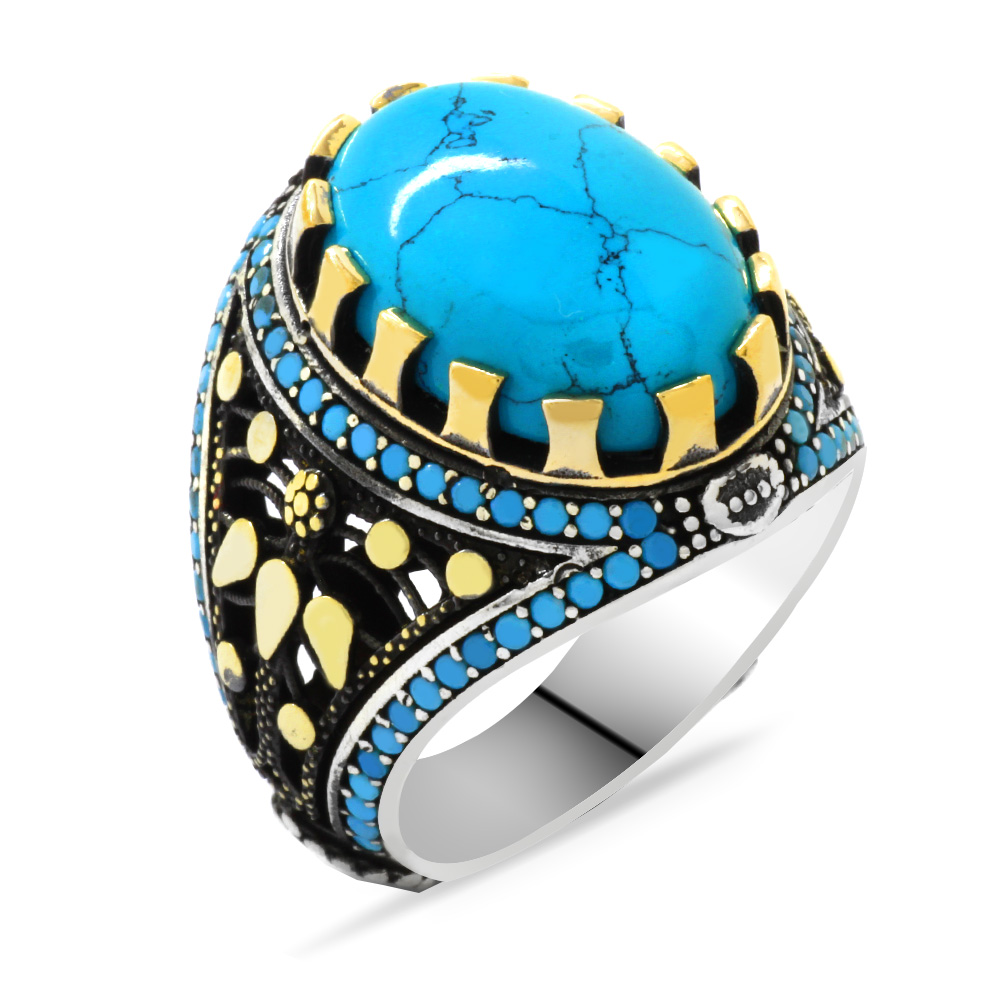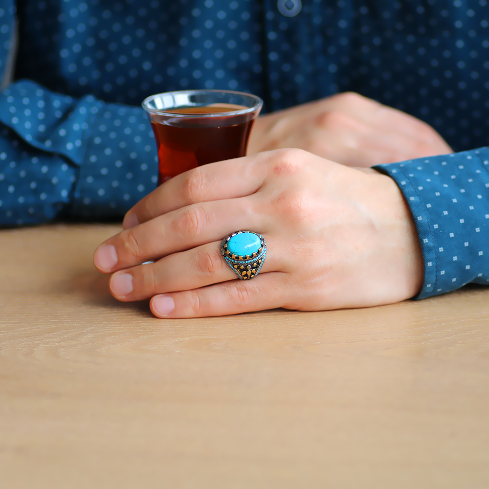 Turkuaz Firuze Doğal Taşlı Oval Tasarım 925 Ayar Gümüş Erkek Yüzük
