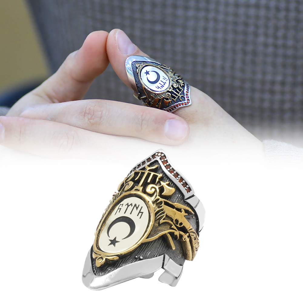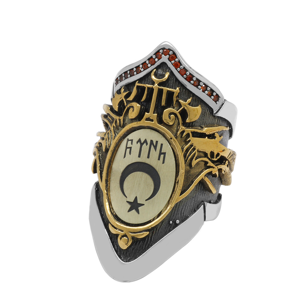 Arma Tasarım Türk Yazılı ve Ayyıldız Temalı 925 Ayar Gümüş Okçu Zihgir Yüzük