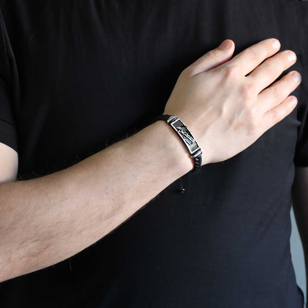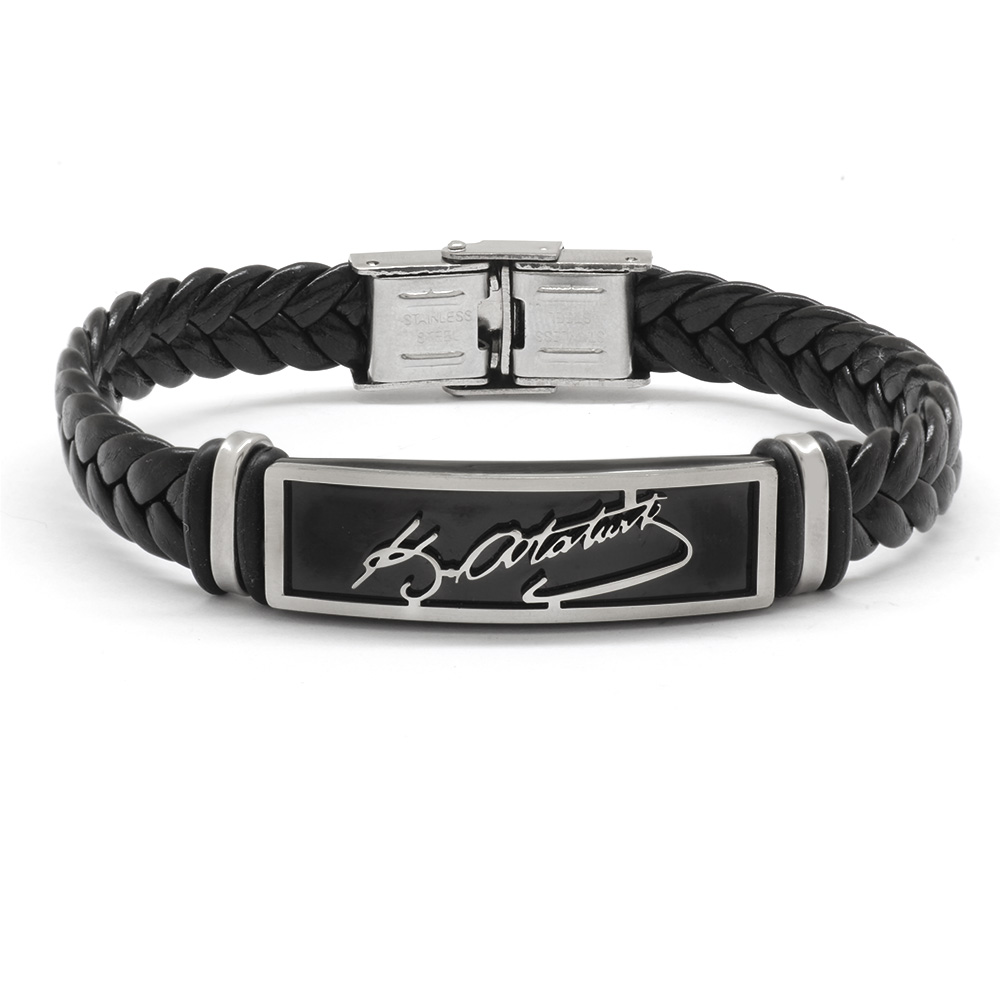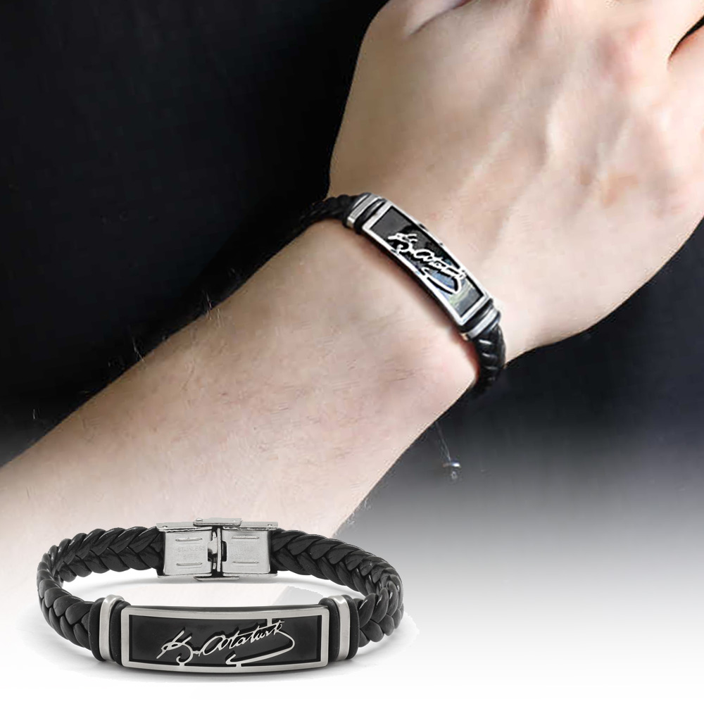 Atatürk İmza Tasarım Siyah Deri Çelik Kombinli Erkek Bileklik