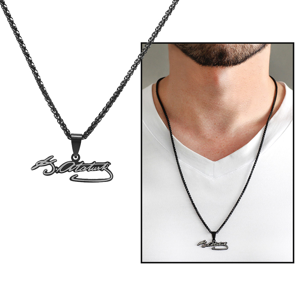 Atatürk İmzalı Siyah Renk Çelik Erkek Kolye - 1