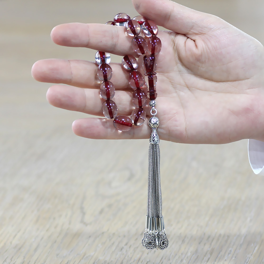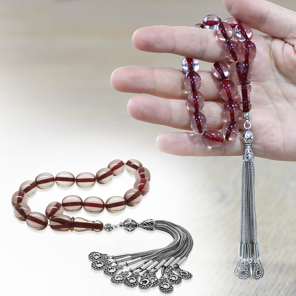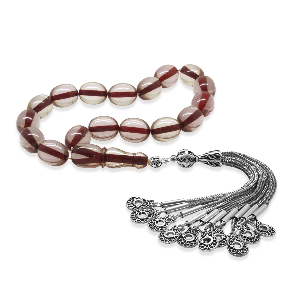 Ateş Kehribar Efe Tesbih - 10 lu Kamçı Kararmaz Metal Püsküllü - Şeffaf Renk - Özel Kesim