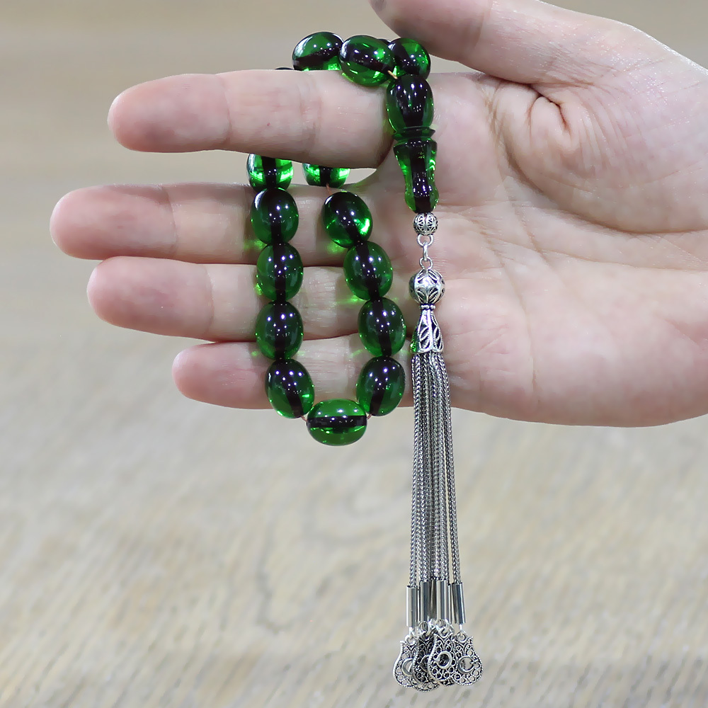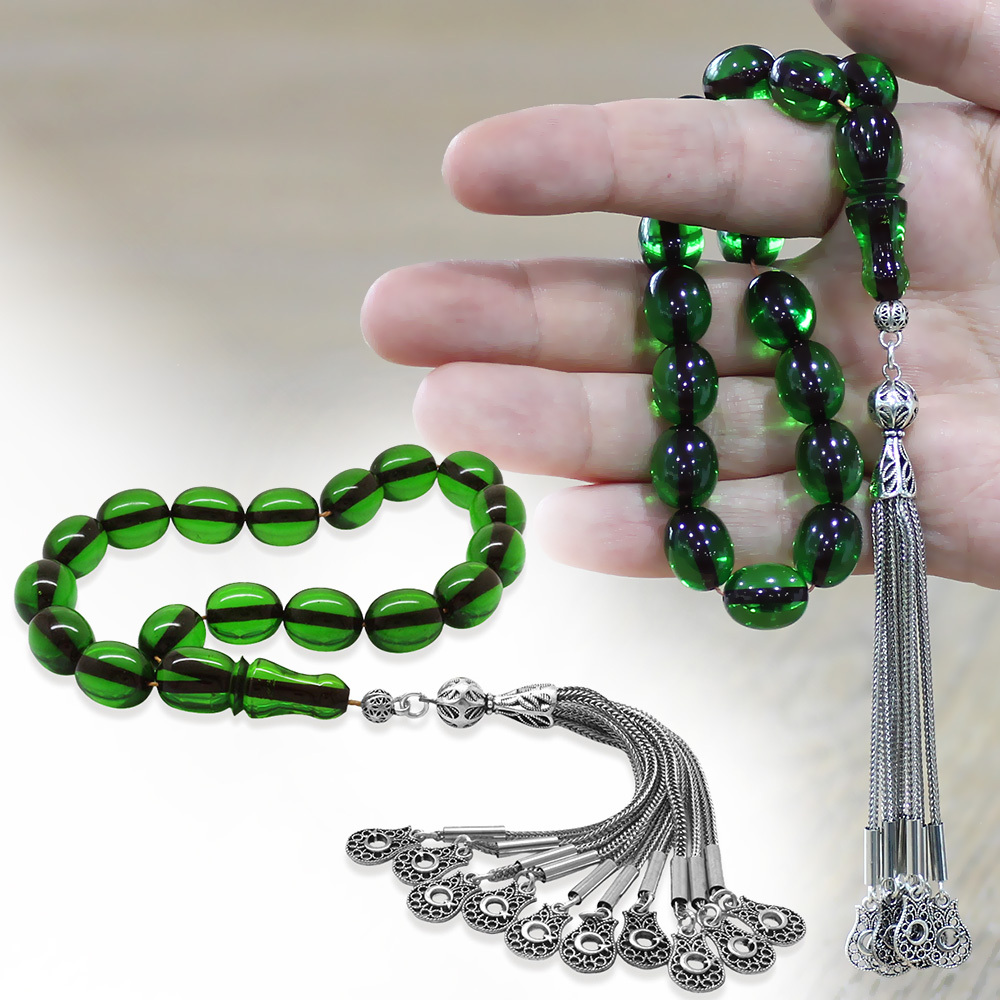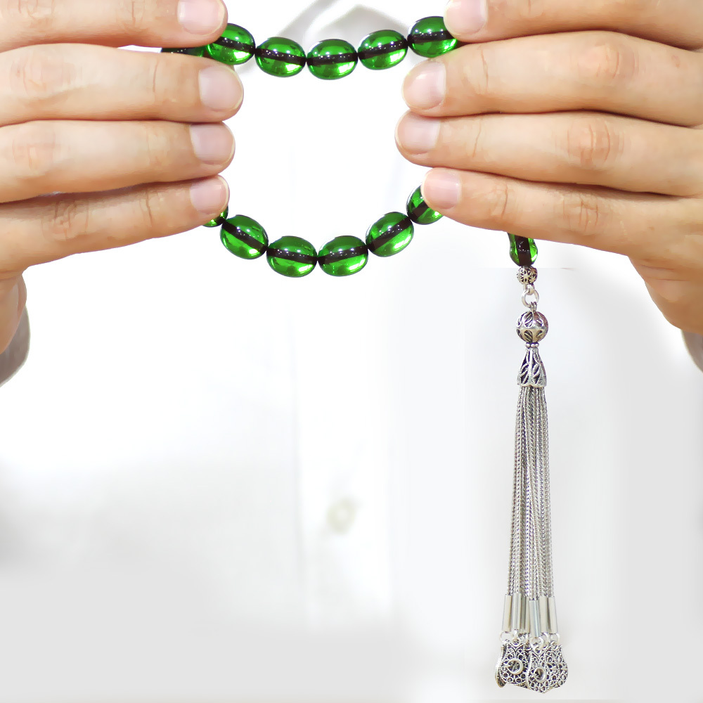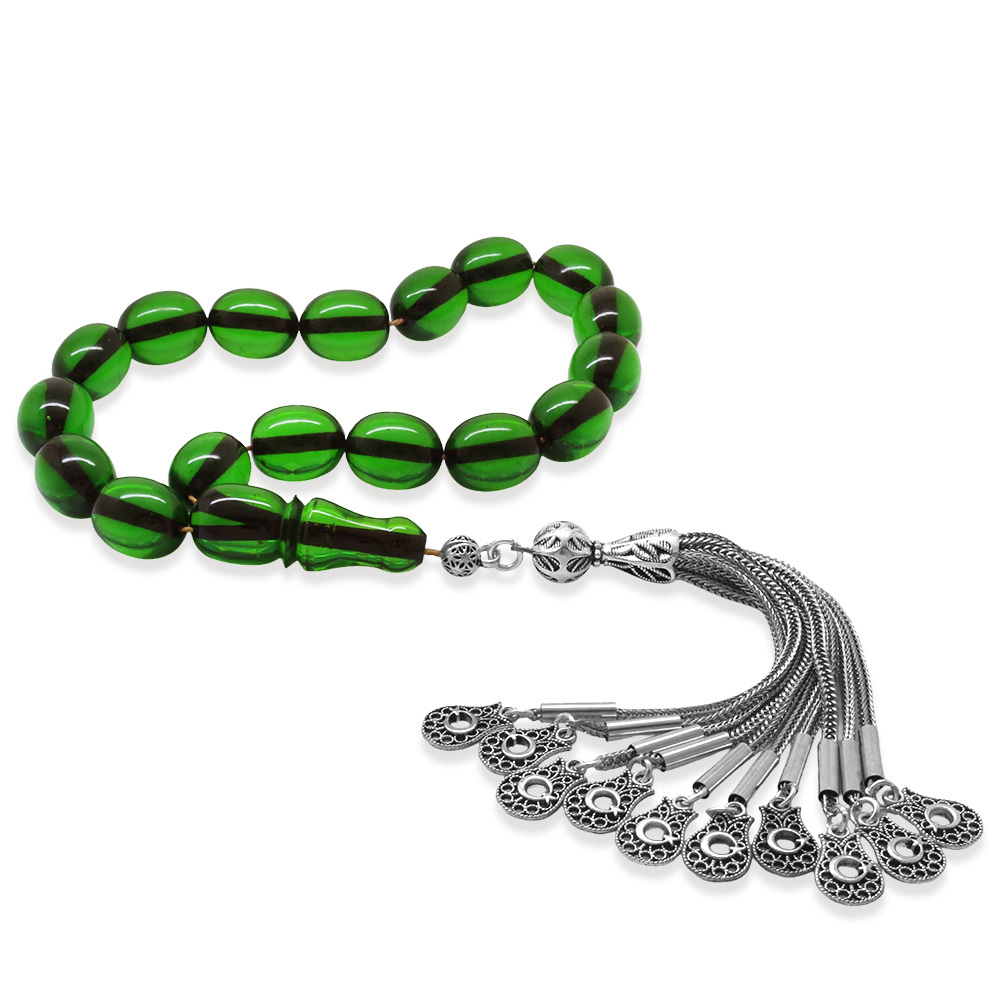 Ateş Kehribar Efe Tesbih - 10 lu Kamçı Kararmaz Metal Püsküllü - Yeşil Renk - Özel Kesim