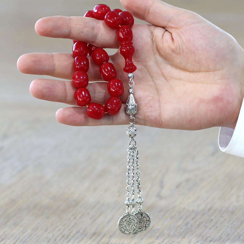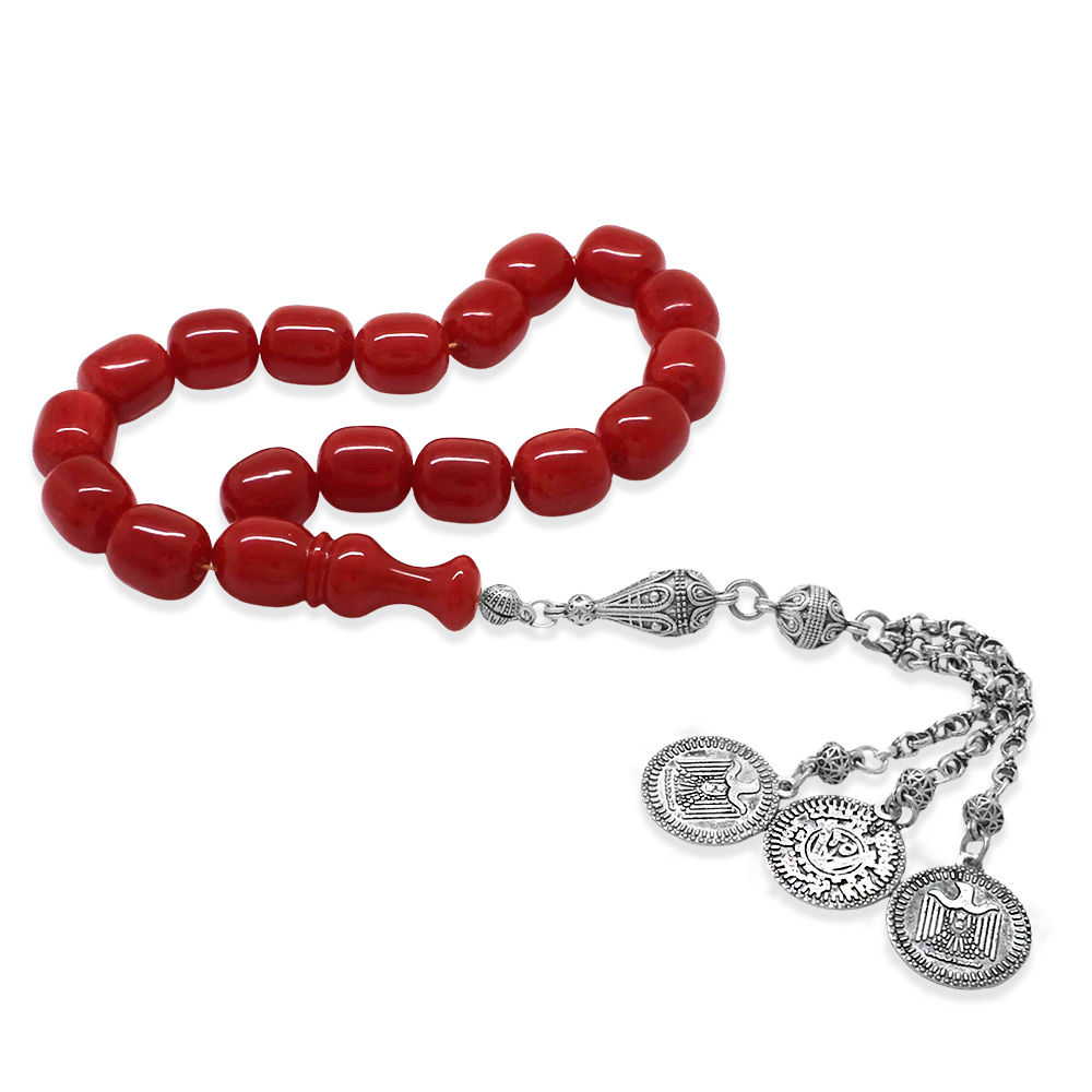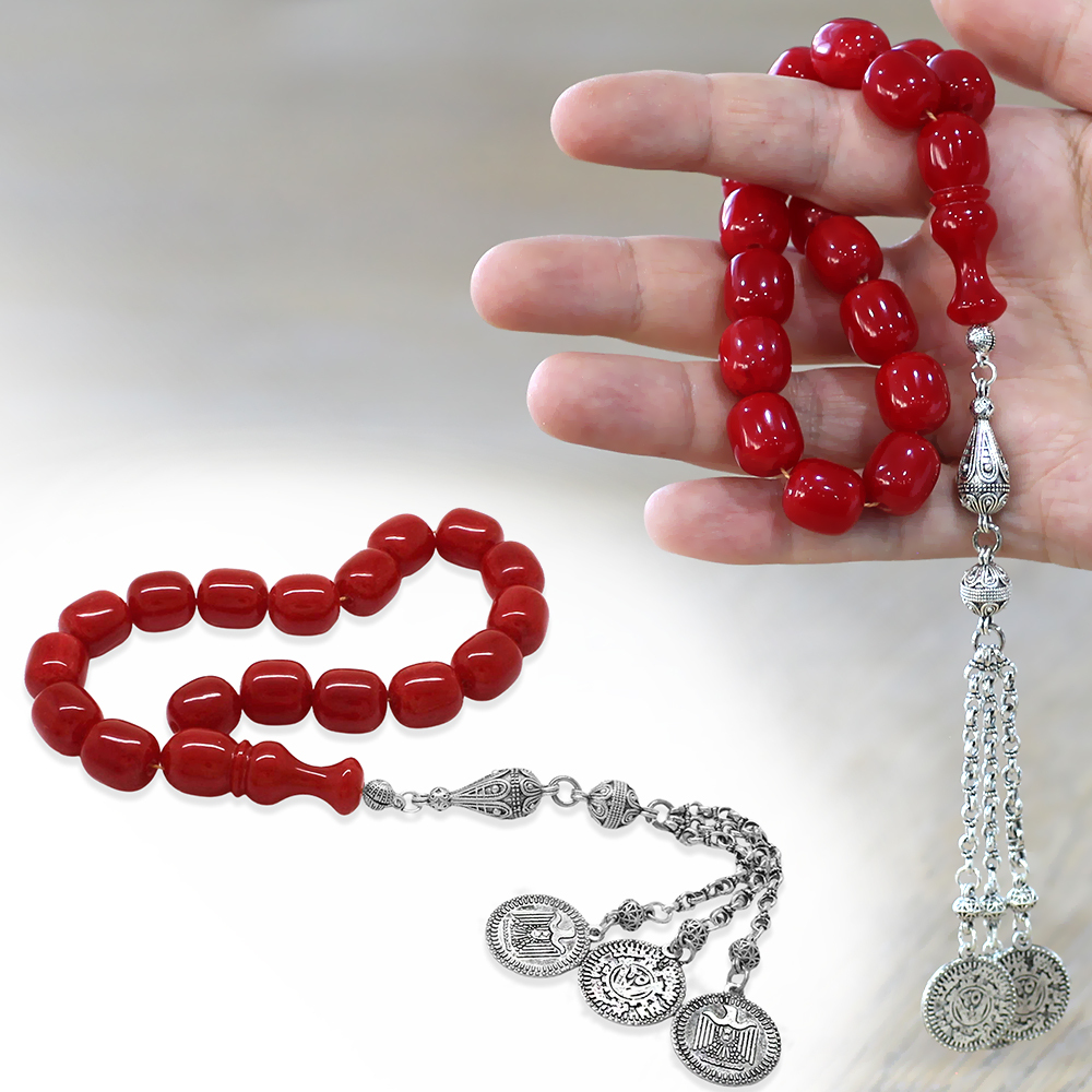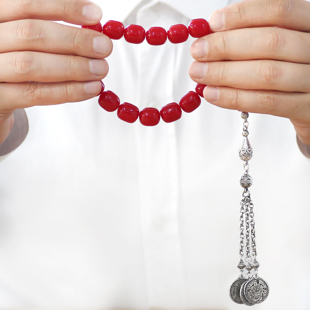 Ateş Kehribar Efe Tesbih - 3 Kamçılı Kararmaz Metal Püsküllü - Kırmızı Renk - Kapsül Kesim