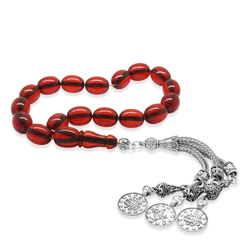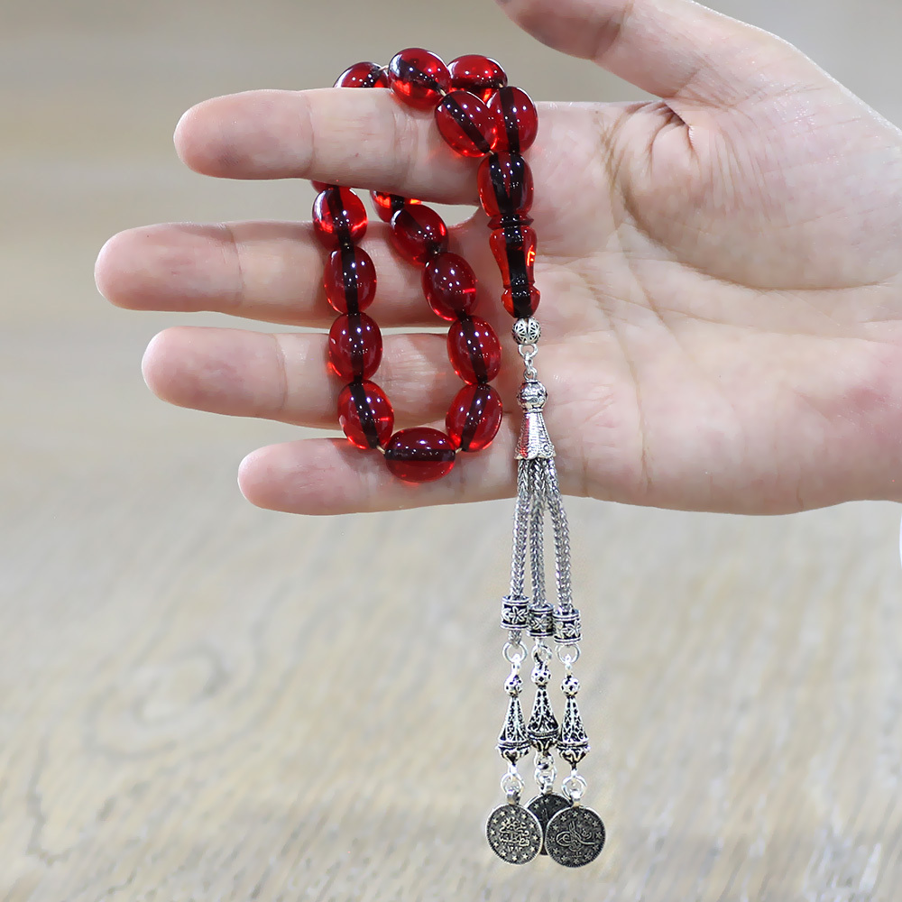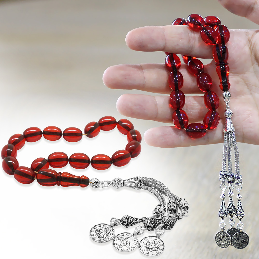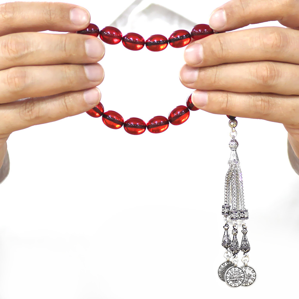 Ateş Kehribar Efe Tesbih - 3 lü Kamçı Kararmaz Metal Püsküllü - Kırmızı Renk - Özel Kesim