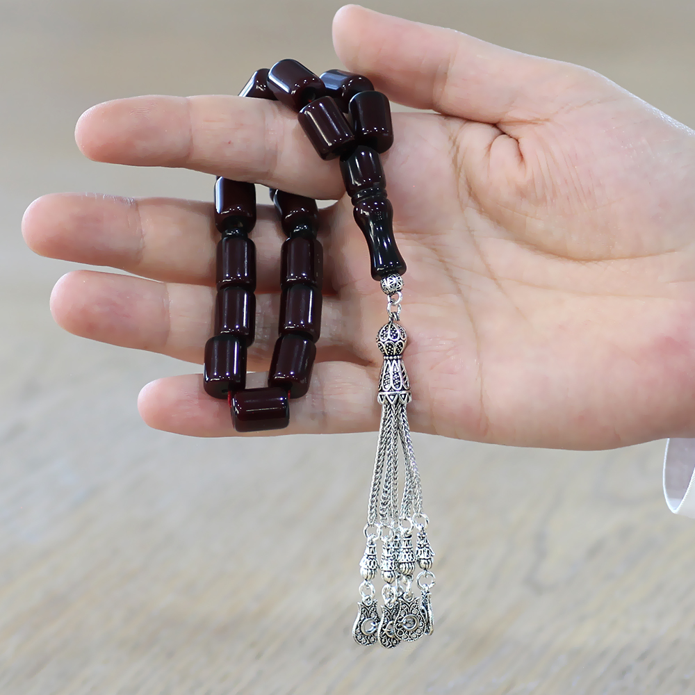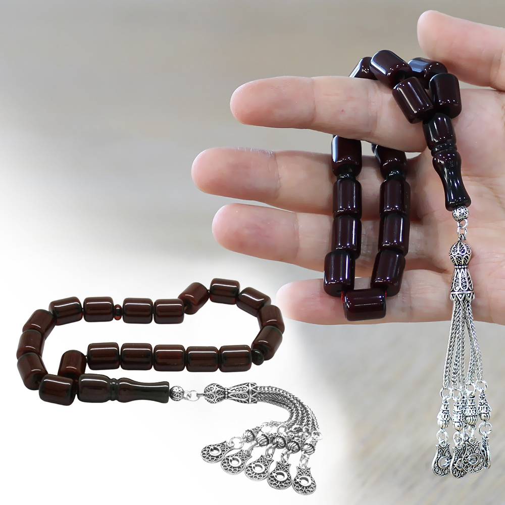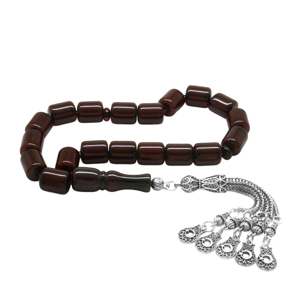Ateş Kehribar Efe Tesbih - 5 Kamçılı Kararmaz Metal Püsküllü - Koyu Kırmızı Renk - Kapsül Kesim