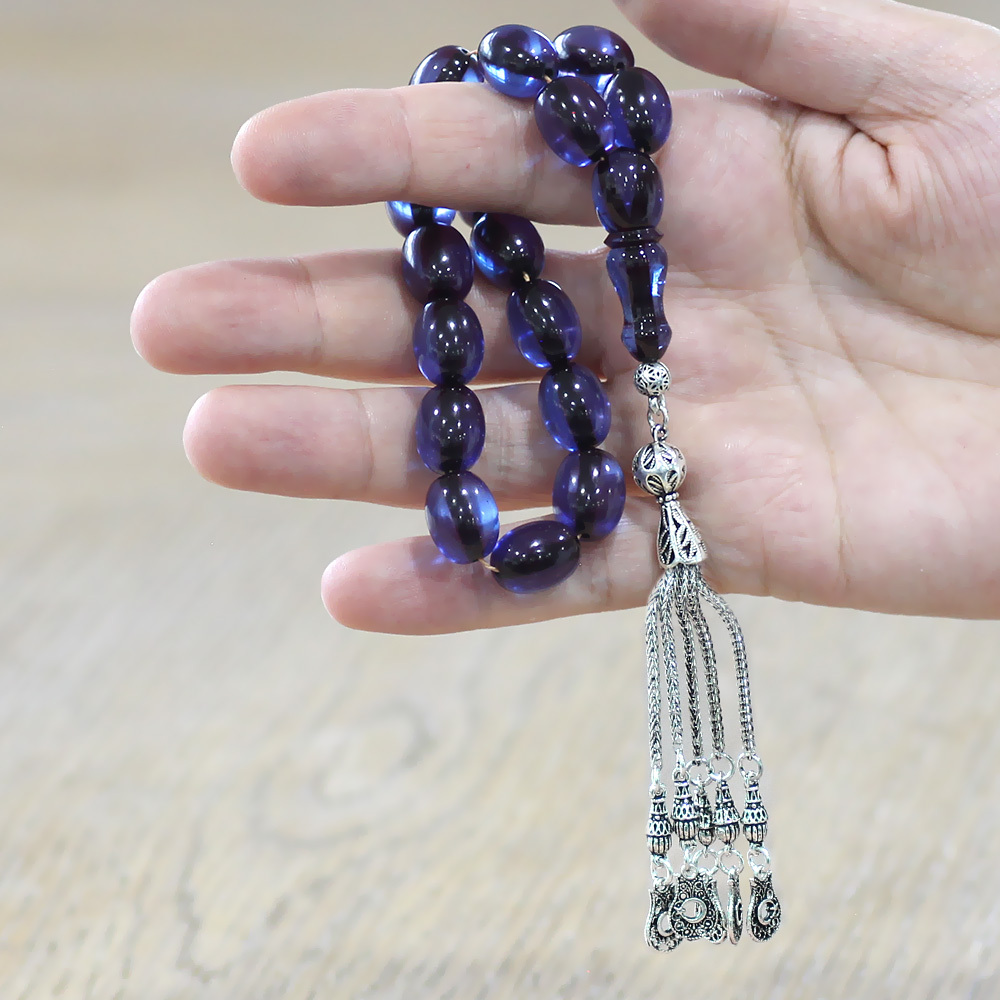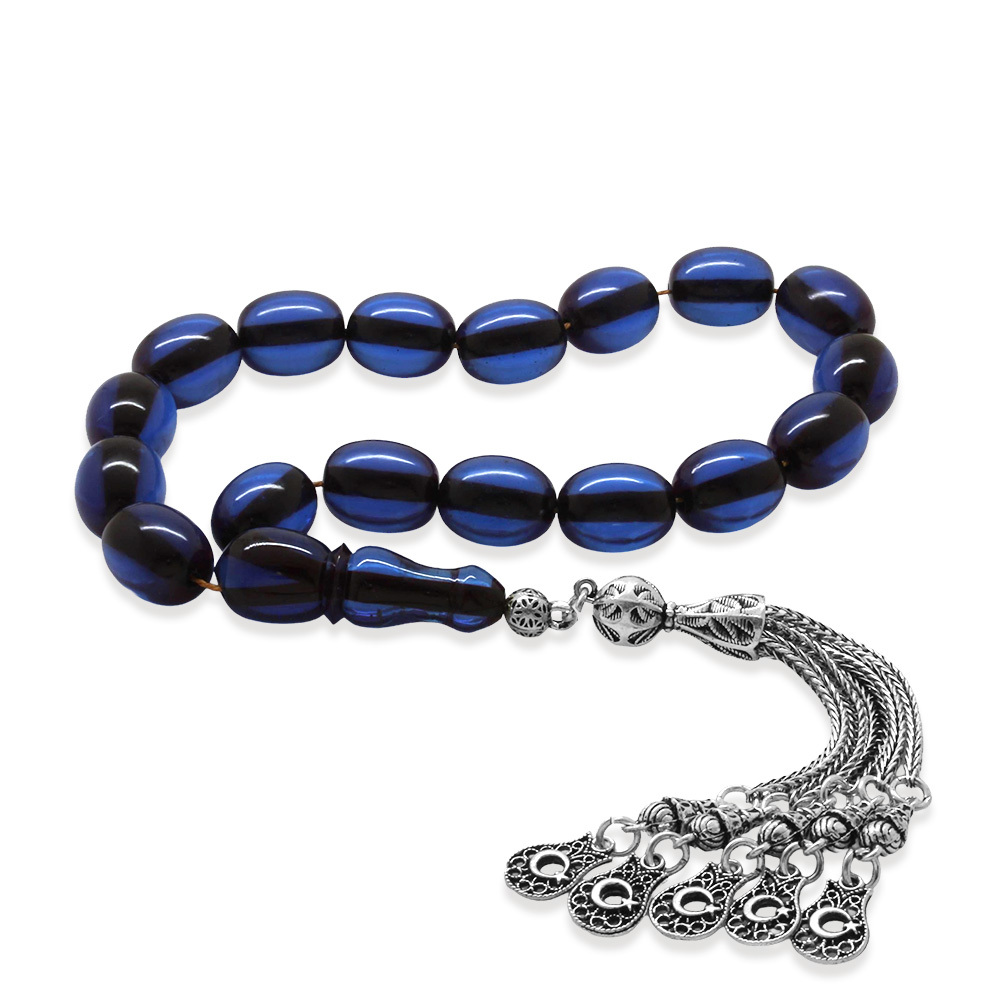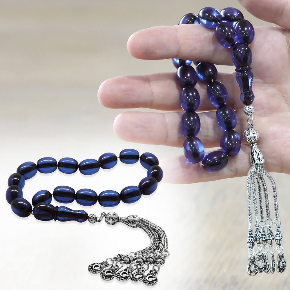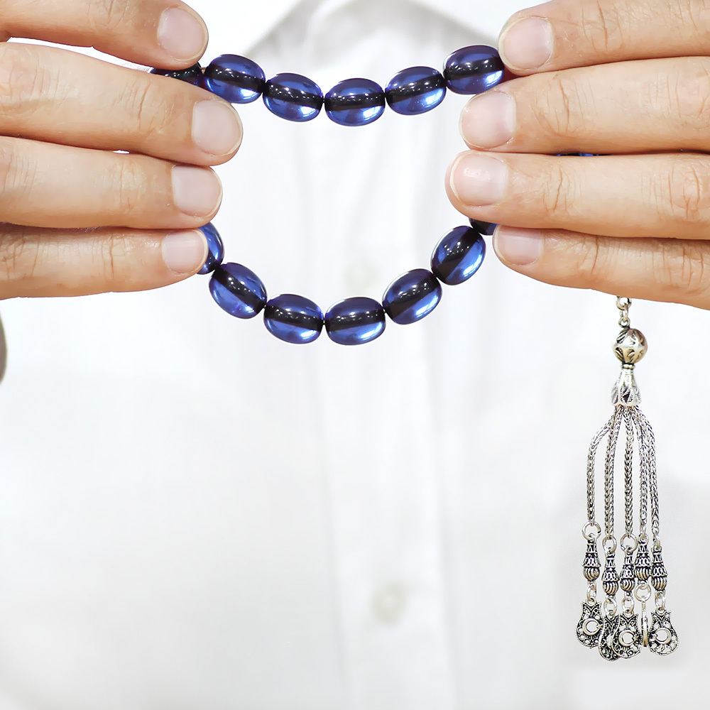 Ateş Kehribar Efe Tesbih - 5 li Kamçı Kararmaz Metal Püsküllü - Lacivert Renk - Özel Kesim