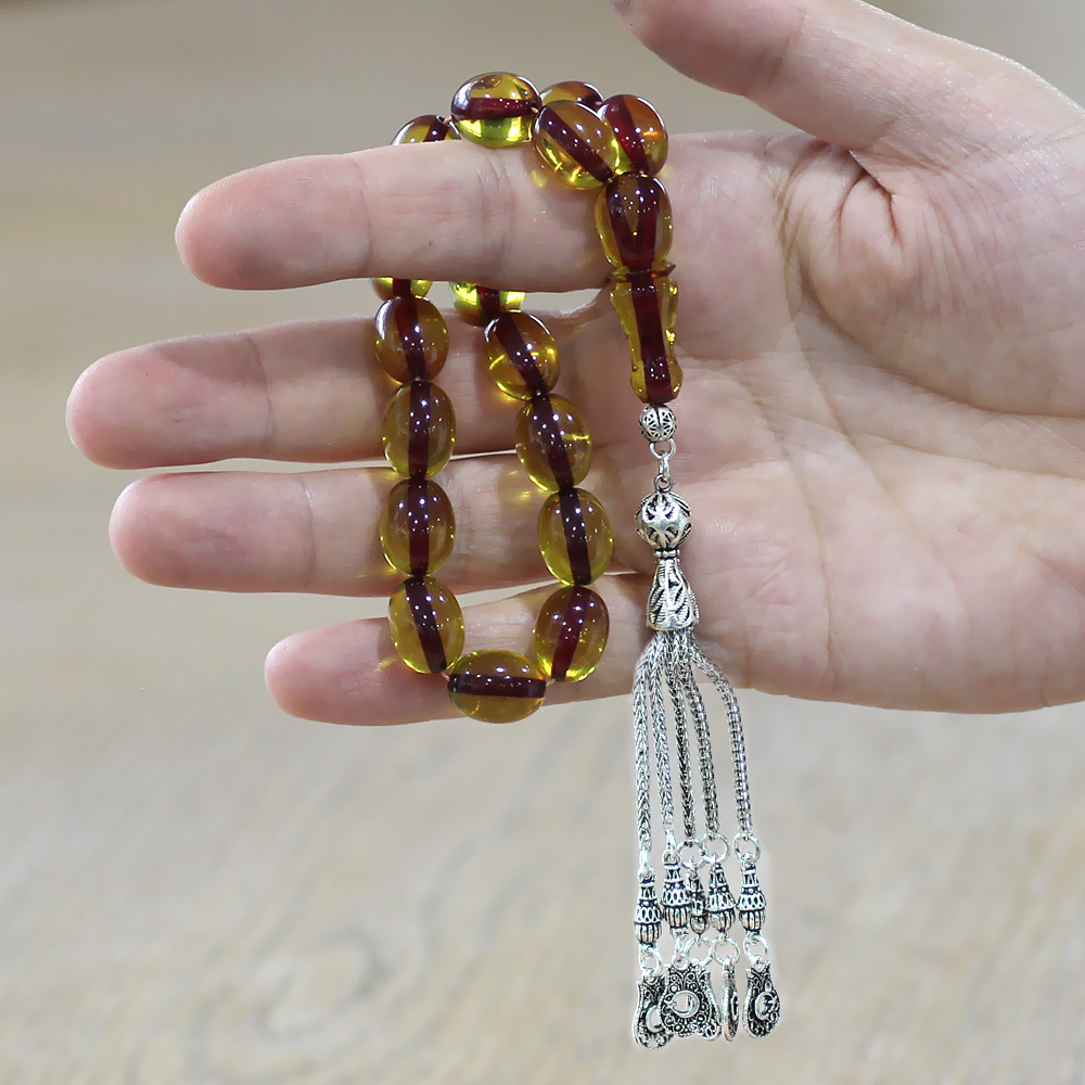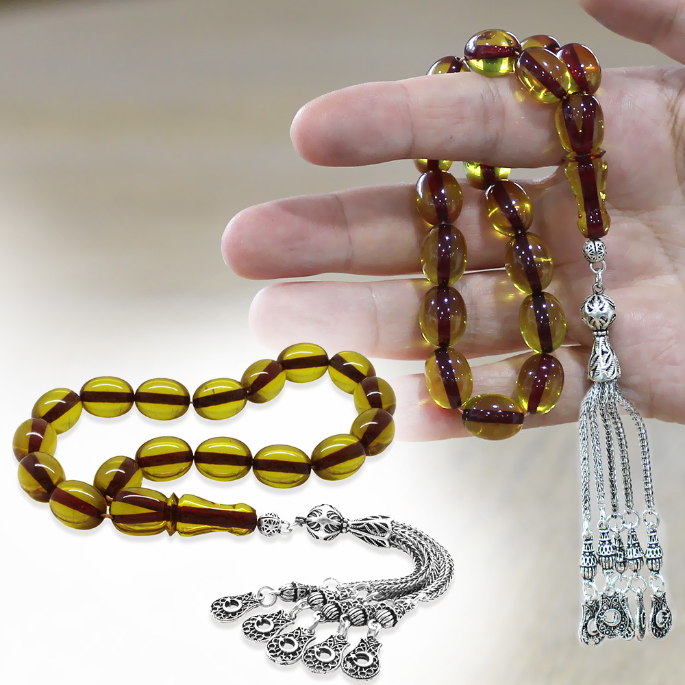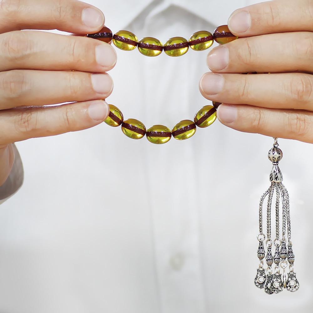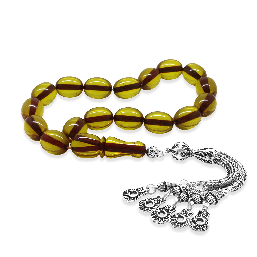 Ateş Kehribar Efe Tesbih - 5 li Kamçı Kararmaz Metal Püsküllü - Sarı Renk - Özel Kesim