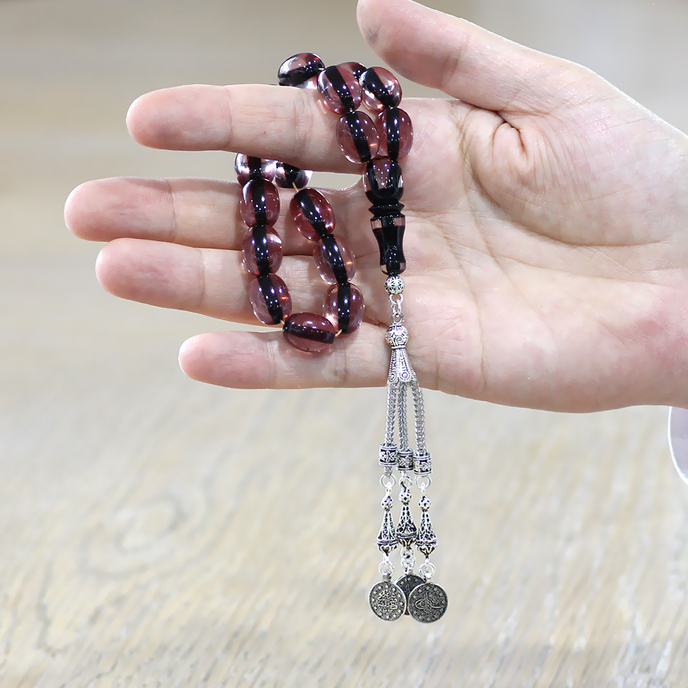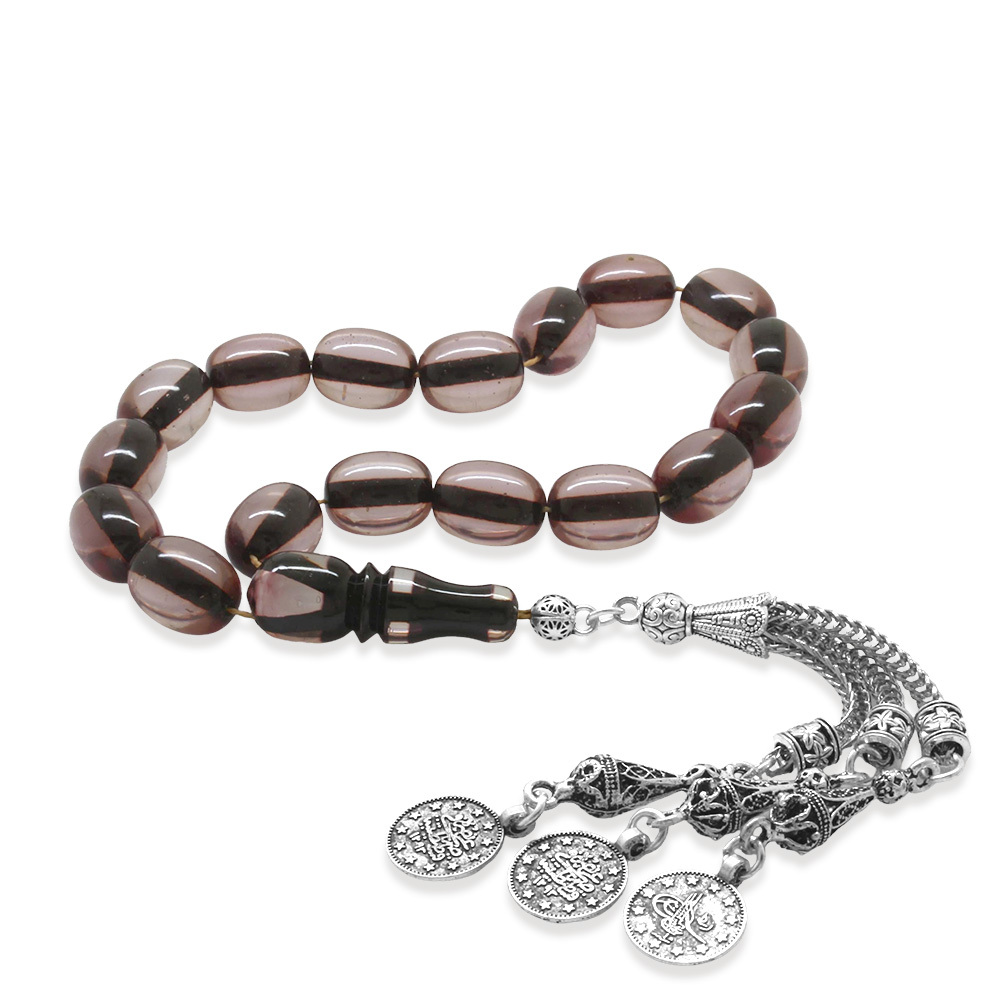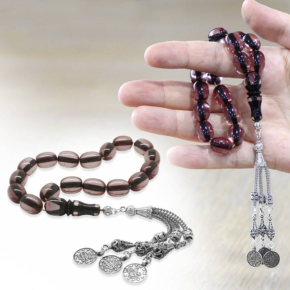 Ateş Kehribar Efe Tesbih - Kararmaz Metal Püsküllü - Çift Renk İmameli - Şeffaf Renk - Özel Kesim