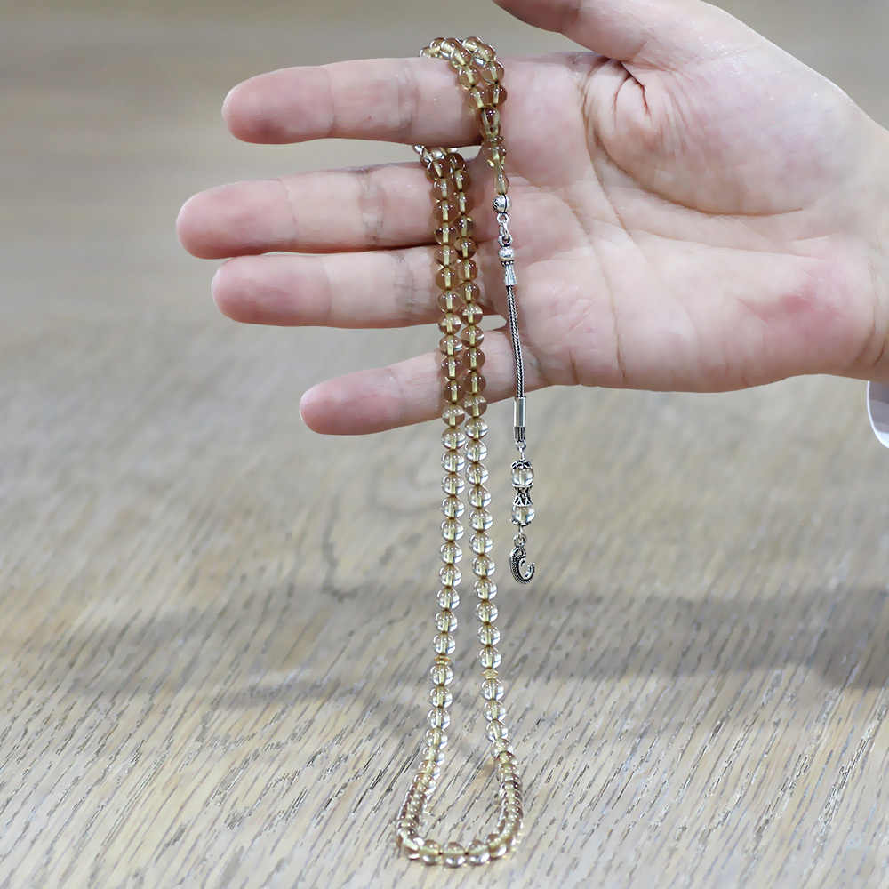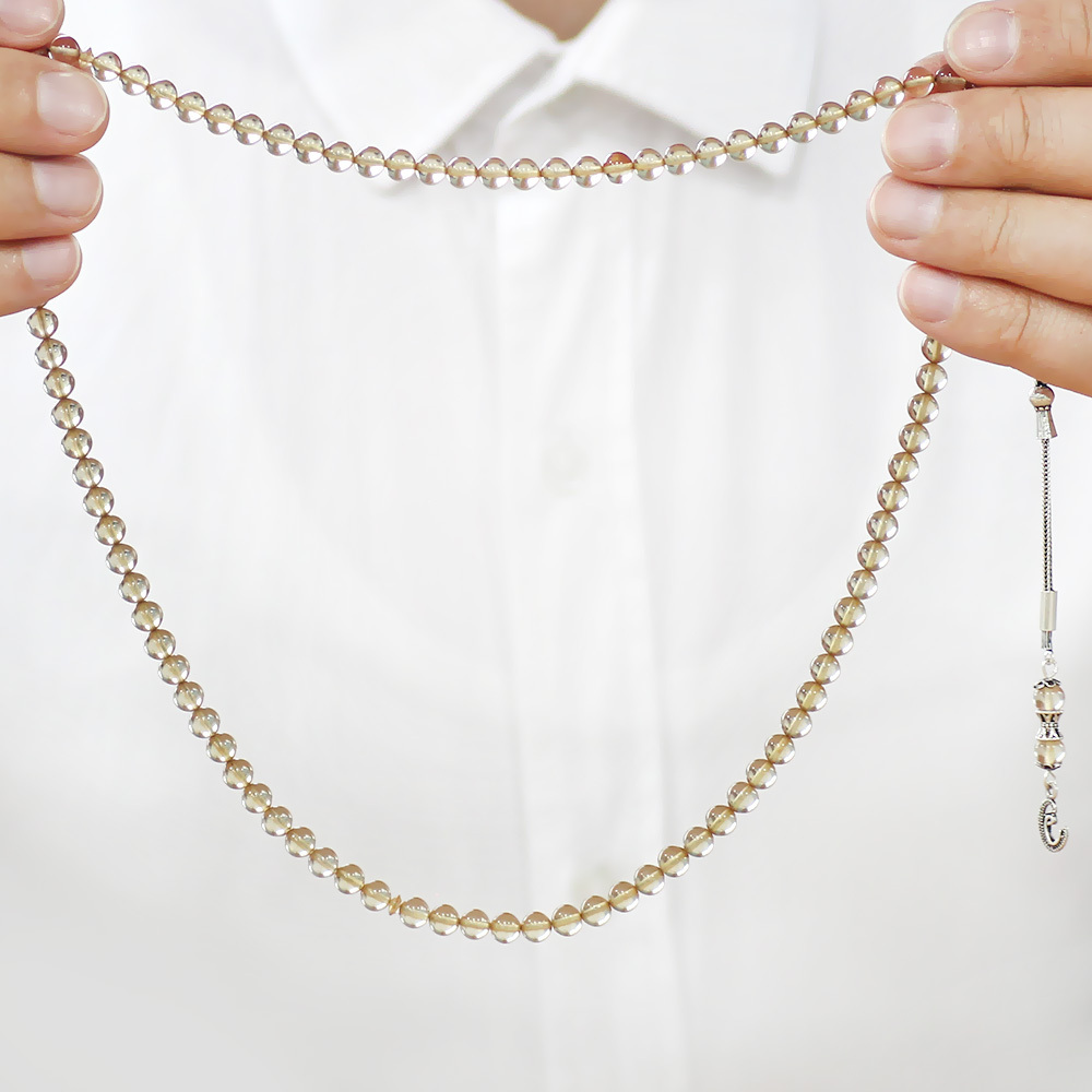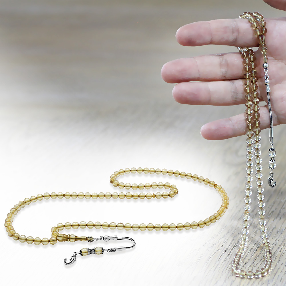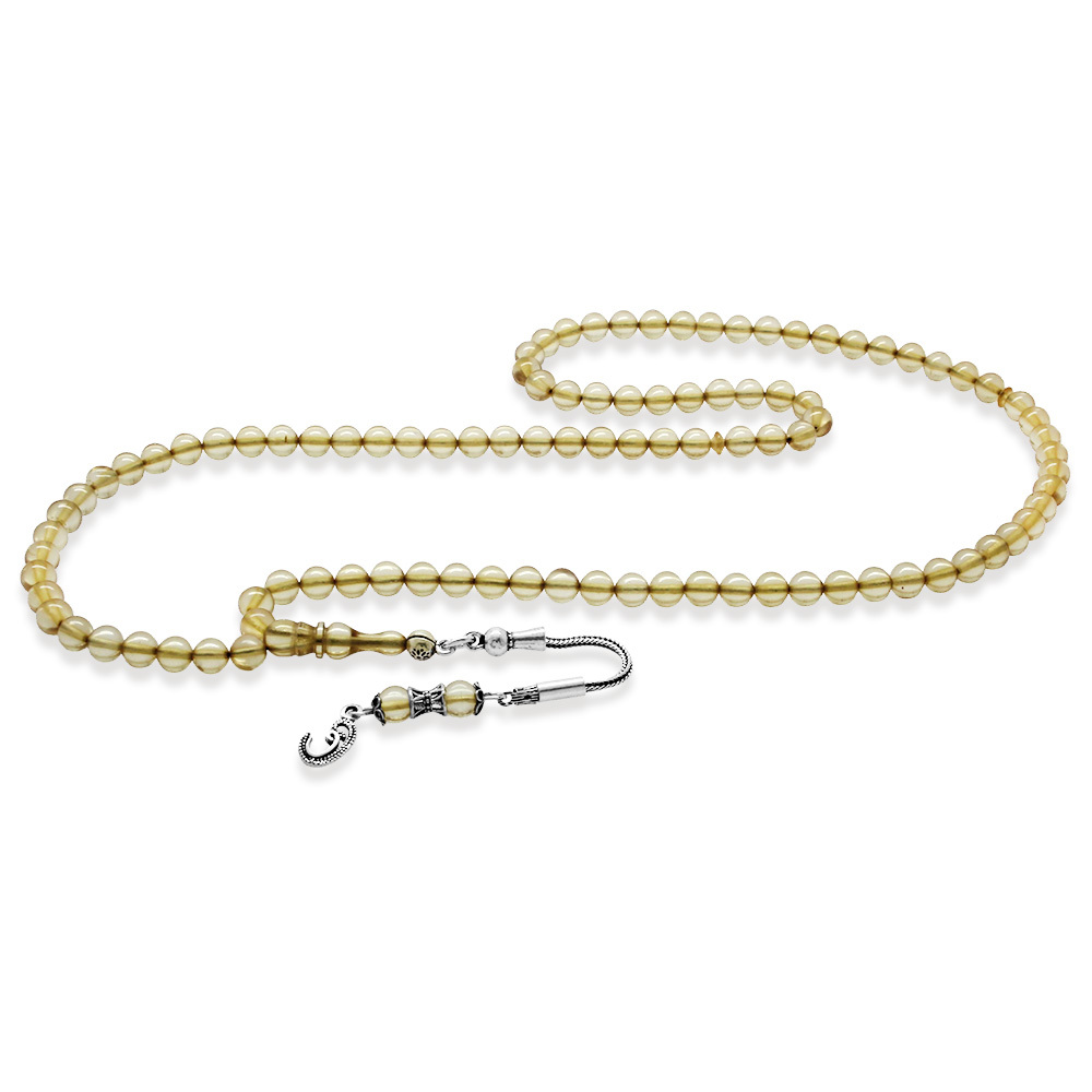 Ateş Kehribar Namaz Tesbihi - 925 Ayar Gümüş Vav Püsküllü - Şeffaf Renk - Küre Kesim