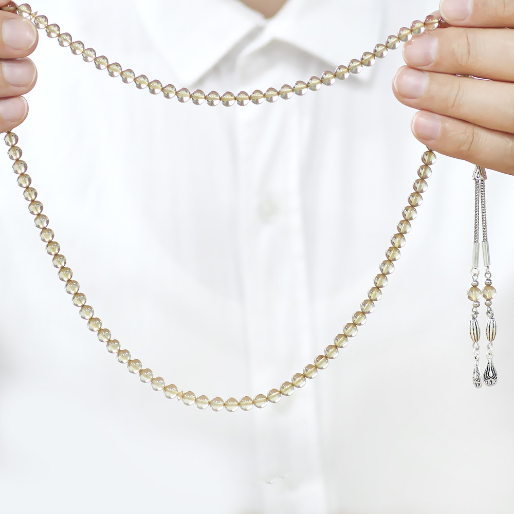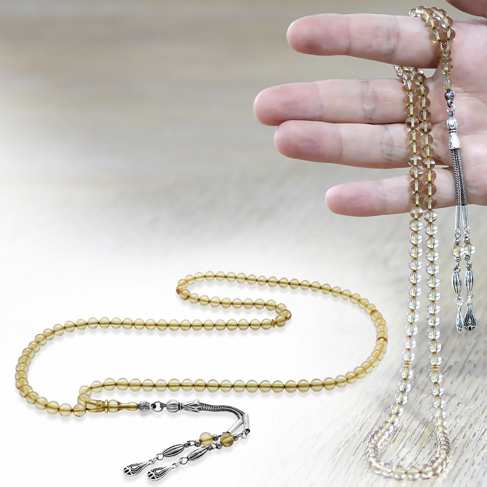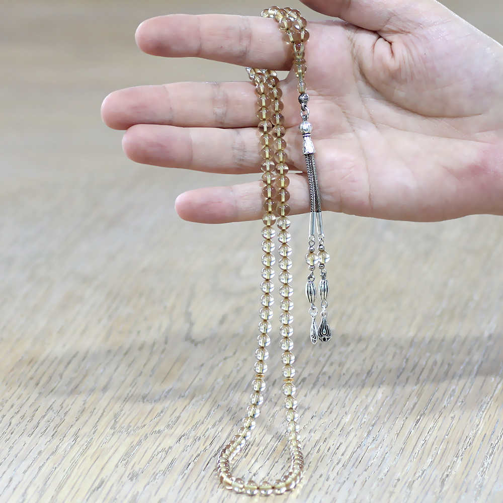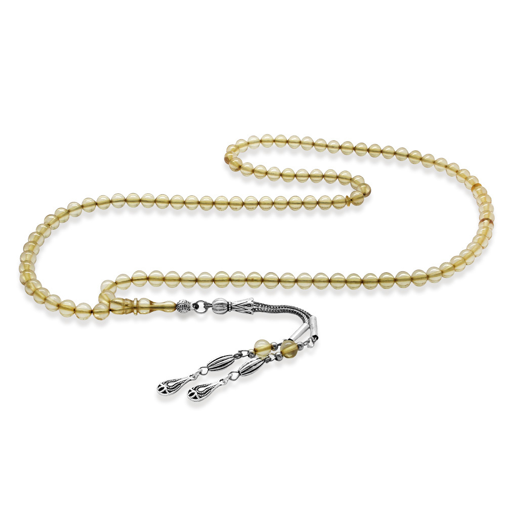 Ateş Kehribar Namaz Tesbihi - Kararmaz Metal Damla Püsküllü - Şeffaf Renk - Küre Kesim