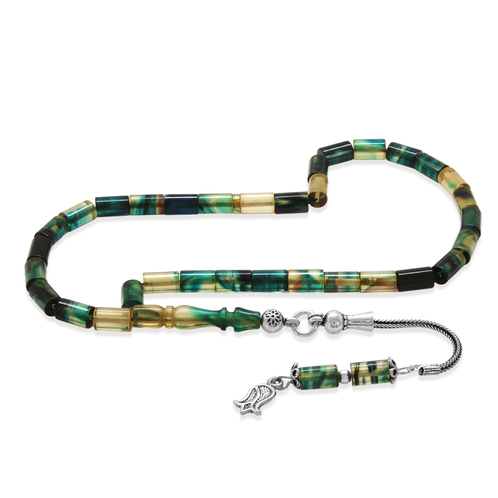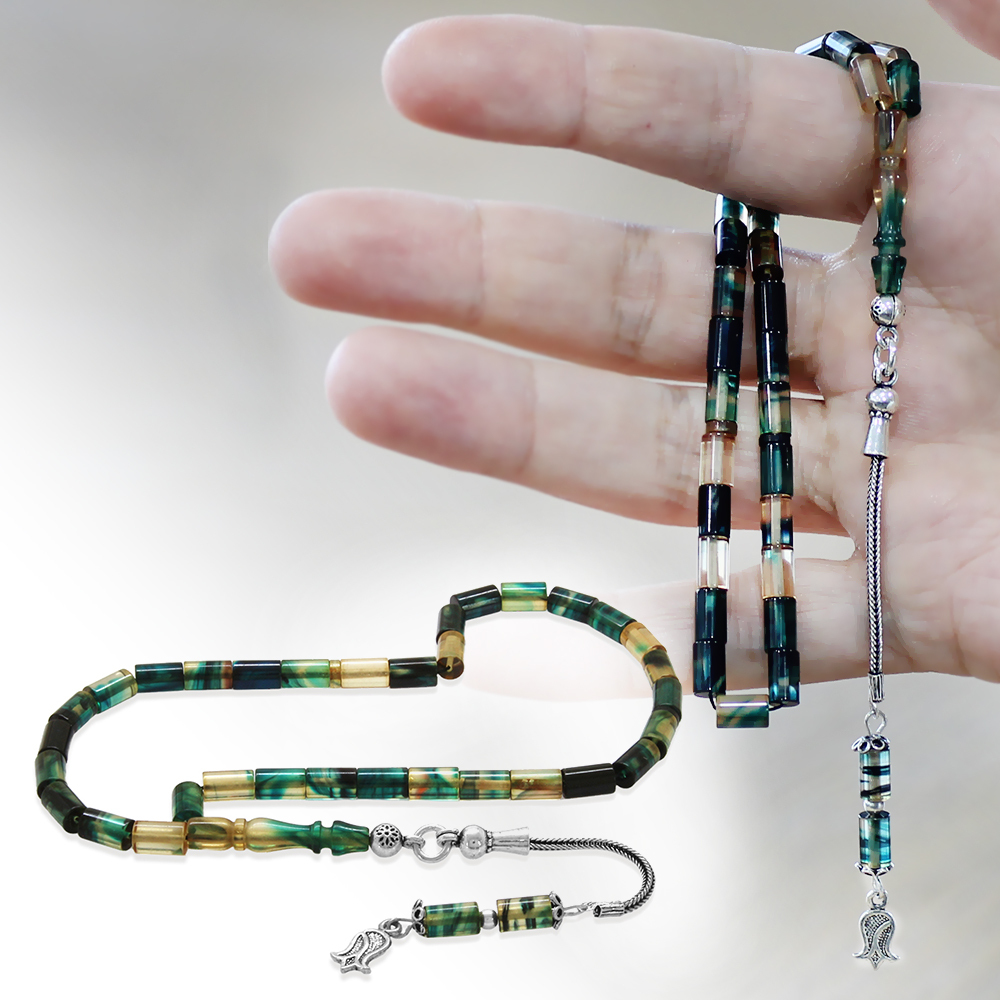 Ateş Kehribar Tesbih - 925 Ayar Gümüş Püsküllü - Mini Boy - Mavi Beyaz Renk - Kesme Kesim
