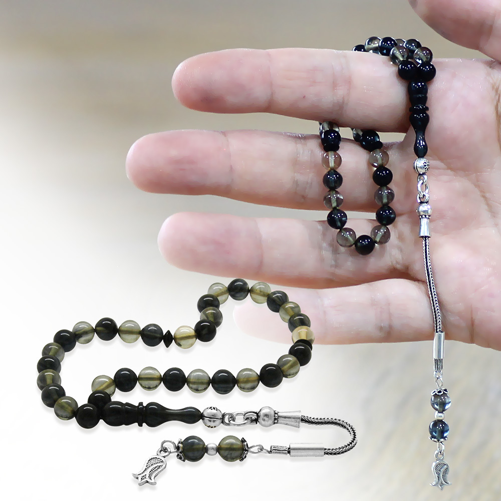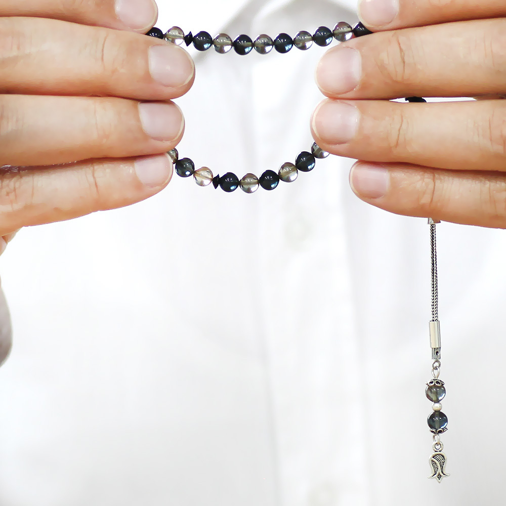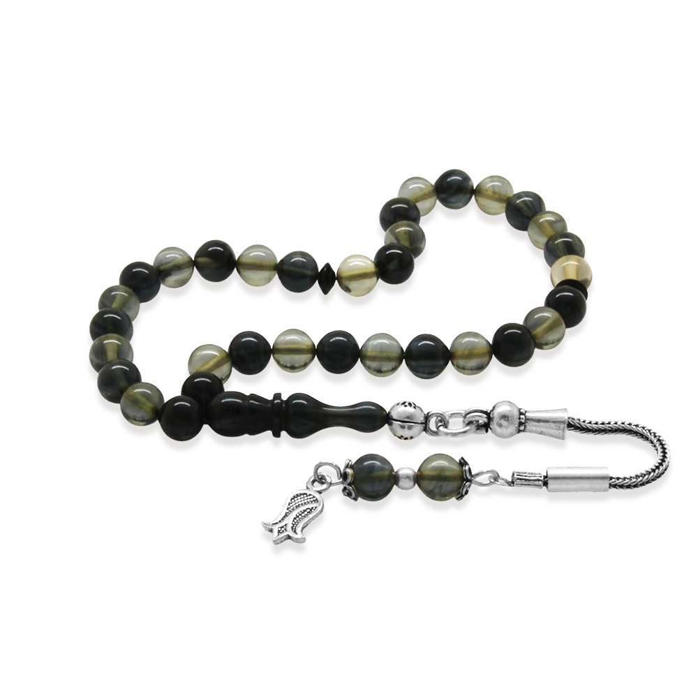 Ateş Kehribar Tesbih - 925 Ayar Gümüş Püsküllü - Bilek Boy - Siyah Beyaz Renk - Küre Kesim