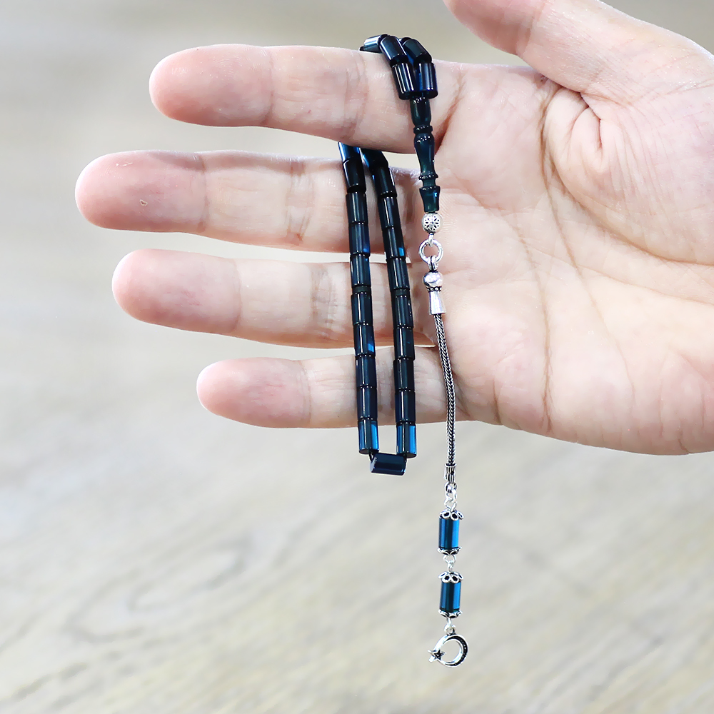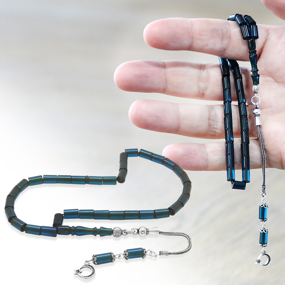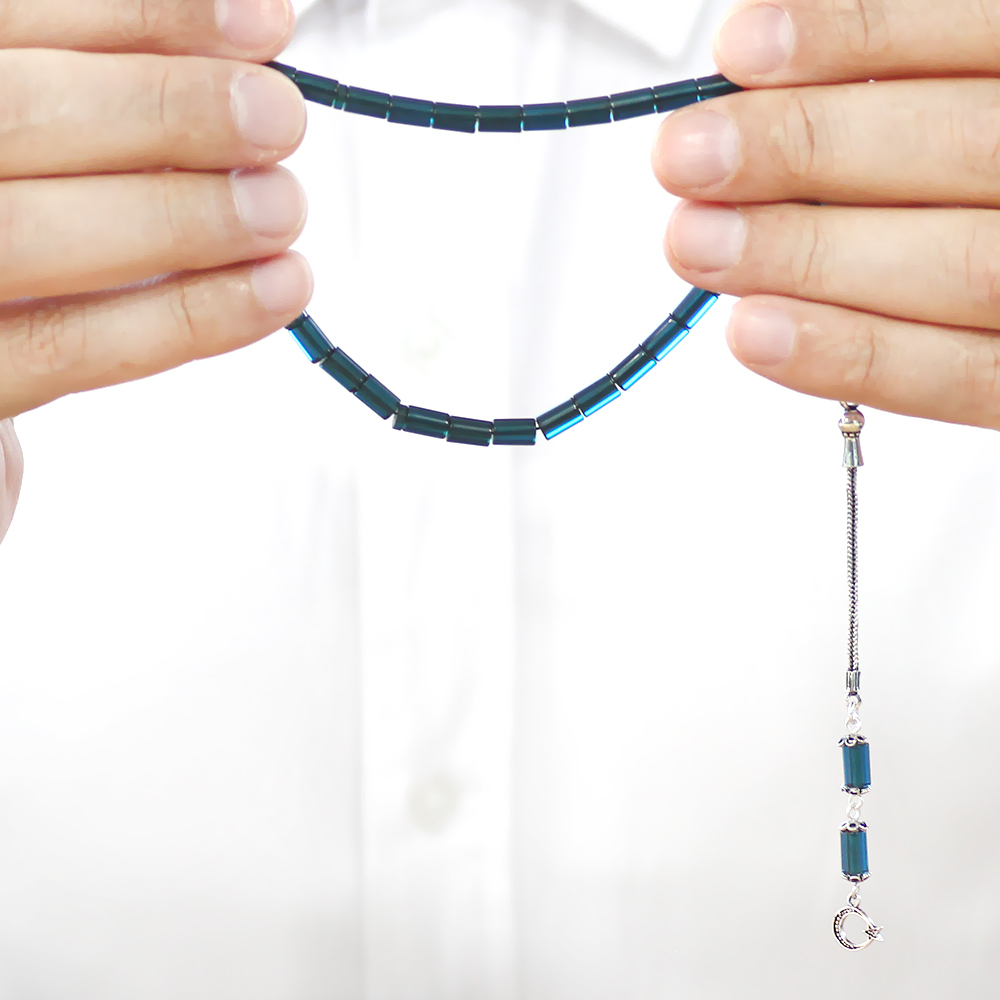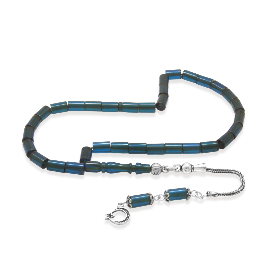 Ateş Kehribar Tesbih - 925 Ayar Gümüş Püsküllü - Mini Boy - Turkuaz - Kesme Kesim