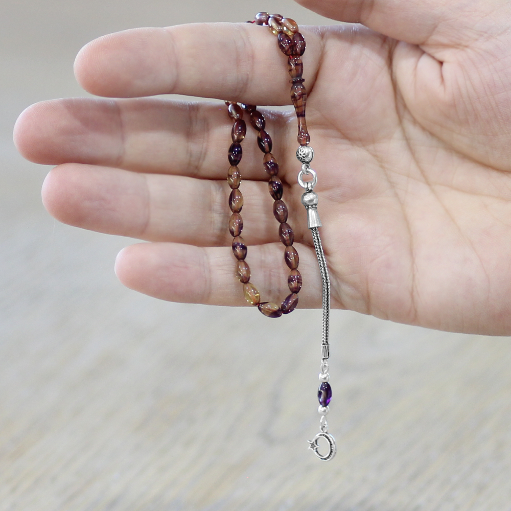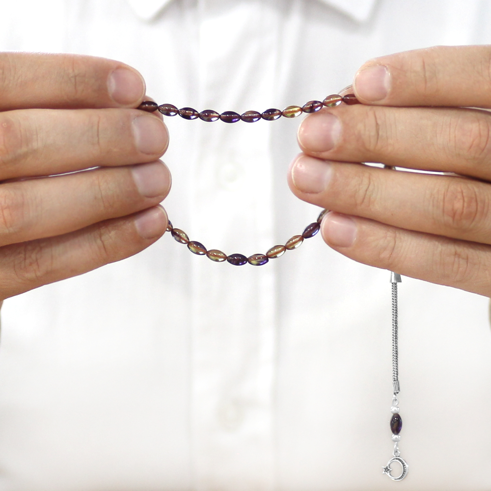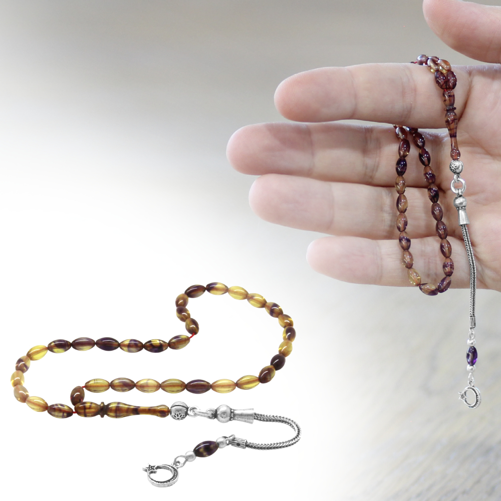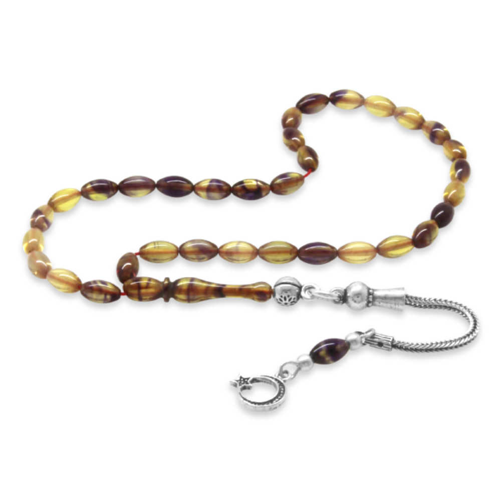 Ateş Kehribar Tesbih - 925 Ayar Gümüş Püsküllü - Mavi Beyaz Renk - Mini Boy - Arpa Kesim